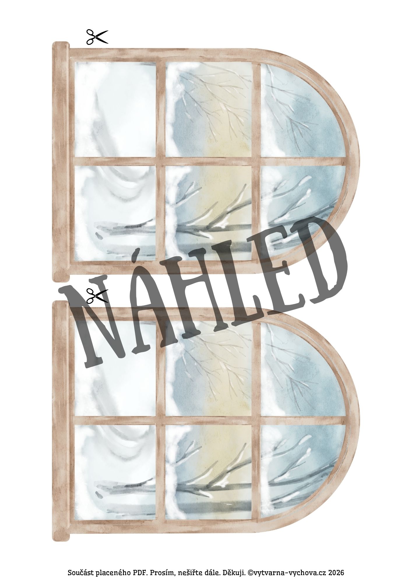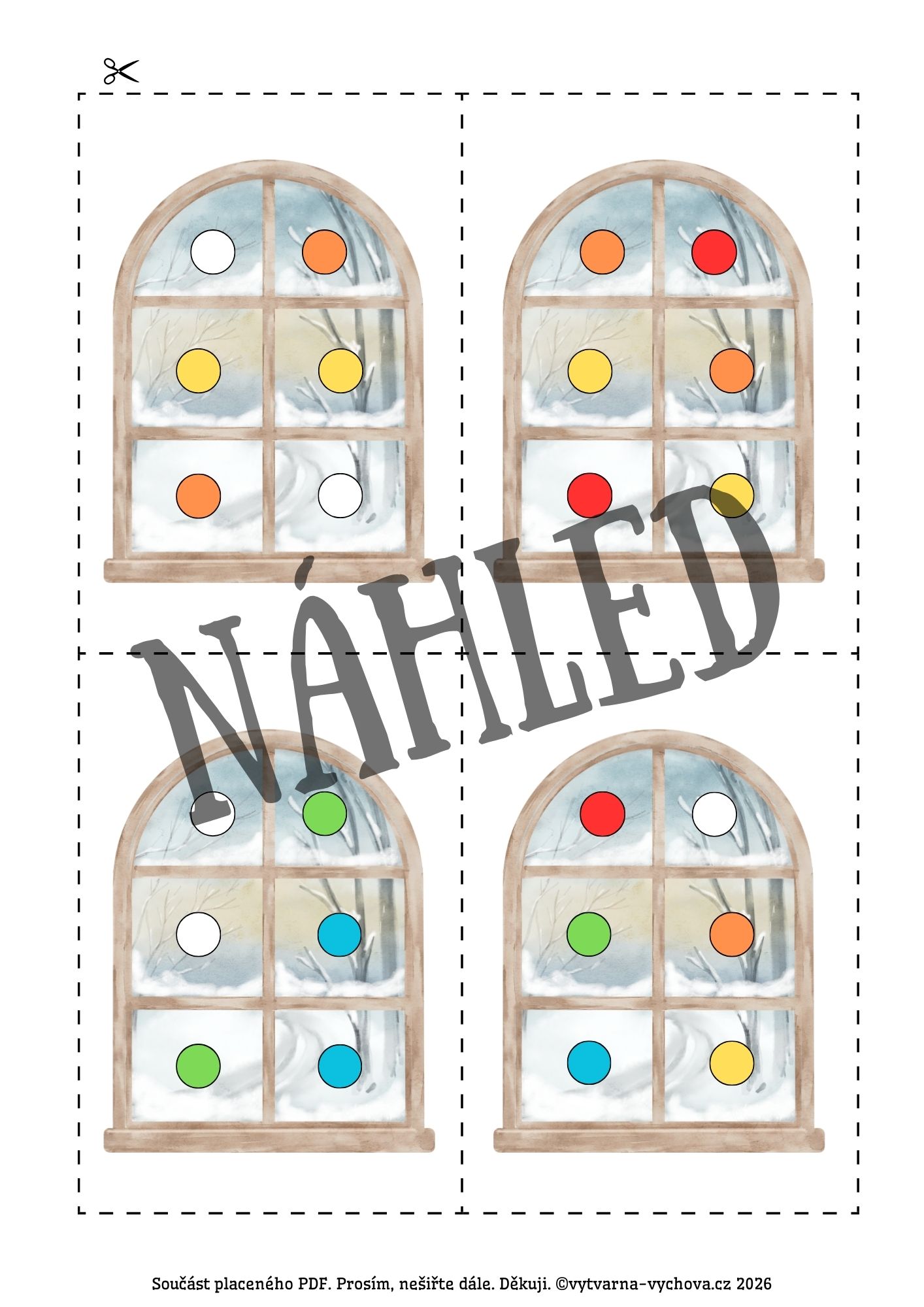 - Stříhání: Vystřihněte 6 velkých oken, 24 malých karet a 72 kulatých vloček.