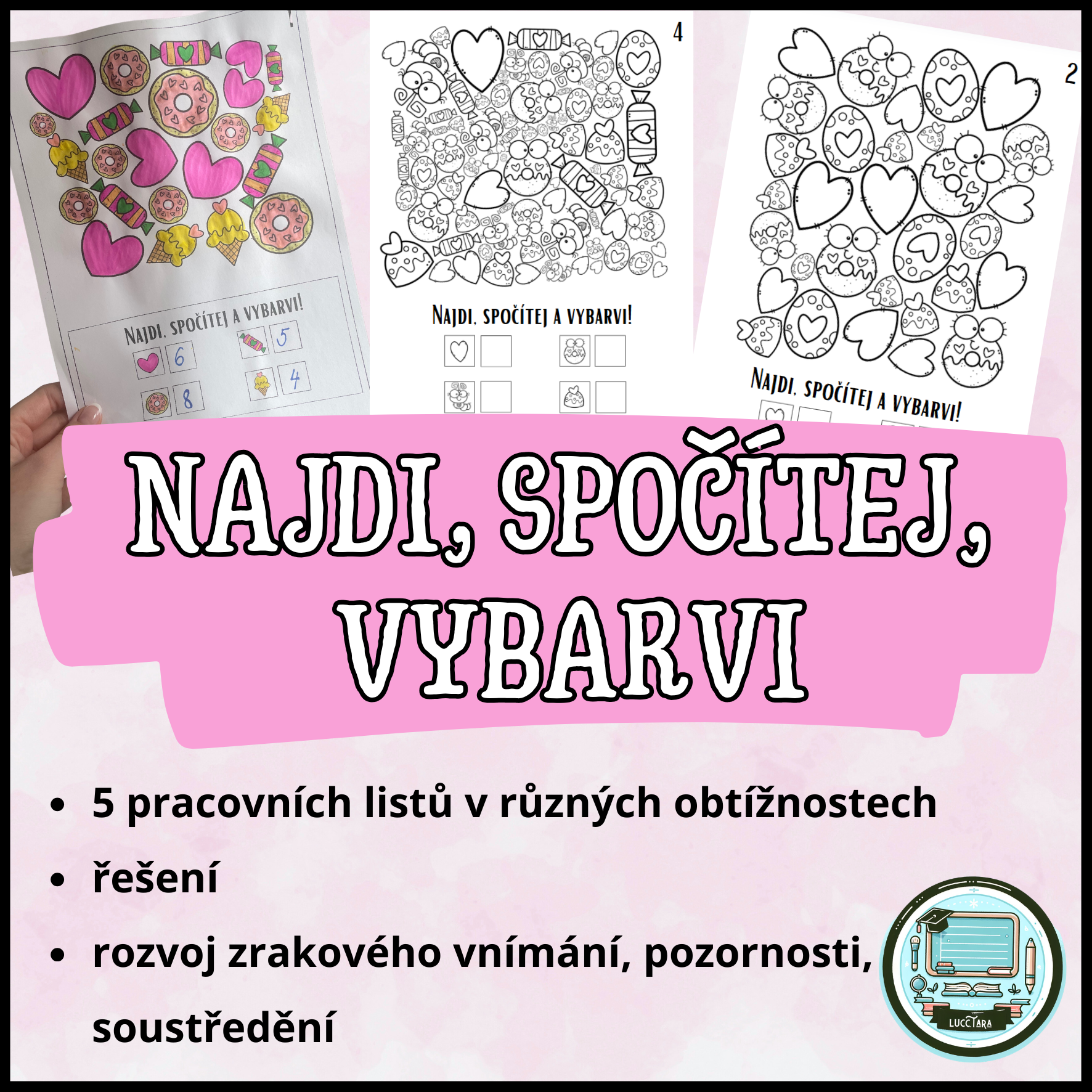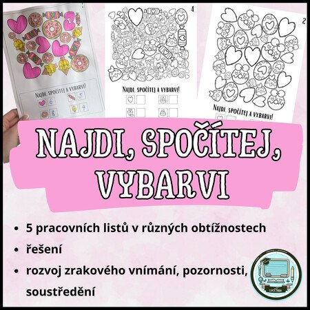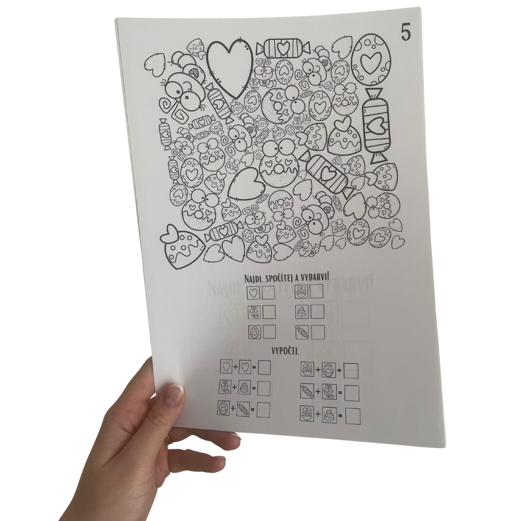 Co mají děti za úkol? Najít v obrázku dané motivy, spočítat jejich počet, zapsat číslo do rámečku a nakonec obrázek vybarvit podle vlastní fantazie.