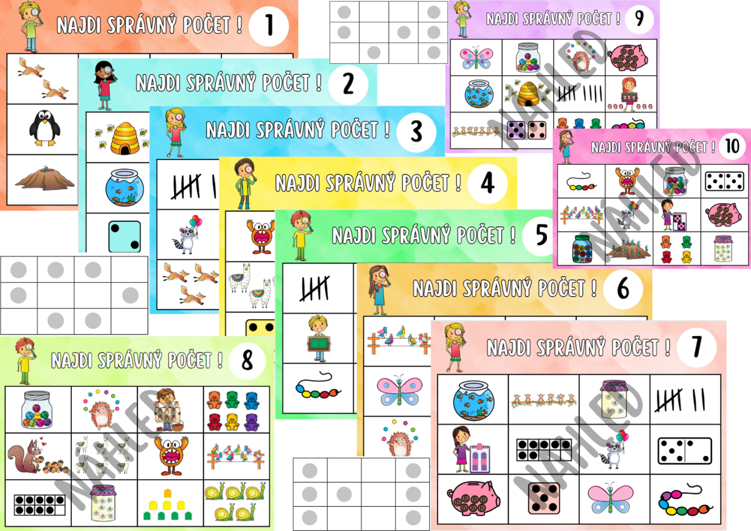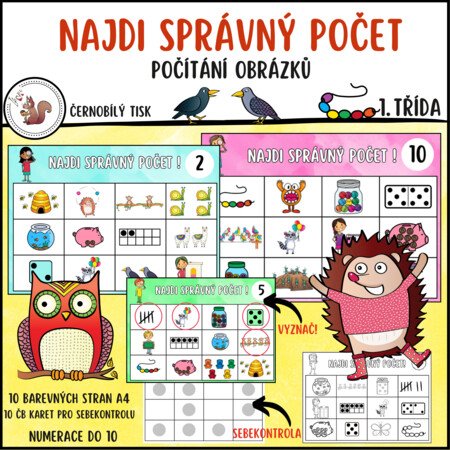 Žáci kroužkují takový obrázek, který svým počtem odpovídá číslici uvedené v horním rohu stránky. Správný počet žáci doplňují stíratelným fixem.