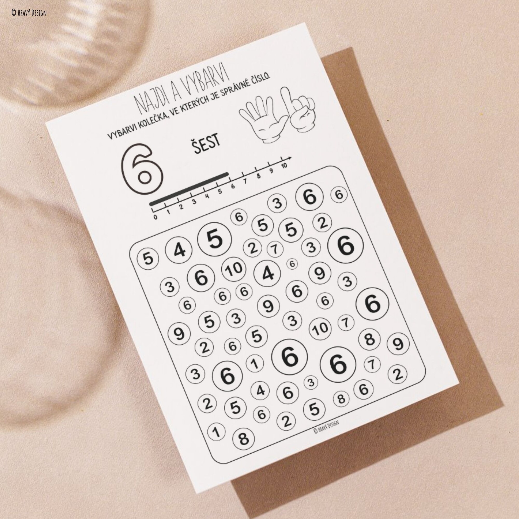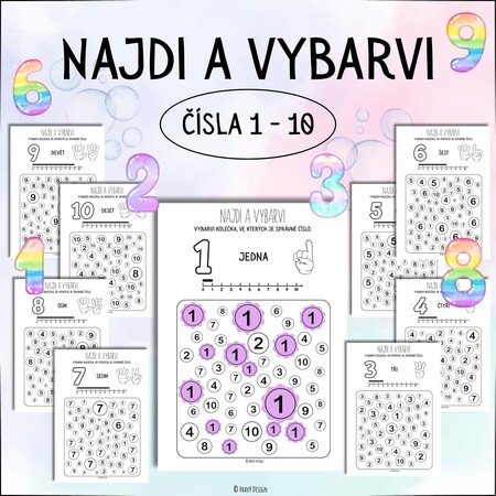 Úkolem je vyhledat správné číslo a vybarvit kolečka, ve kterých se nachází. Materiál je vhodný pro děti předškolního věku, ale také pro první třídu jako jednoduché opakovací cvičení.