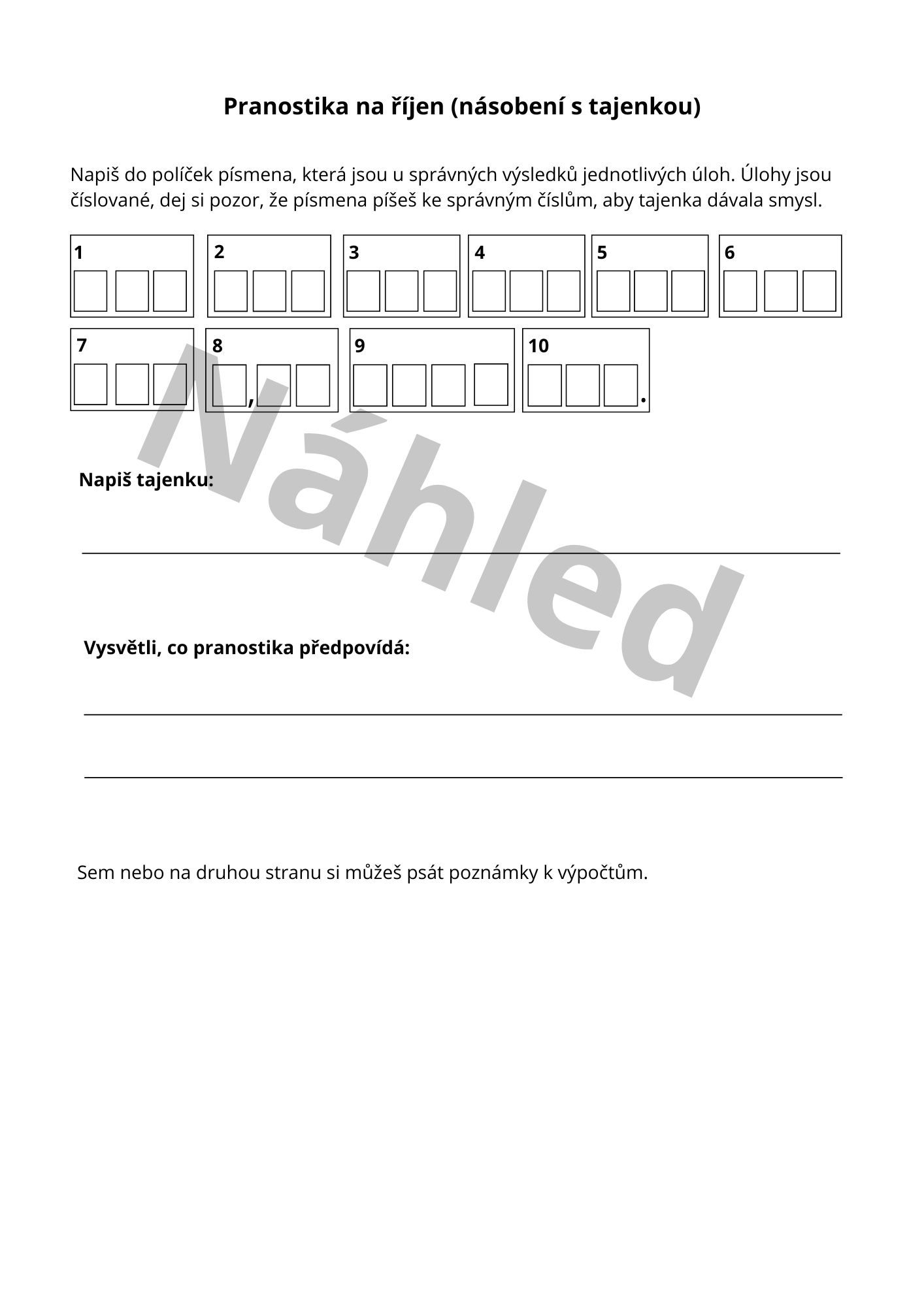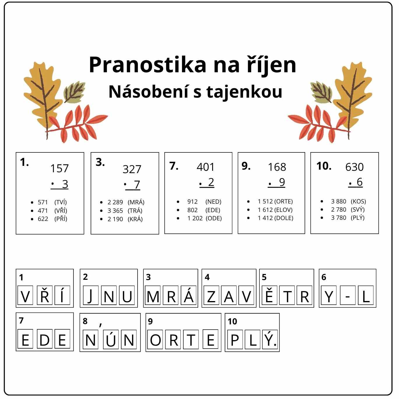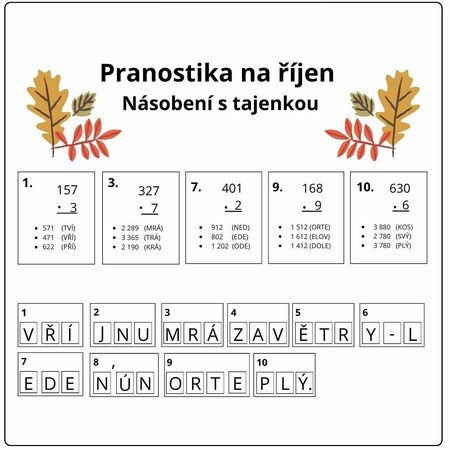 Aktivita je zaměřená na písemné násobení jednociferným číslem. Žáci mají za úkol počítáním vyřešit tajenku, kterou je podzimní pranostika: V říjnu mrazy a větry - únor bude teplý.