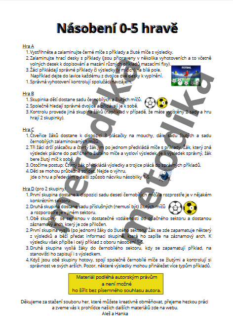 Soubor obsahuje: Metodiku a 4 hry pro skupiny i jednotlivce na téma fotbal s využitím "běhačky" i plácačky na mouchy.
