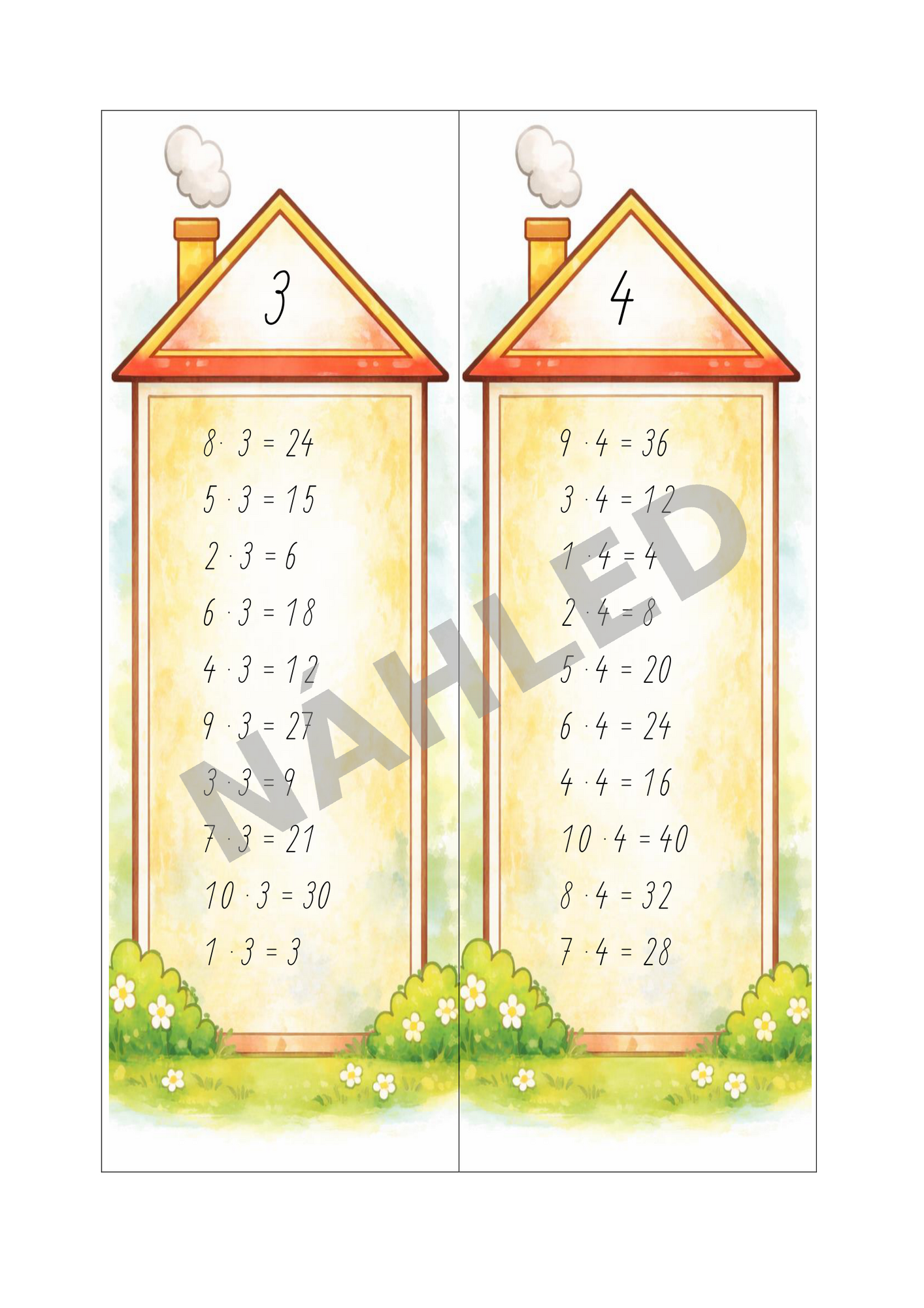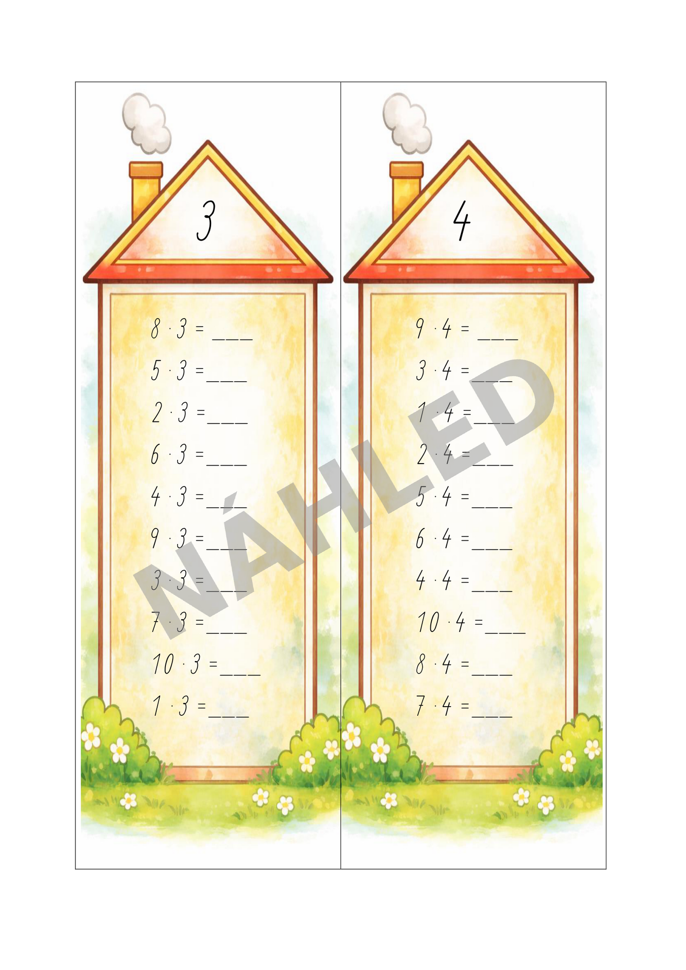 Soubor obsahuje 14 kartiček, na každé z nich je 10 příkladů na násobení. Prvních deset kartiček je zaměřeno vždy na jednu násobkovou řadu, poslední čtyři kartičky obsahují násobilku pomíchanou a slouží k ověření, zda děti zvládají příklady bez opory o jednu řadu.