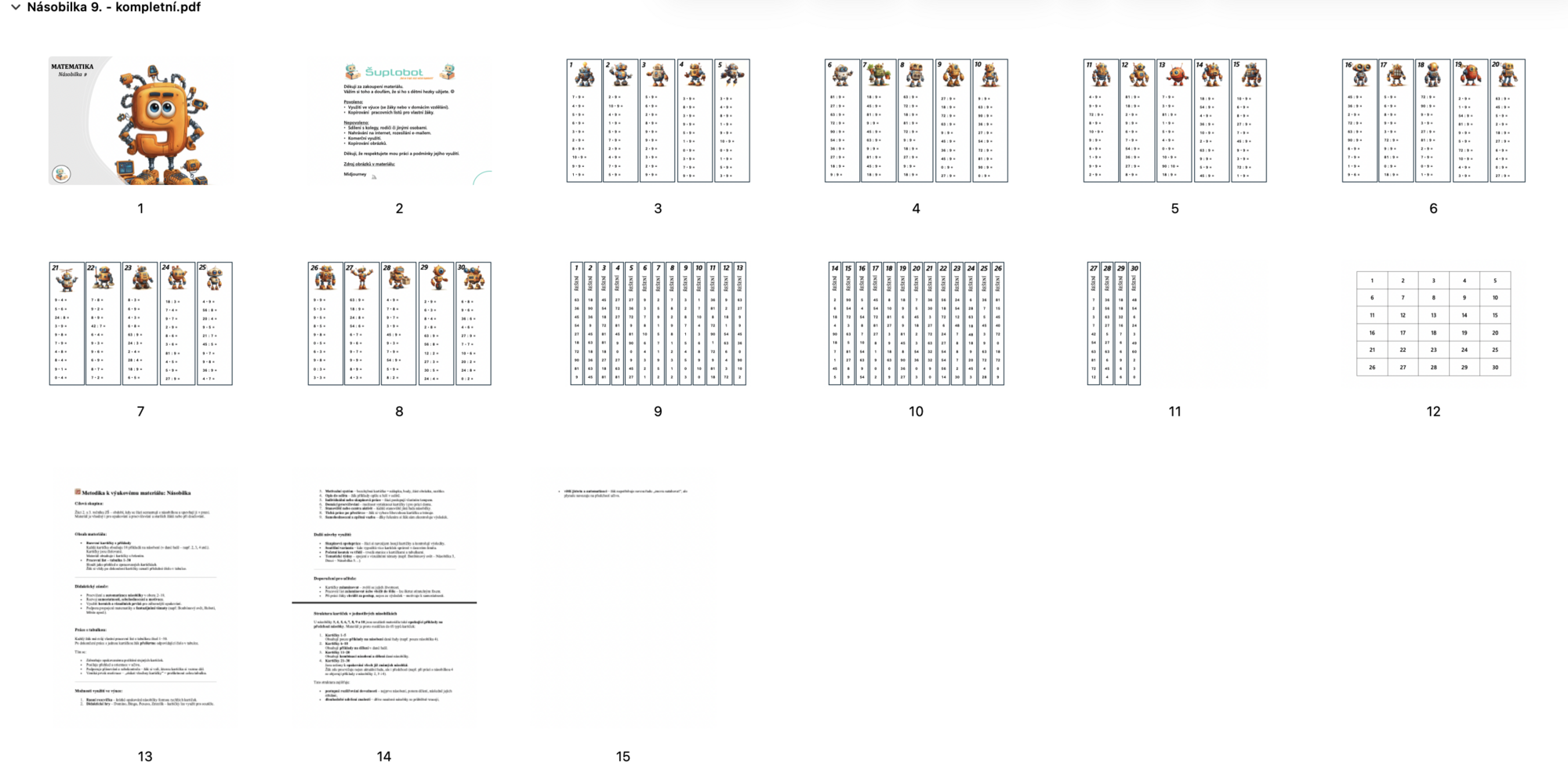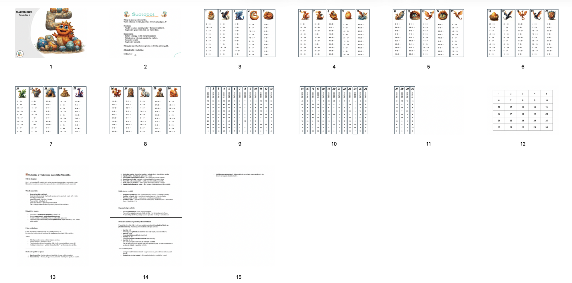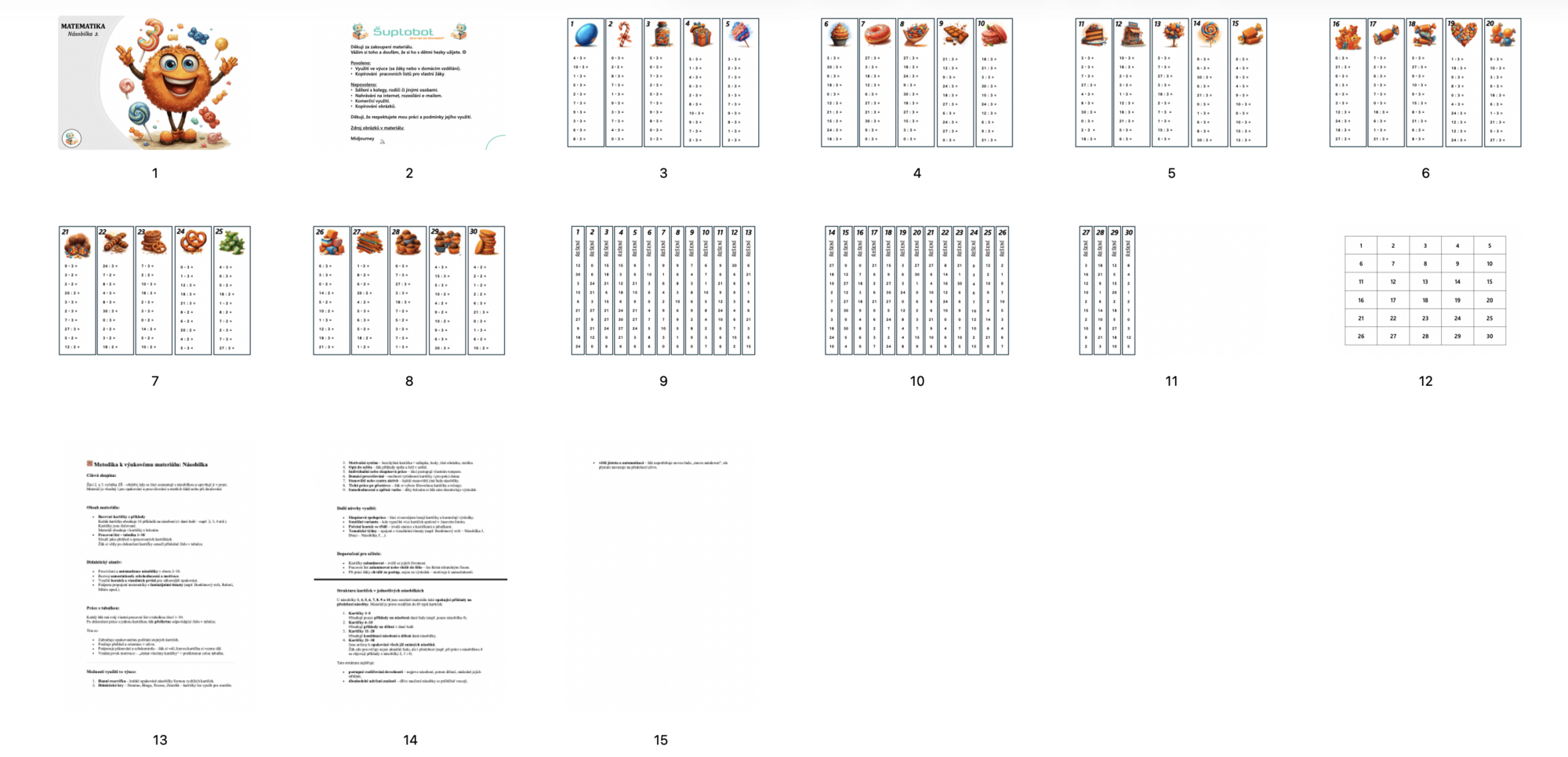 Součástí jsou také metodické listy pro učitele a pracovní tabulky, do kterých si žáci zaznamenávají již vypočítané kartičky. Díky tomu mají přehled o svém postupu, mohou si plánovat práci a motivovat se k dokončení celé série.