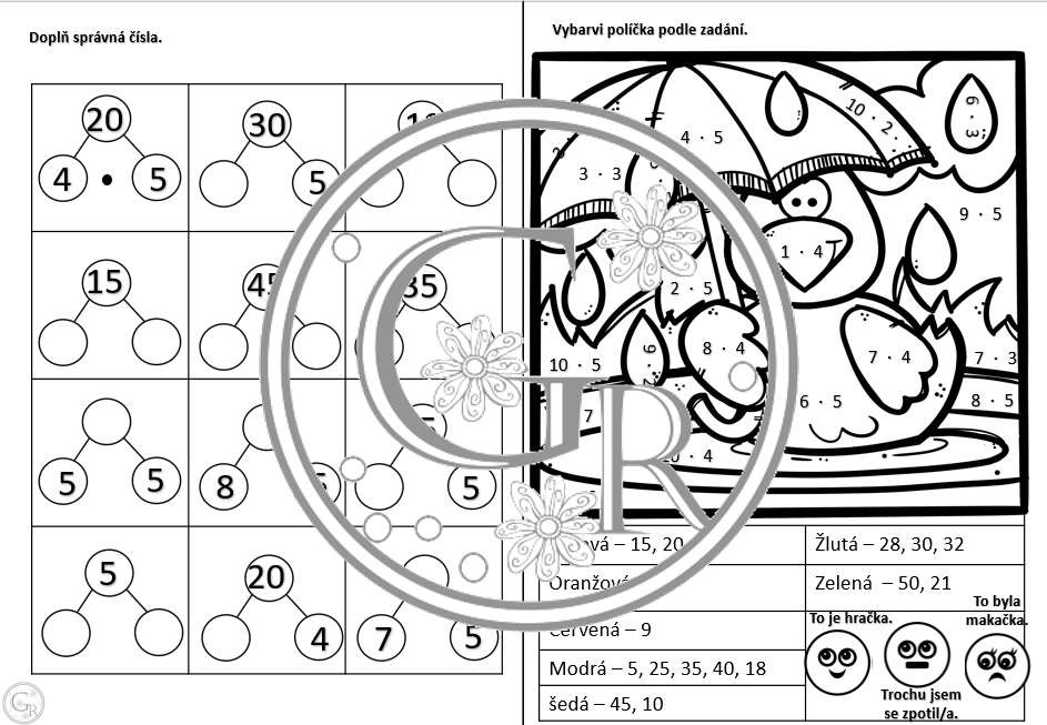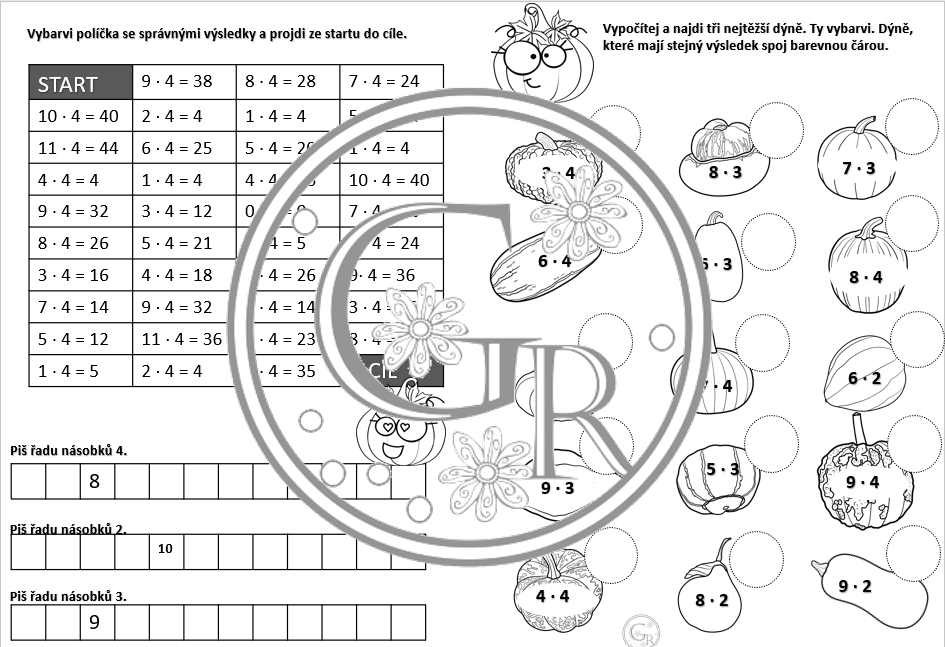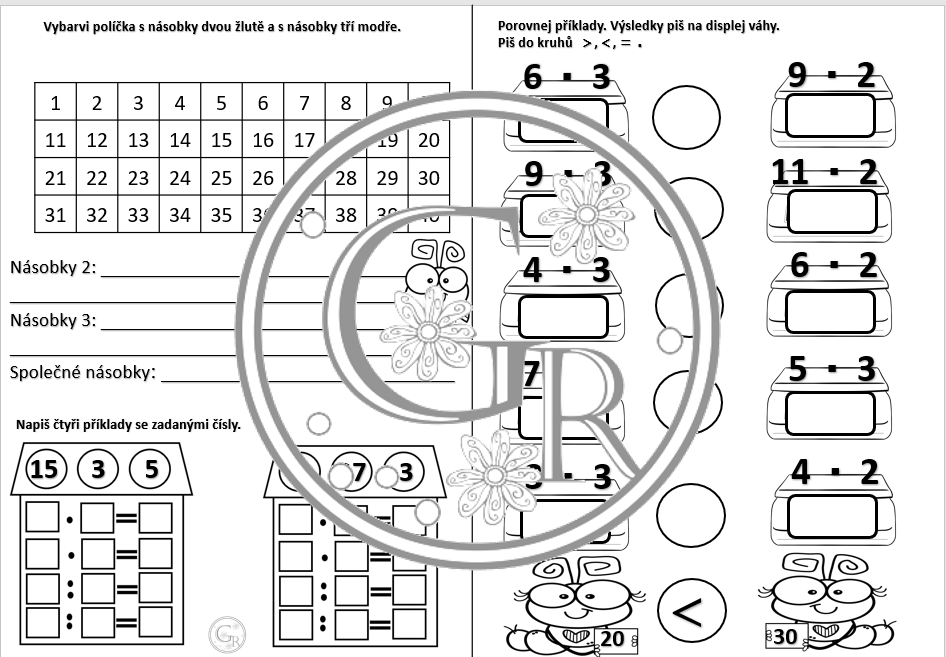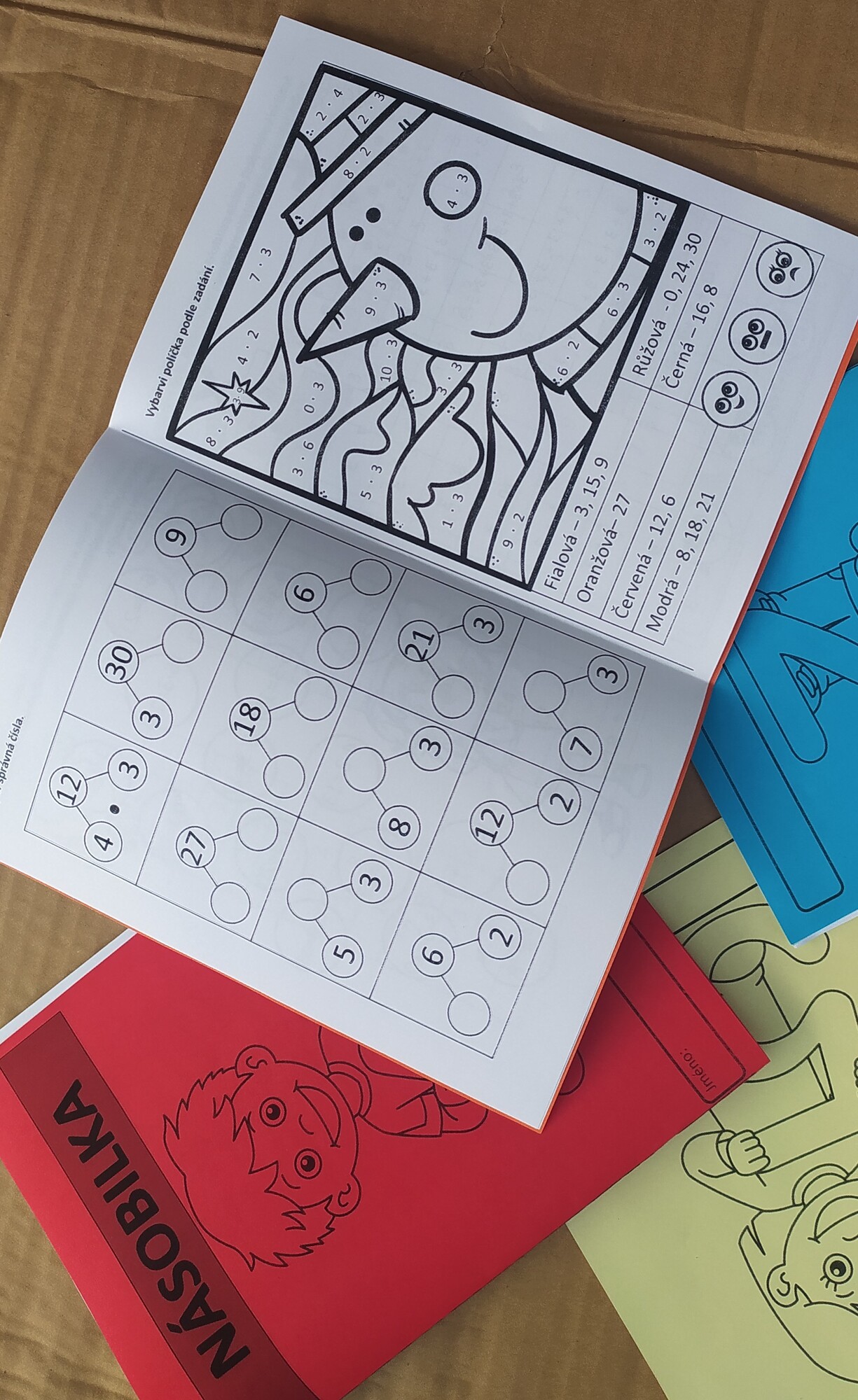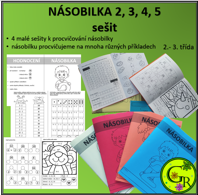 Čtyři malé procvičovací sešitky na násobilku 2 - 5. Každá knížečka má jeden list jako obal a dva oboustranné listy plné cvičení k procvičování násobilky 2, 3, 4, a 5. Děti si mohou vybírat cvičení, které se jim líbí, můžou procvičovat ve škole i doma. Můžeme jen nafotit jednotlivé listy a děti, které jsou hotovy mohou procvičovat jen vybrané cvičení.