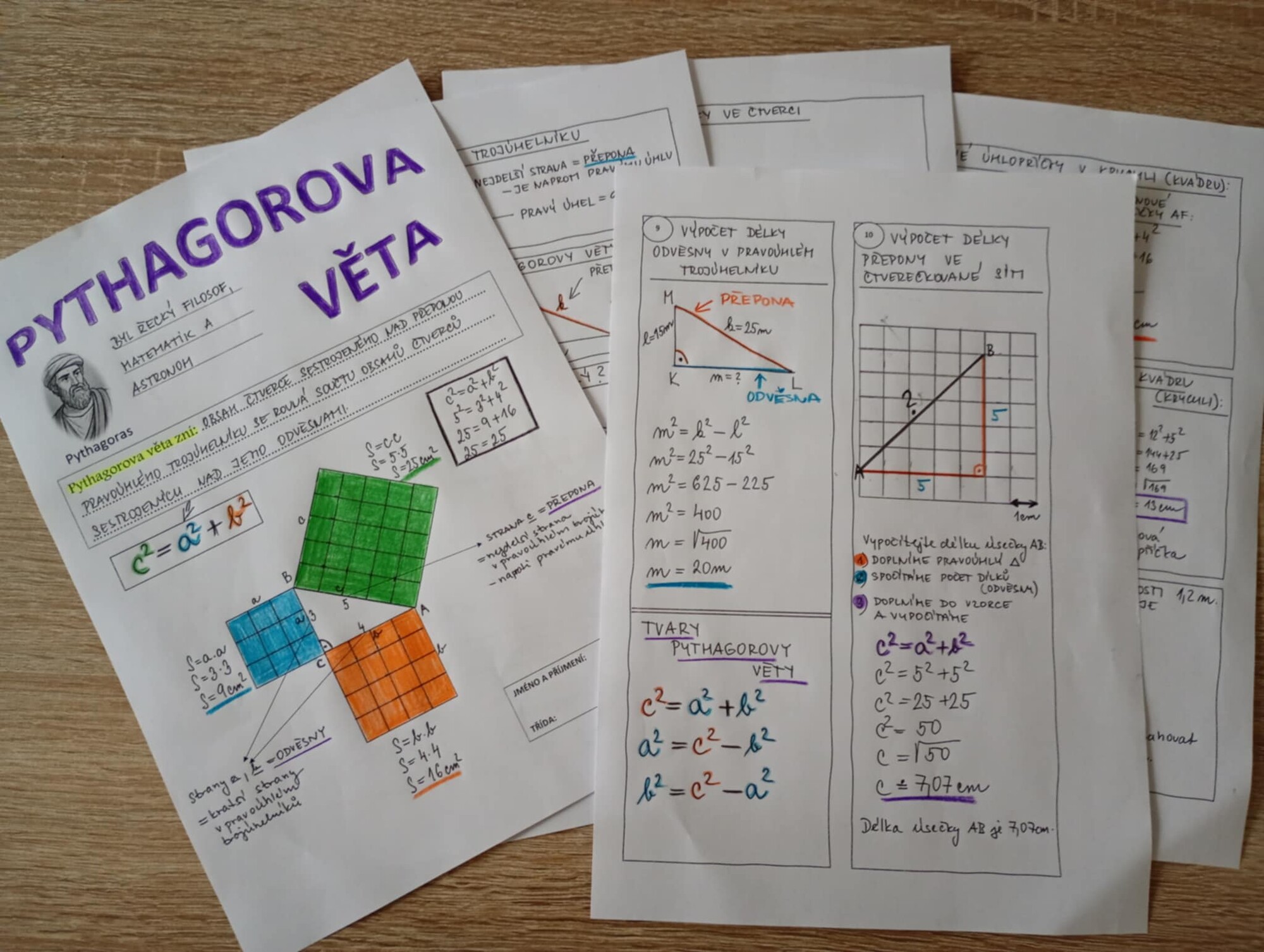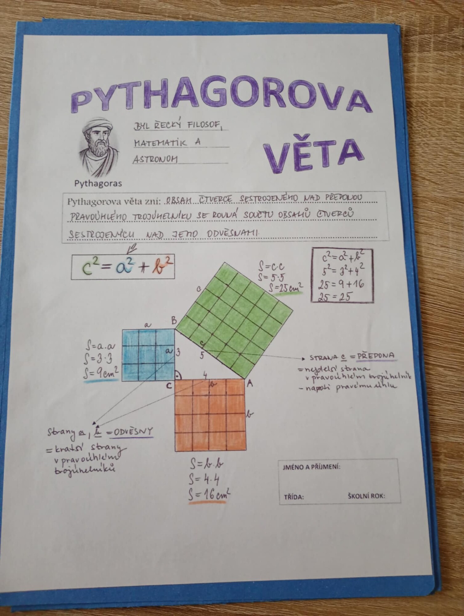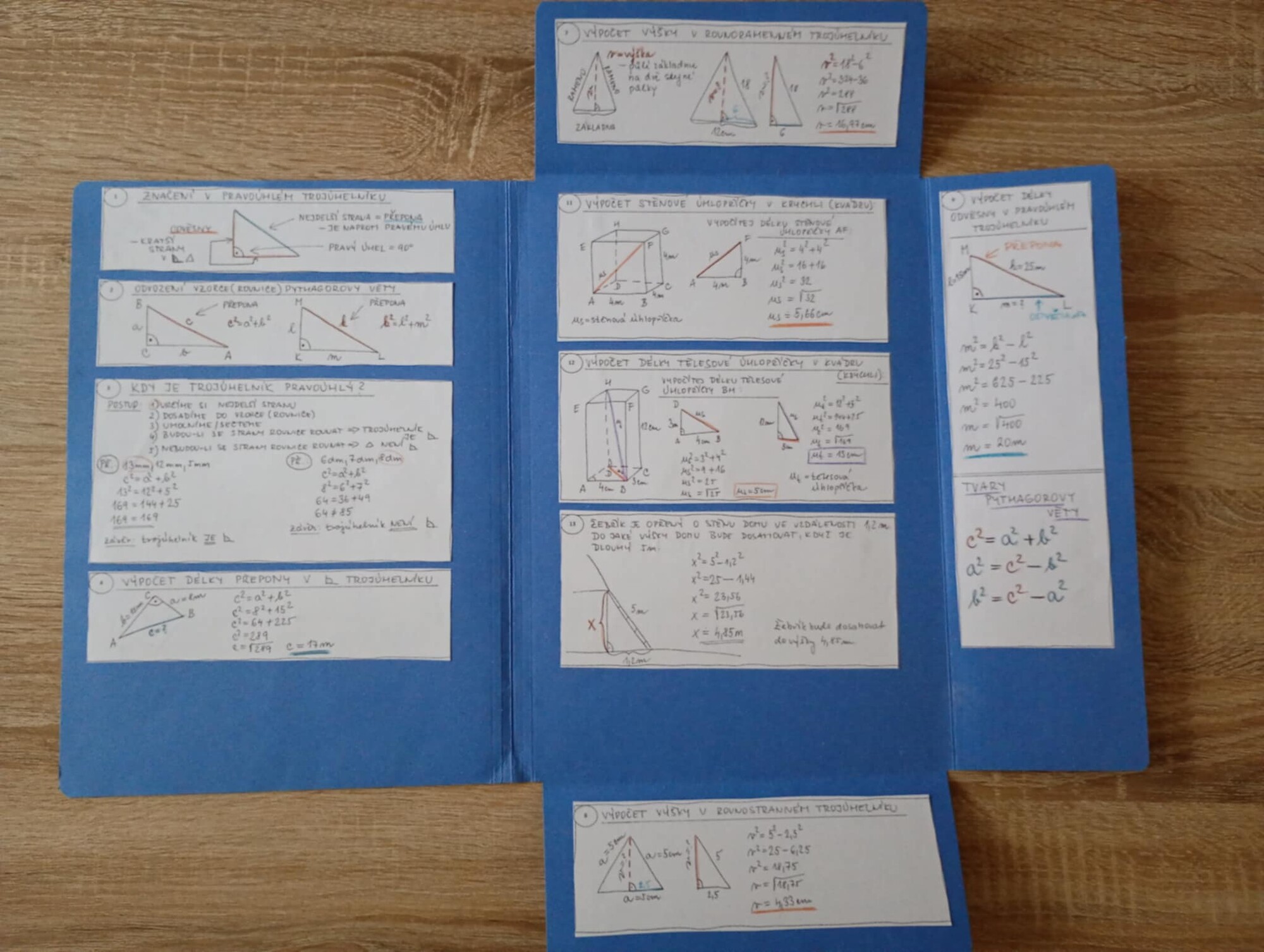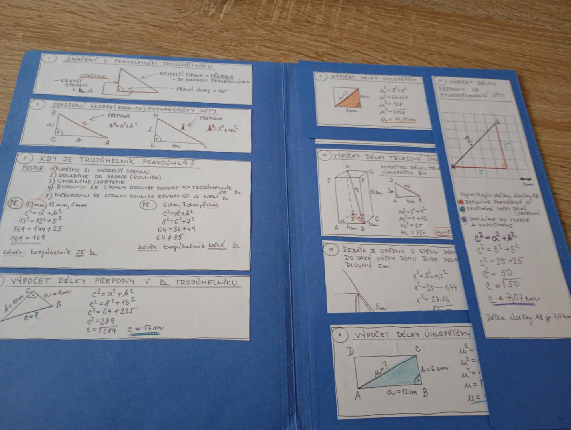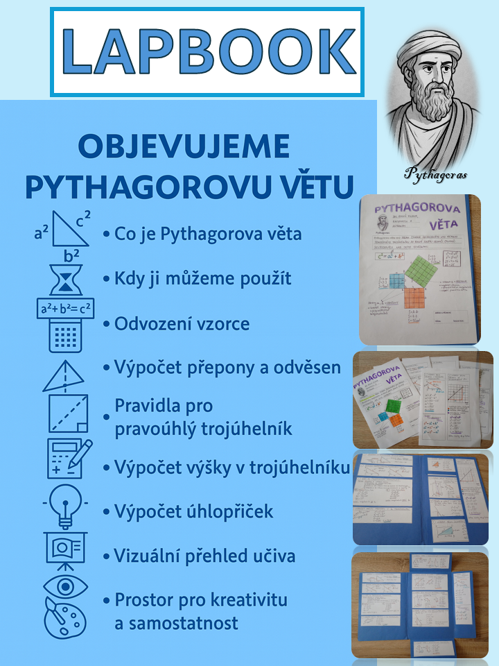 Lapbook je kreativní výuková pomůcka, která slouží k vizuálnímu a praktickému uchopení učiva. V tomto případě se zaměřuje na Pythagorovu větu, její využití a aplikaci v praxi. Žáci si sami tvoří lapbook do desek s klopami, do kterých vlepují pravidla výpočtů a následně vkládají různé části učiva – pracovní listy s příklady, testy.