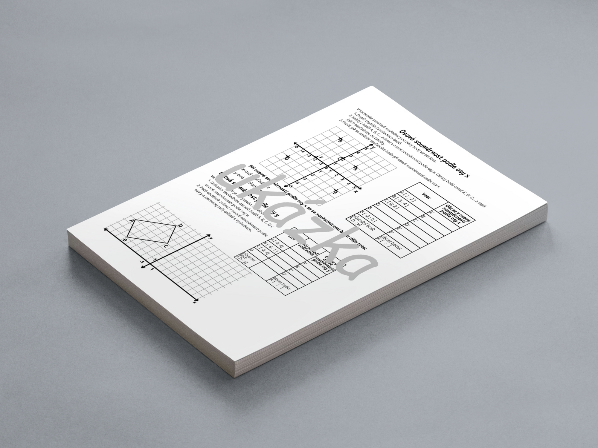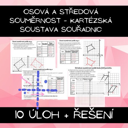 Materiál procvičuje osovou a středovou souměrnost v kartézské soustavě souřadnic. Obsahuje úlohy na zobrazení bodů i útvarů, odhad i rýsování a vede žáky k pochopení změn souřadnic.