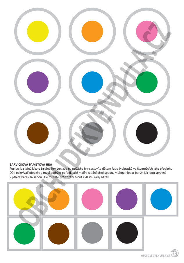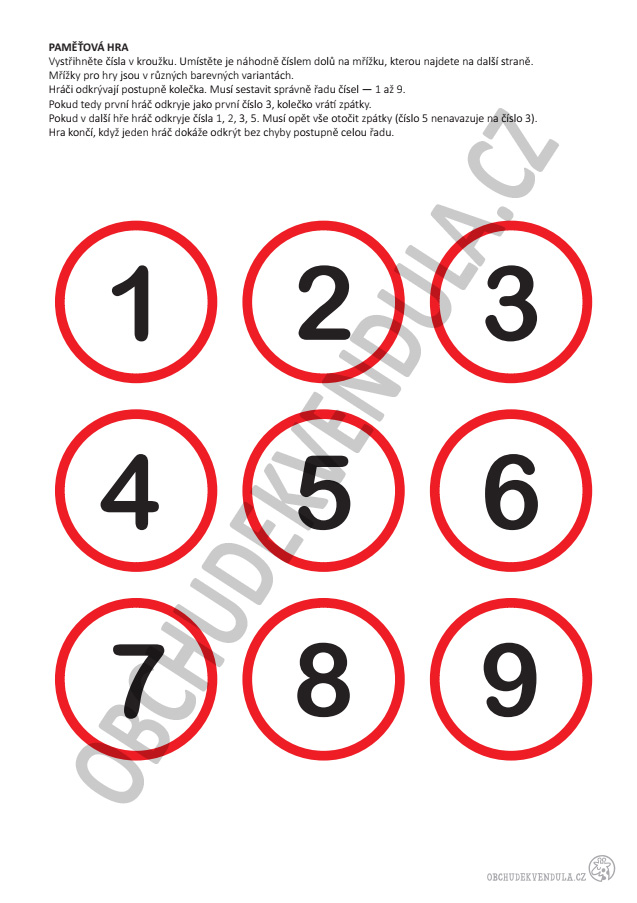 Hra posilující paměť. Hráči při hře otáčejí kartičky v určeném pořadí - čísla nebo puntíky 1 - 9, nebo velikonoční obrázky a barvy. Vyhrává ten, kdo první otočí všech devět karet ve správném pořadí.