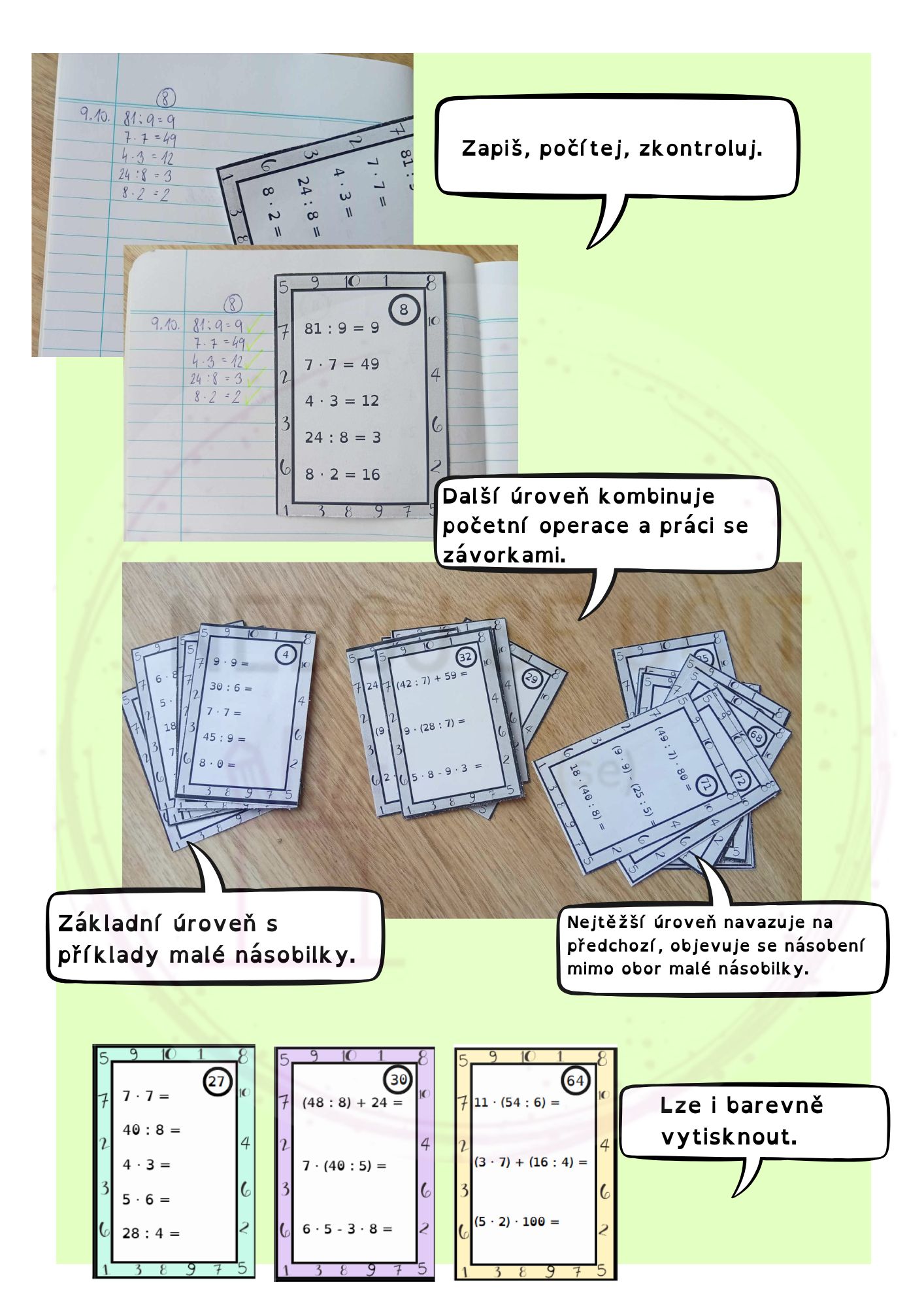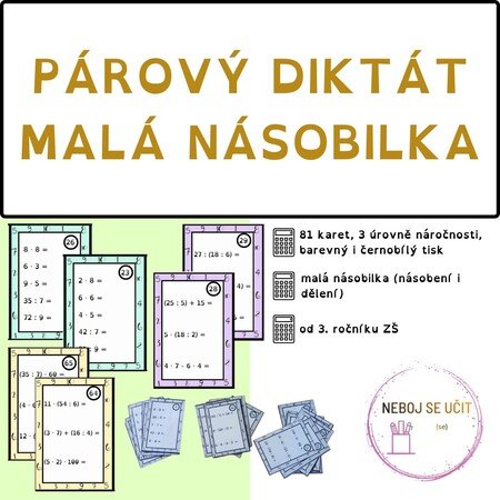 Materiál Párový diktát je určen pro práci ve dvojicích v hodinách matematiky. Jeden z žáků předčítá/diktuje příklady uvedené na kartičce a druhý zapisuje celé příklady nebo pouze jejich výsledky do sešitu, papír či mazací tabulku. Soubor obsahuje 81 kartiček, jejichž náročnost je rozdělena do tří úrovní. Na kartě první úrovně, tyrkysové barvy, se nachází pět příkladů kombinující násobení a dělení v oboru malé násobilky. Druhá úroveň, fialové karty, zahrnuje tři příklady kombinující násobení a dělení v oboru malé násobilky s práci se závorkami. Třetí, nejtěžší, úroveň obsahuje taktéž tři příklady. Tyto příklady zahrnují navíc oproti druhé úrovni násobení mimo obor násobilek. Třetí úroveň zastupují karty žluté barvy. Vyřešené příklady každé úrovně si žáci mohou zkontrolovat pomocí zadní strany karty, která obsahuje řešení. Každá úroveň obsahuje 27 karet (můžete v hodině pracovat s jednou vybranou úrovní nebo využít všechny v rámci individualizace výuky). Materiál je vhodný pro žáky od 3. ročníku ZŠ. Součástí materiálu je také šablona pro případné dotvoření dalších karet. Všechny karty lze černobíle vytisknout (stupeň obtížnosti pak poznáte podle typologie příkladů na kartičce).