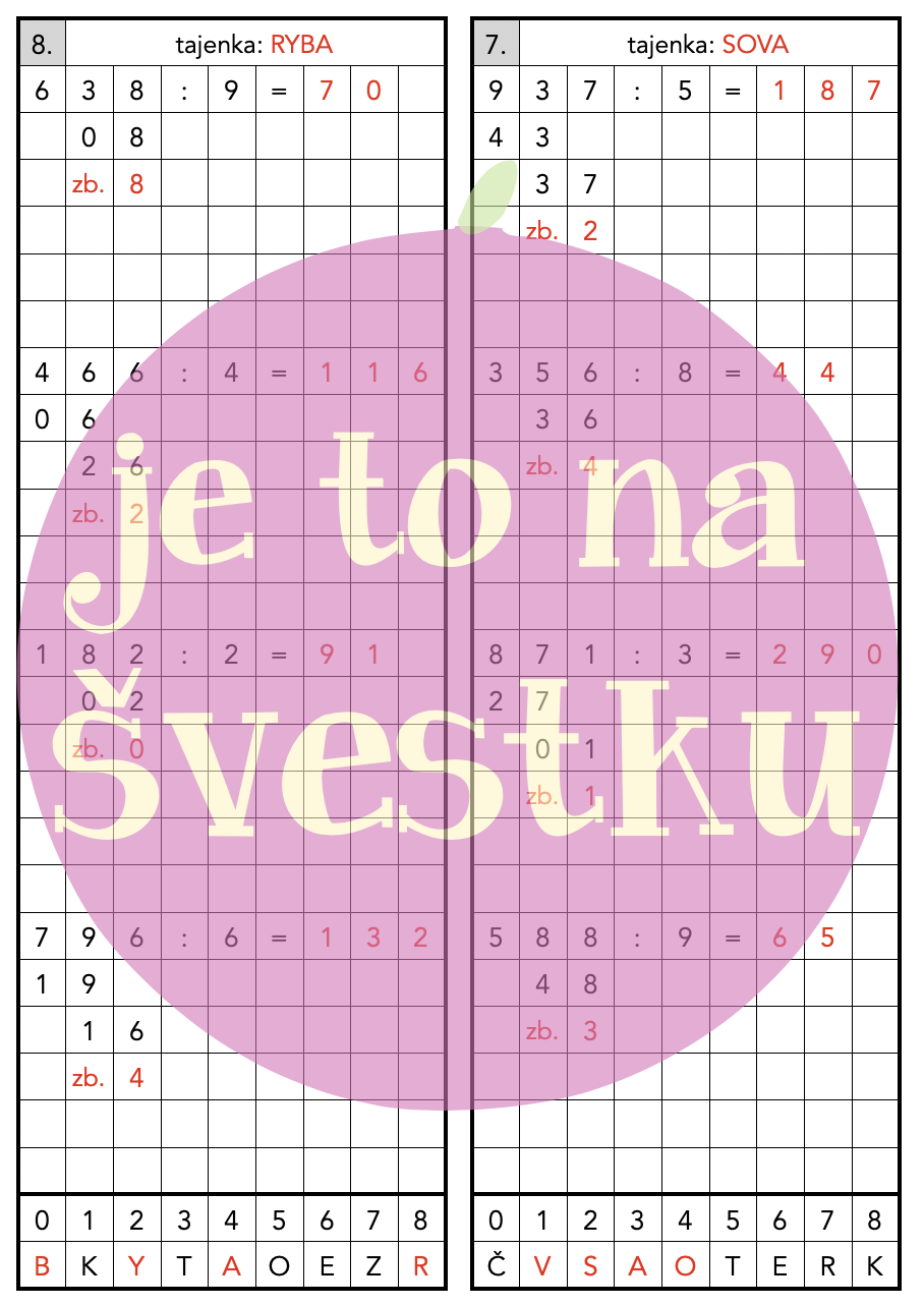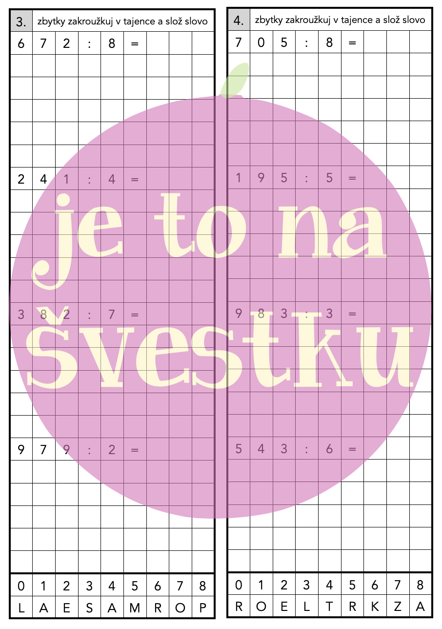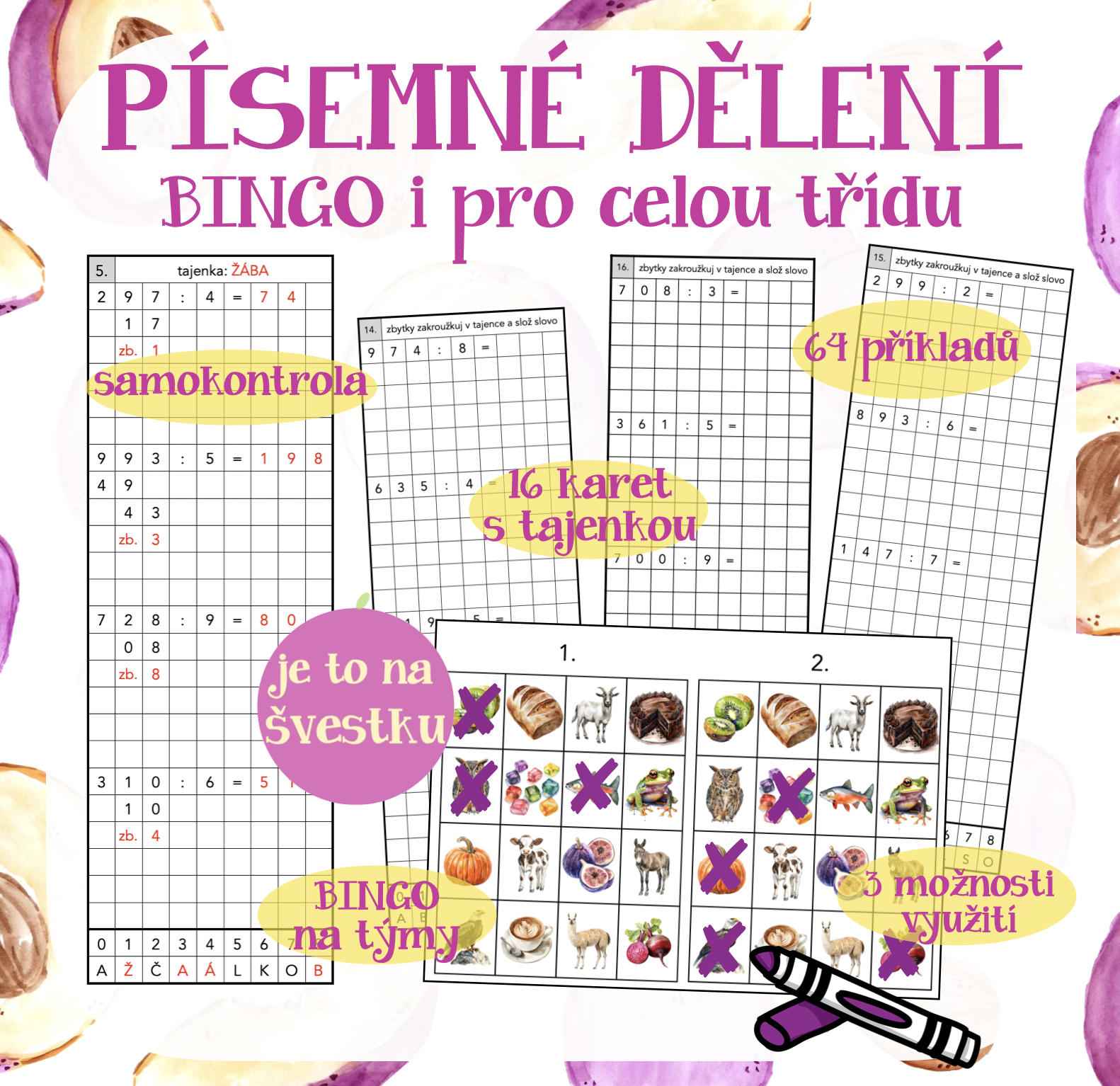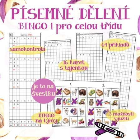 Materiál obsahuje 16 různých karet s příklady na písemné dělení jednociferným číslem se zbytkem. Celkem tedy 64 příkladů. Materiál můžete vytisknout oboustranně - řešení budete mít z druhé strany každé karty.