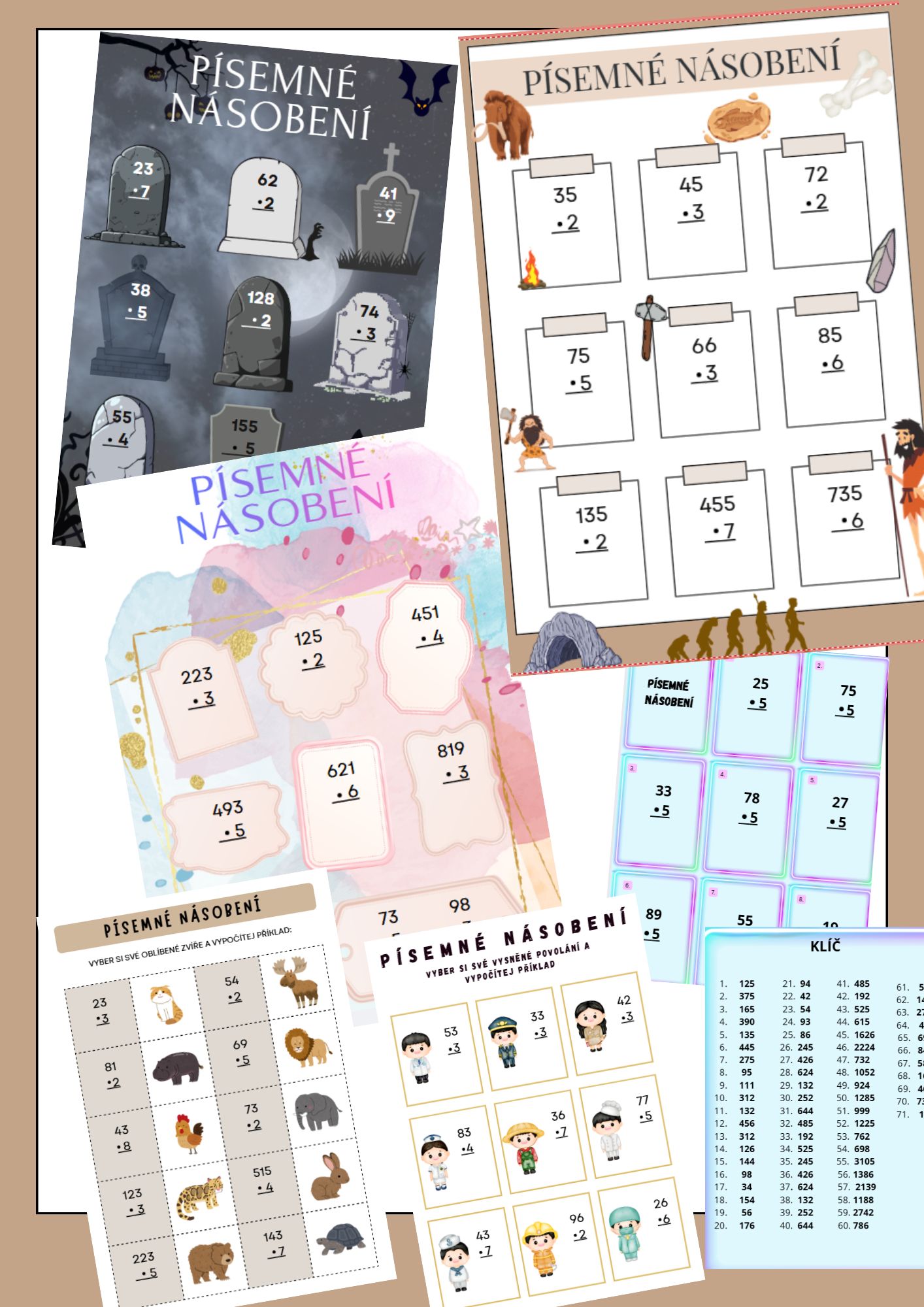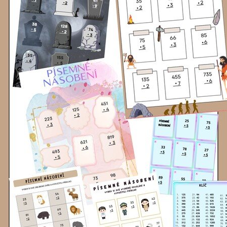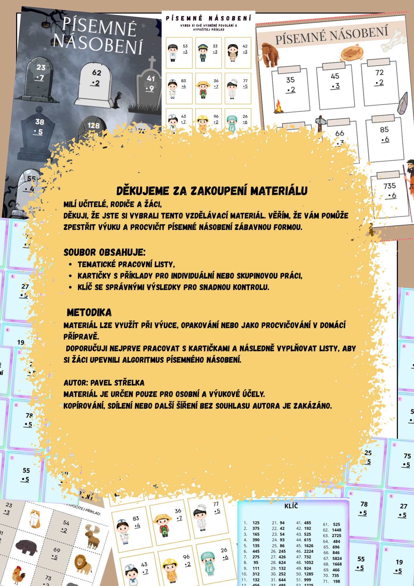 Materiál Lze využít při výuce, opakování nebo jako procvičování v domácí přípravě. Doporučuji nejprve pracovat s kartičkami a následně vyplňovat listy, aby si žáci upevnili algoritmus písemného násobení.