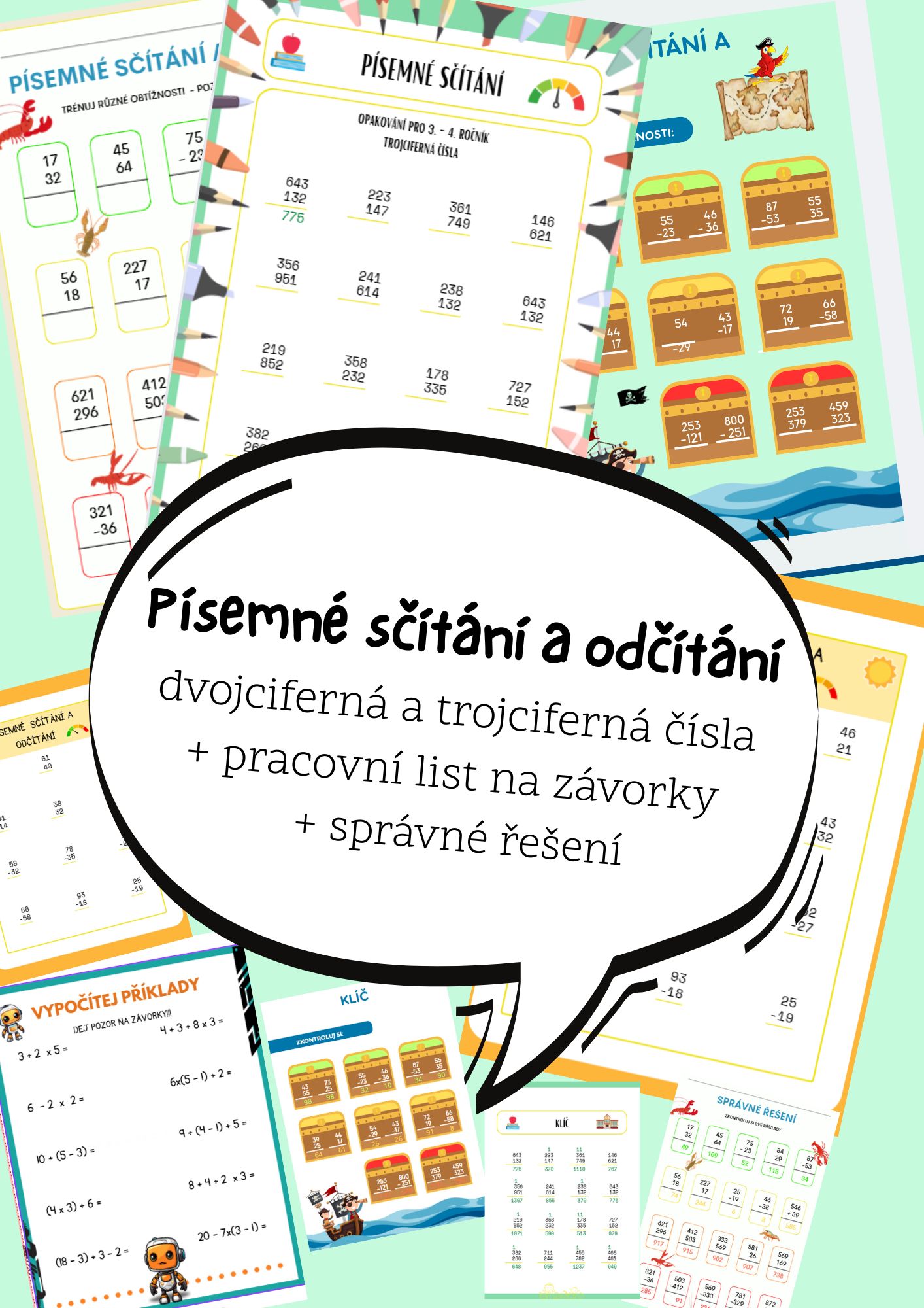 Písemné sčítání a odčítání – 5 pracovních listů se správným řešením