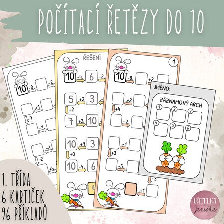 Oblíbená pomůcka do hodin matematiky - řetězové sčítání a odčítání do 10. Lze využít jako práce pro rychlíky nebo jako procvičování. Obsahuje barevnou i černobílou variantu, řešení pro samokontrolu a záznamový arch pro žáky.