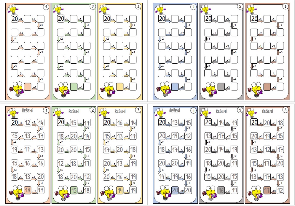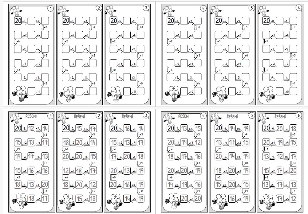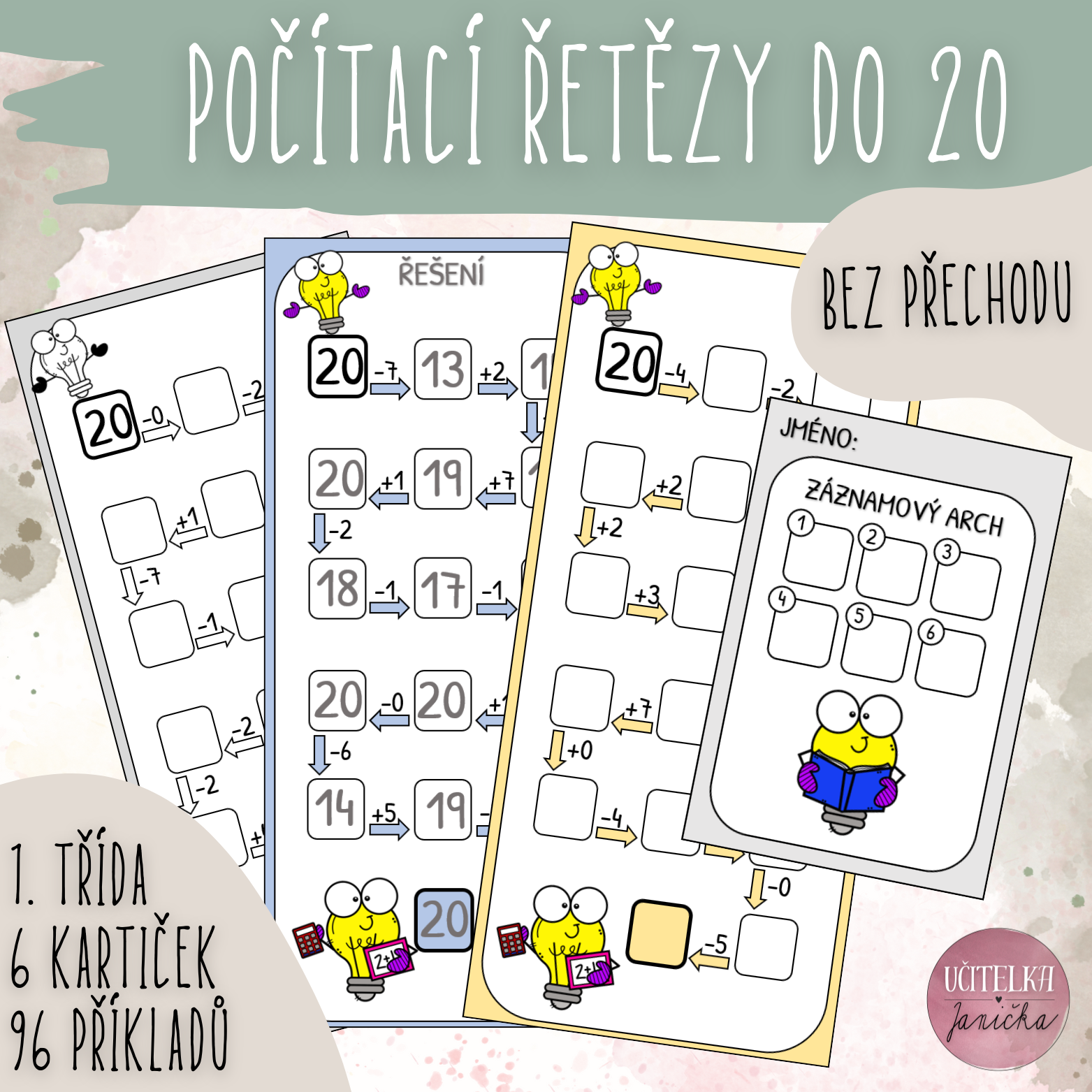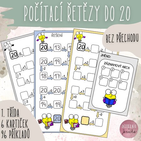 Řetězové počítání do 20 bez přechodu přes základ. Lze využít jako práce pro rychlíky nebo jako procvičování pro všechny. Obsahuje barevnou i černobílou variantu, řešení pro samokontrolu a záznamový arch pro žáky.