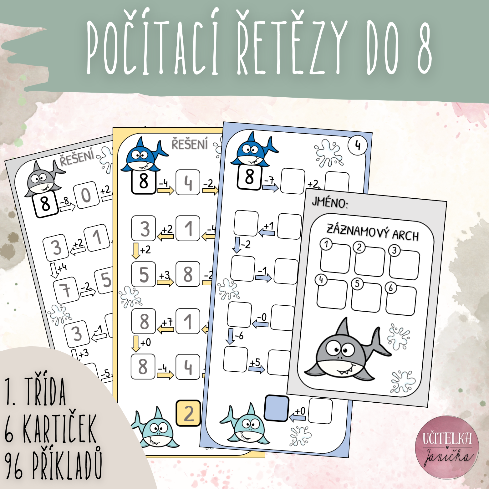 Oblíbená pomůcka do hodin matematiky - řetězové sčítání a odčítání do 8. Lze využít jako práce pro rychlíky nebo jako procvičování. Obsahuje barevnou i černobílou variantu, řešení pro samokontrolu a záznamový arch pro žáky.