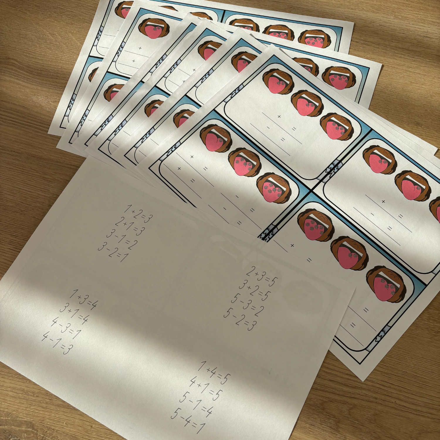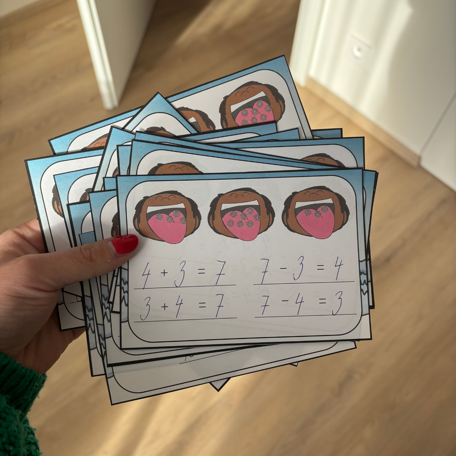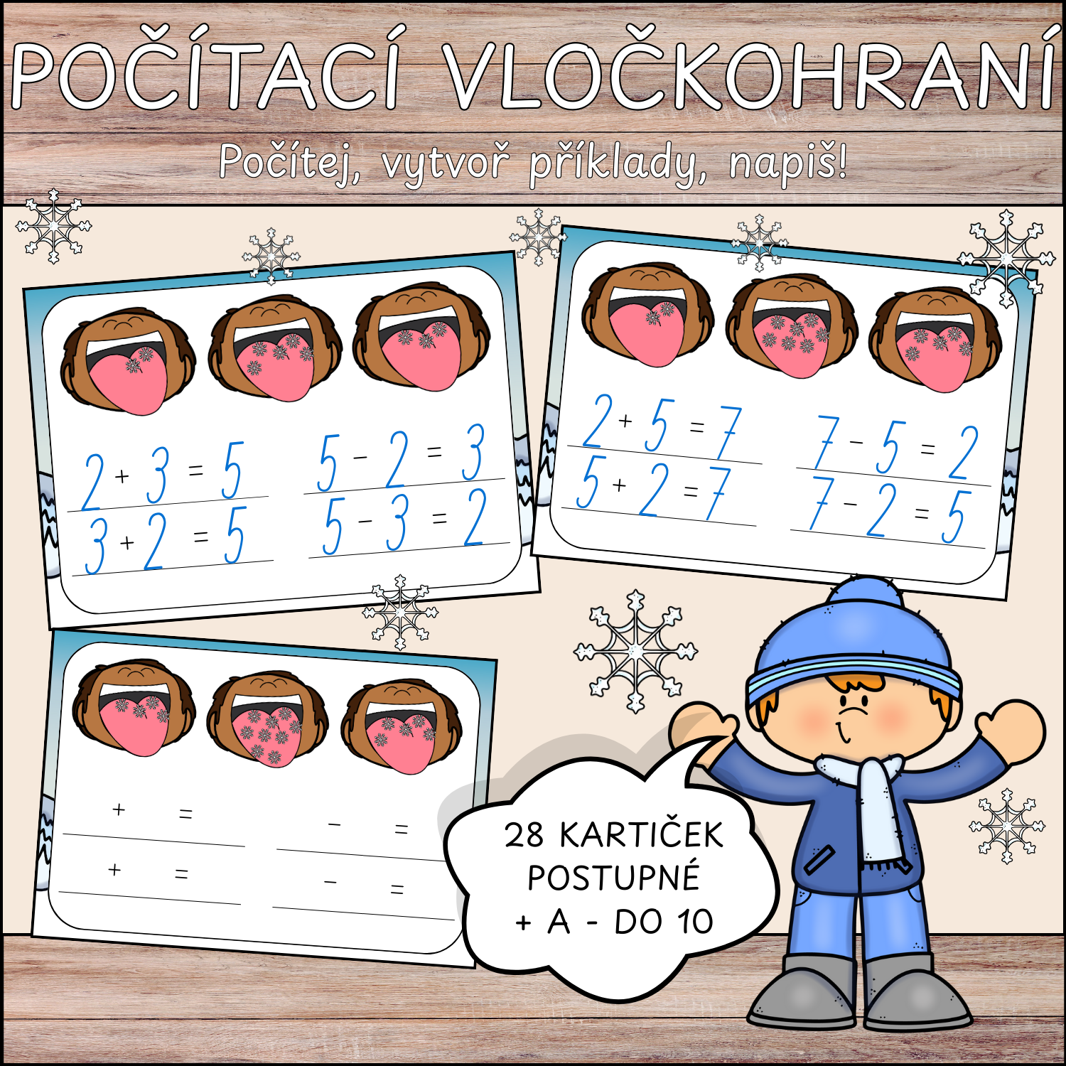 Materiál obsahuje 28 kartiček, na kterých si žáci procvičují tvoření příkladů na + a - do deseti. Každá kartička je tvořena třemi obrázky vloček. Žáci podle počtu vloček na jednotlivých obrázcích vytvářejí vlastní příklady a zapisují je.