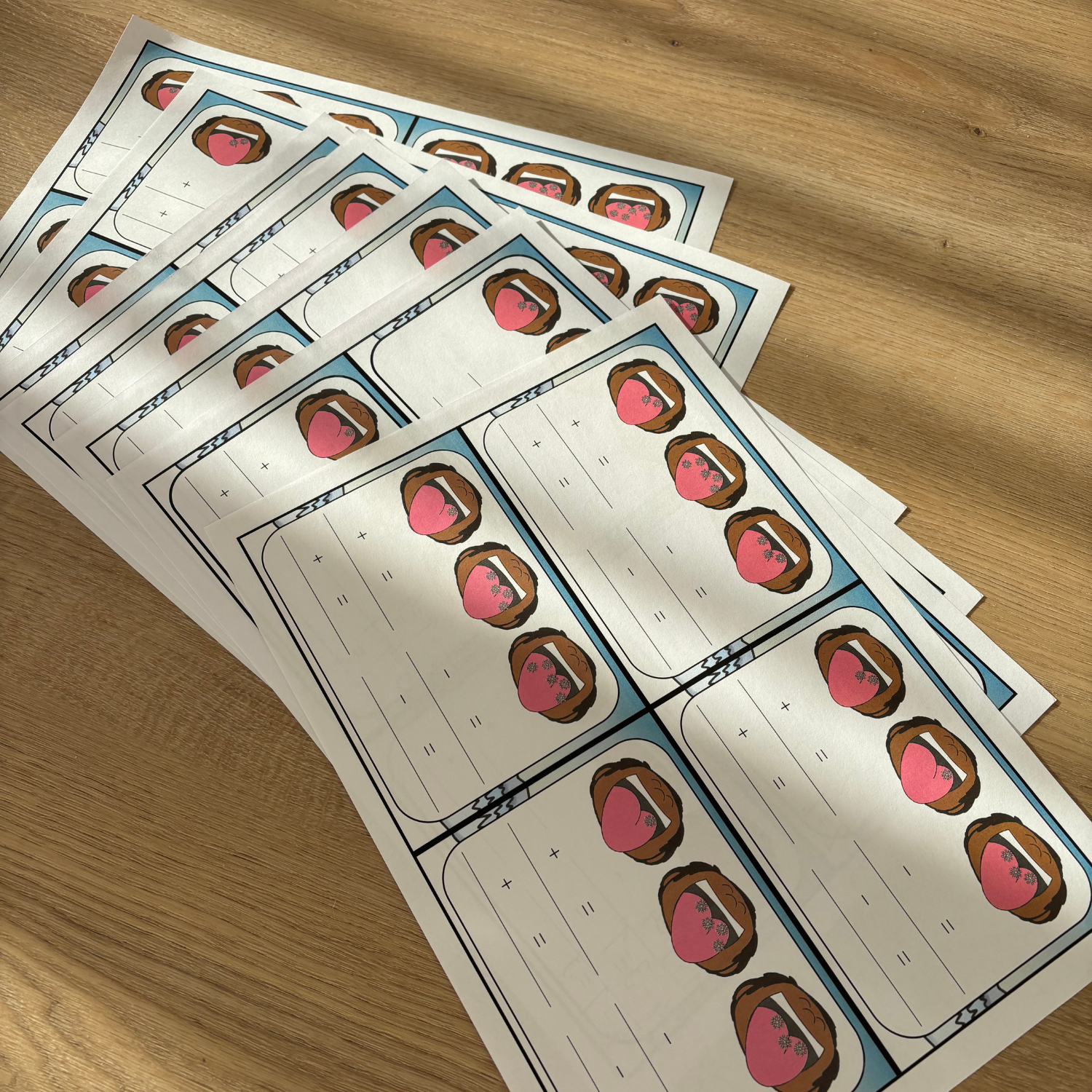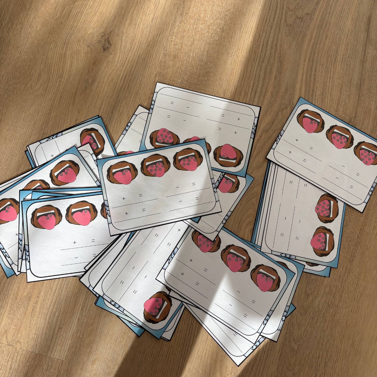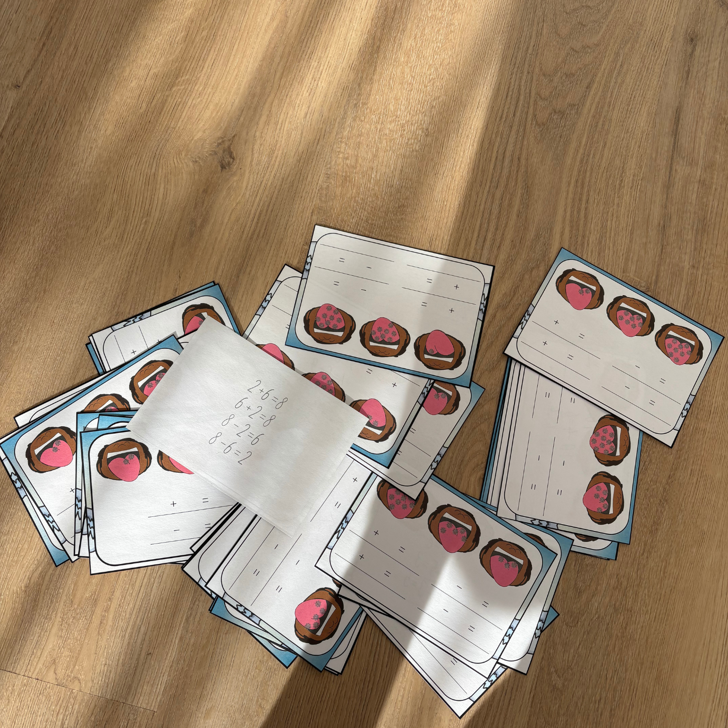 Materiál obsahuje 28 kartiček, na kterých si žáci procvičují tvoření příkladů na + a - do deseti. Každá kartička je tvořena třemi obrázky vloček. Žáci podle počtu vloček na jednotlivých obrázcích vytvářejí vlastní příklady a zapisují je.