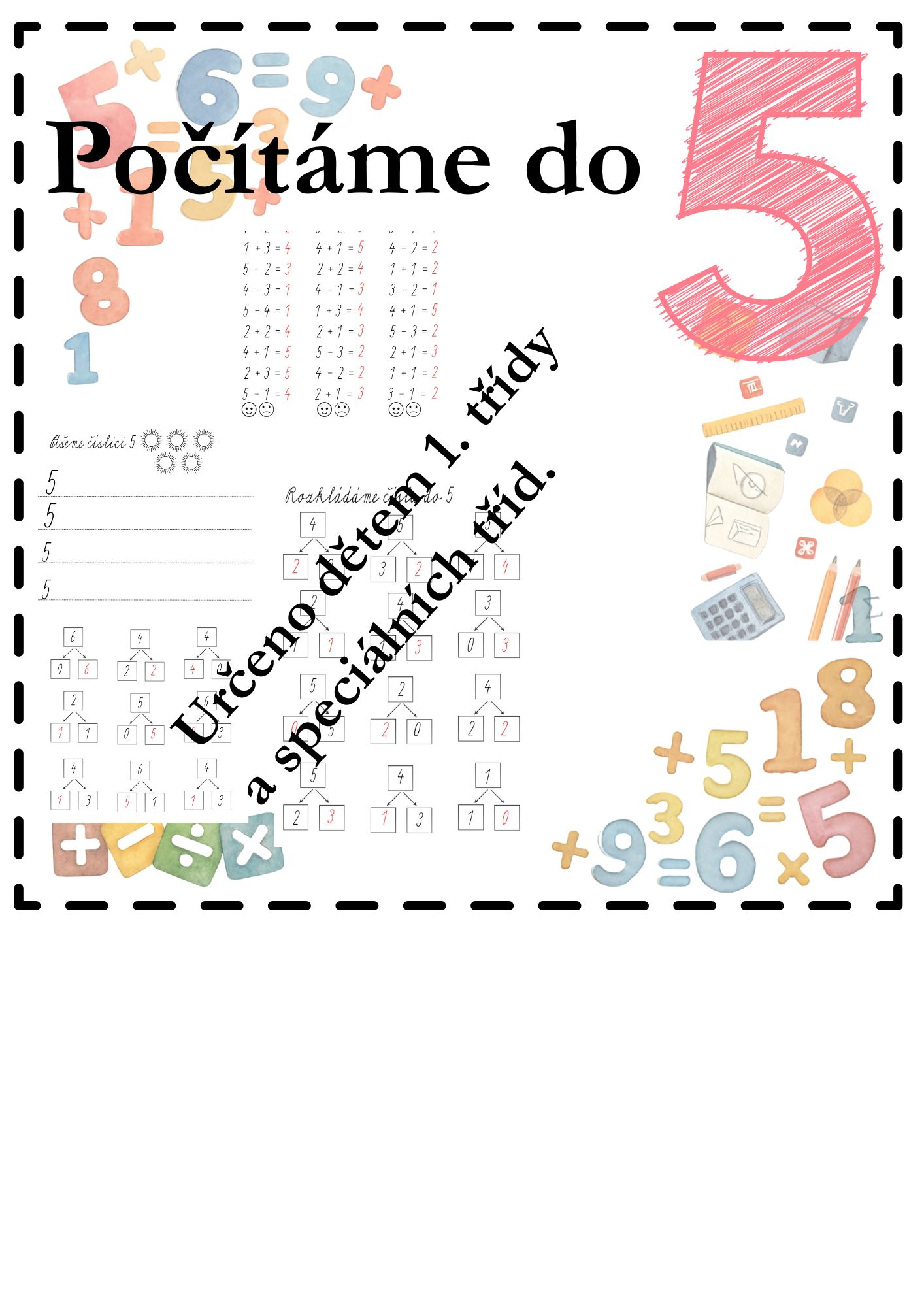 Materiál je strukturován postupně od jednodušších úloh ke složitějším. Nejprve se žáci seznamují s číslem 5 a jeho zápisem. Následují úlohy na sčítání a odčítání do 6, další část je věnována porovnávání čísel pomocí znaků <, >, = a rozkladu čísel do 5.