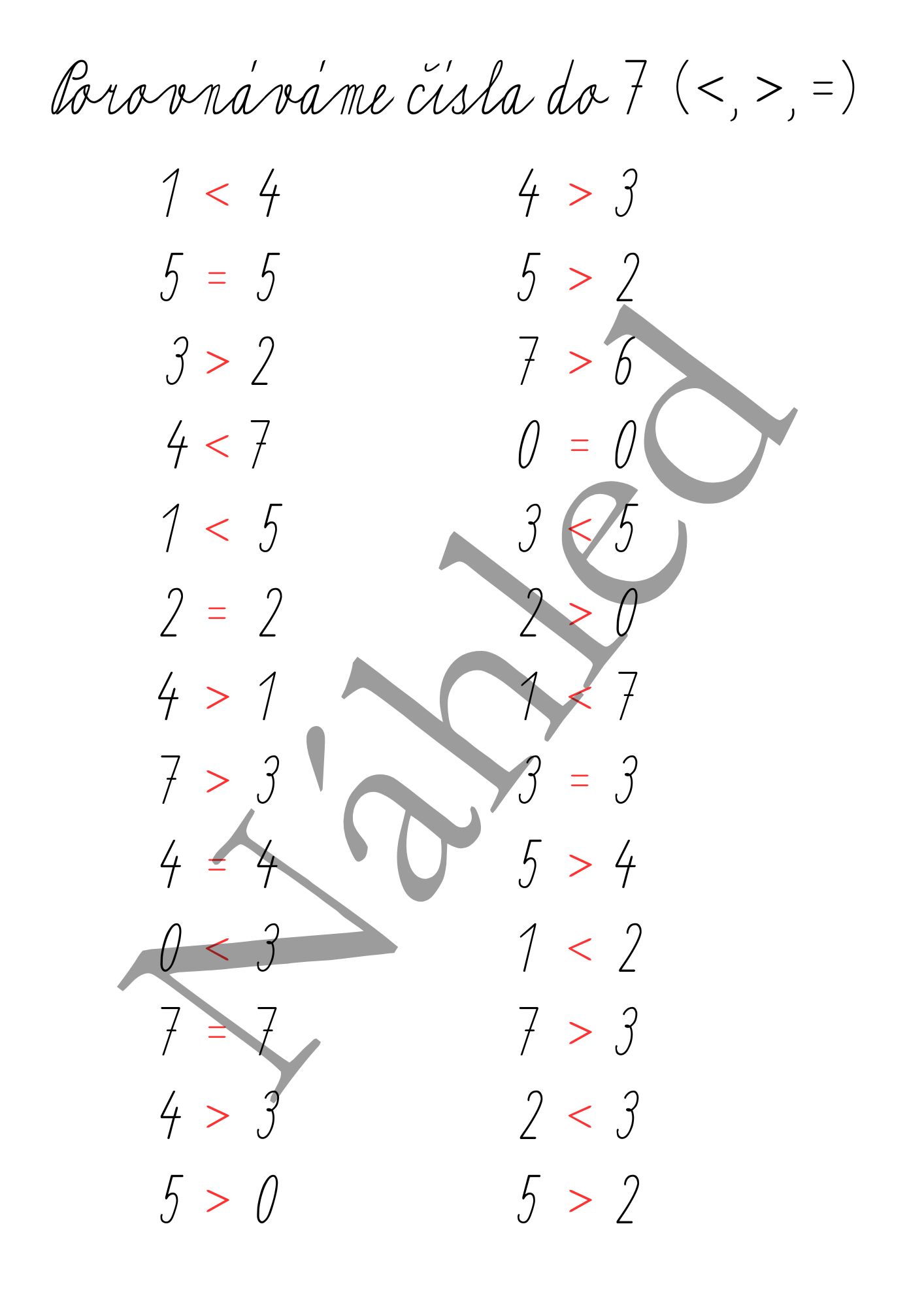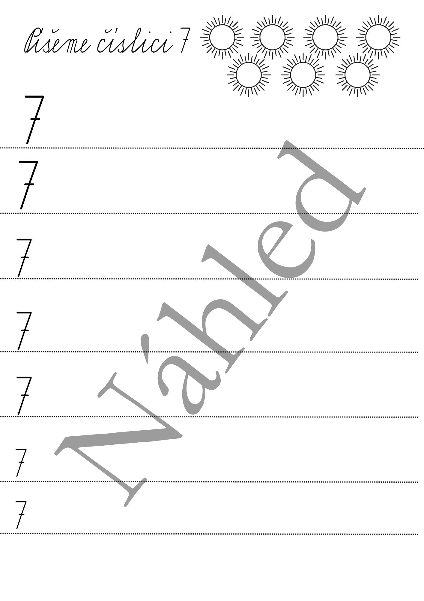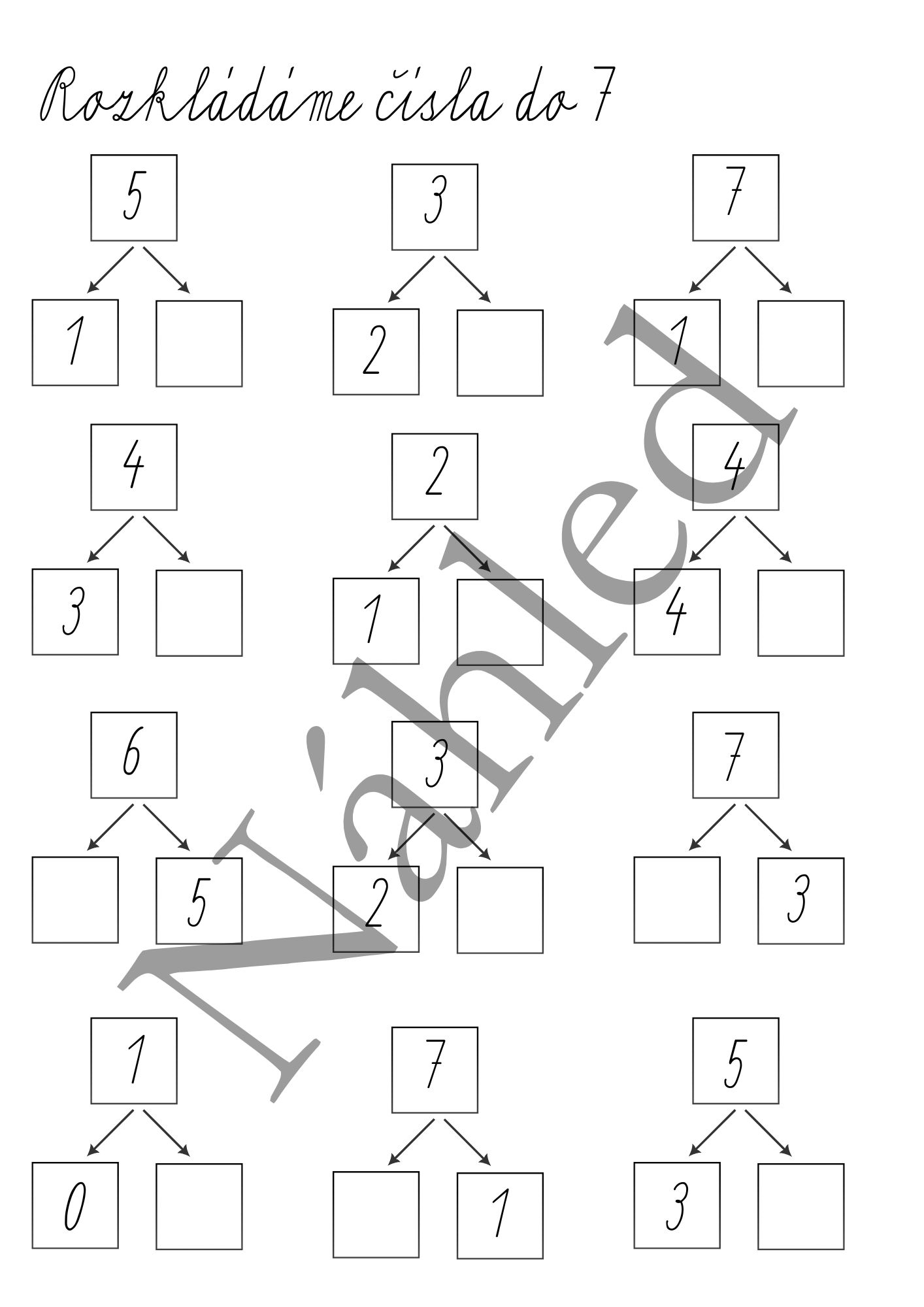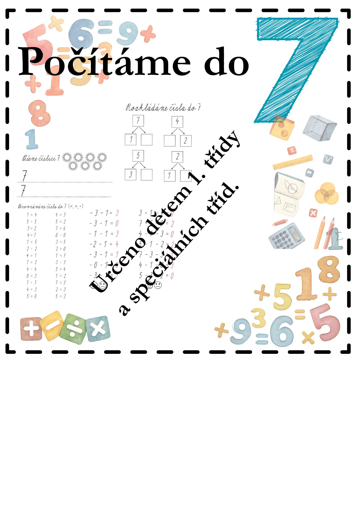Materiál je strukturován postupně od jednodušších úloh ke složitějším. Nejprve se žáci seznamují s číslem 7 a jeho zápisem. Následují úlohy na sčítání a odčítání do 7, další část je věnována porovnávání čísel pomocí znaků <, >, = a rozkladu čísel do 7.