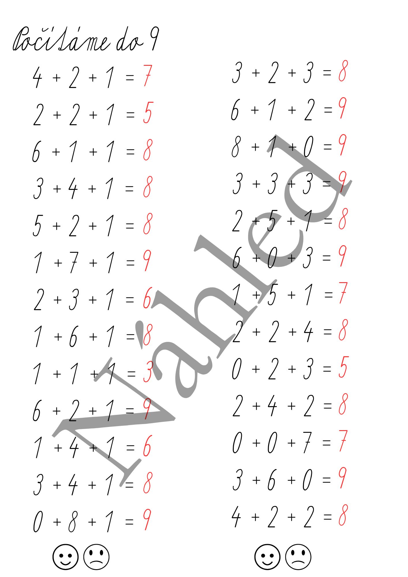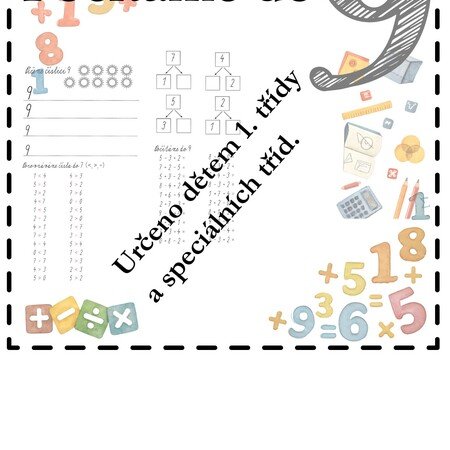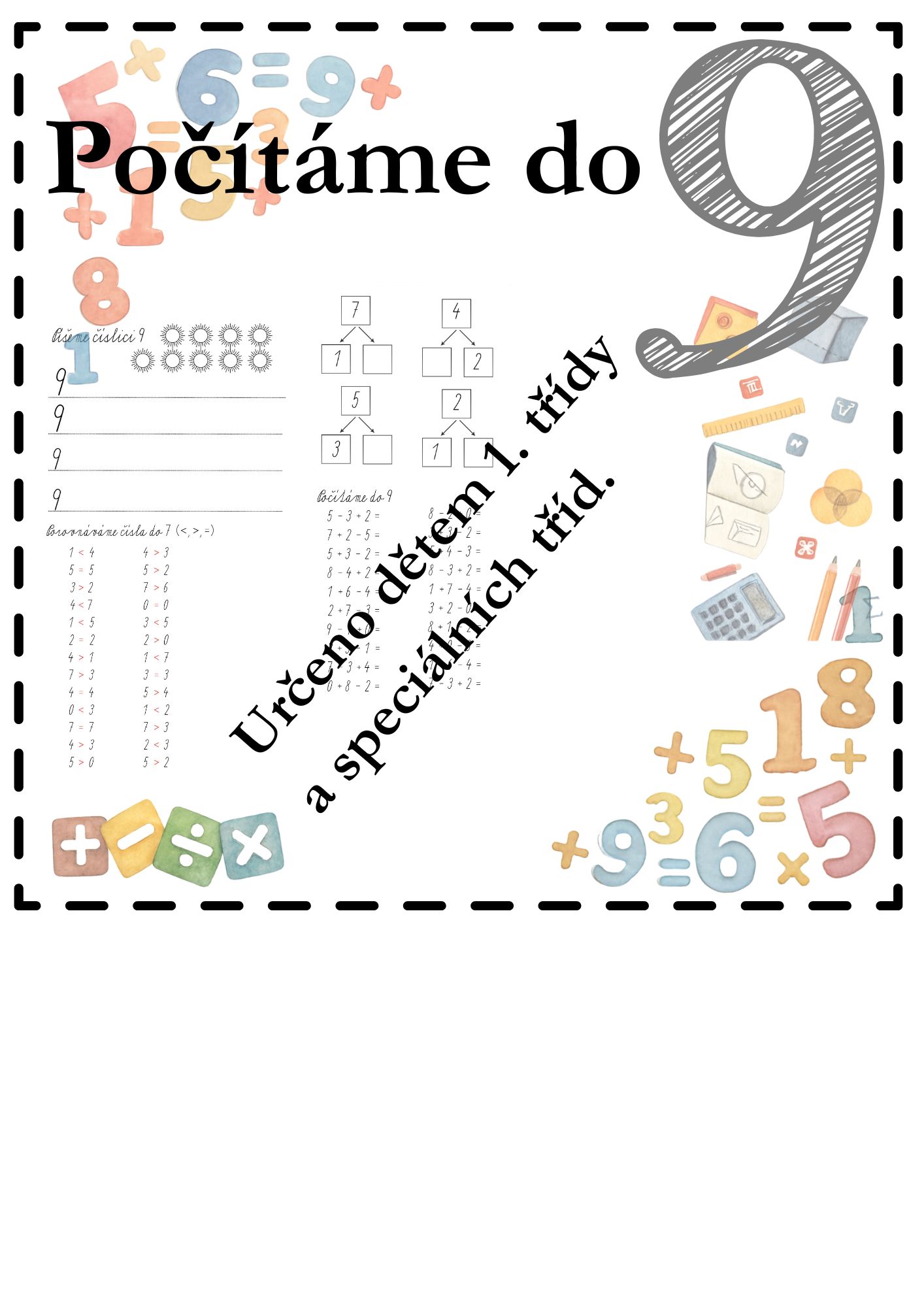 Materiál je strukturován postupně od jednodušších úloh ke složitějším. Nejprve se žáci seznamují s číslem 9 a jeho zápisem. Následují úlohy na sčítání a odčítání do 9, další část je věnována porovnávání čísel pomocí znaků <, >, = a rozkladu čísel do 9.
