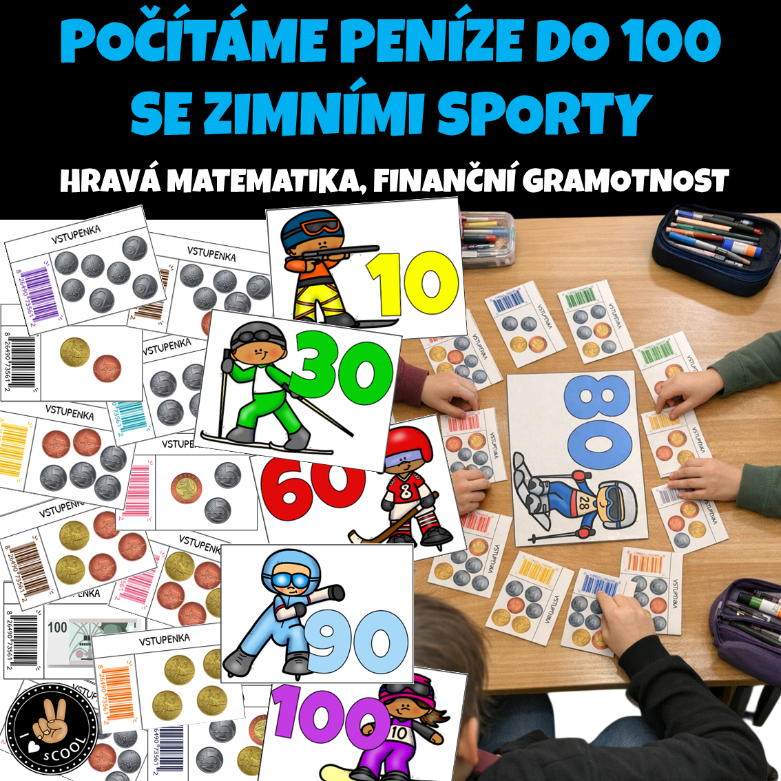 Výukový materiál je určen pro žáky 2. třídy ZŠ k procvičování počítání peněz. Je tematicky zasazen do prostředí zimních sportovních her, které děti motivuje a podporuje jejich zájem o práci. Žáci pracují se „vstupenkami“, na nichž jsou znázorněny mince a jedna bankovka v různých kombinacích. Úkolem žáků je spočítat hodnotu peněz a přiřadit vstupenku ke správnému sportu označenému číslem (10–100).