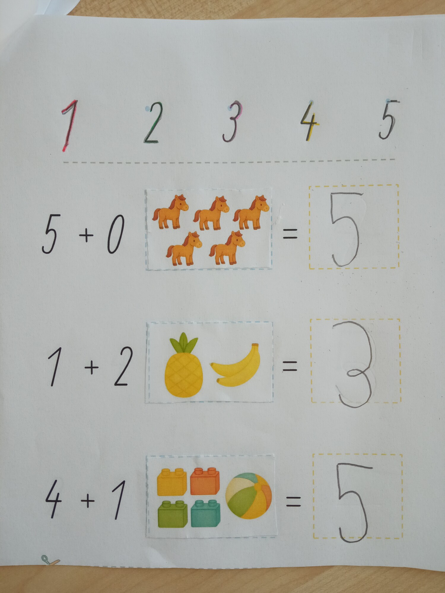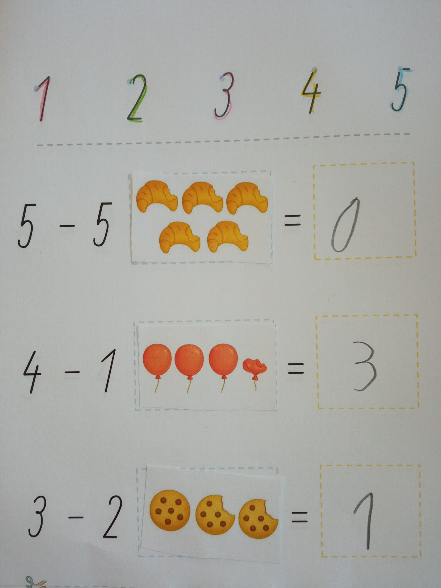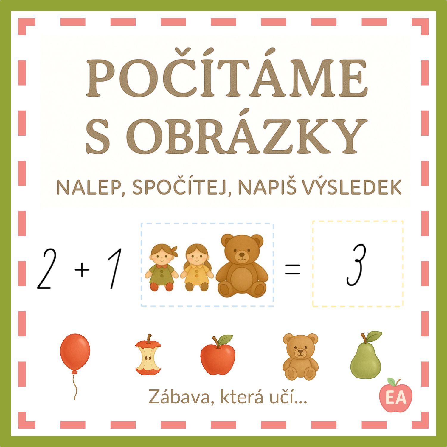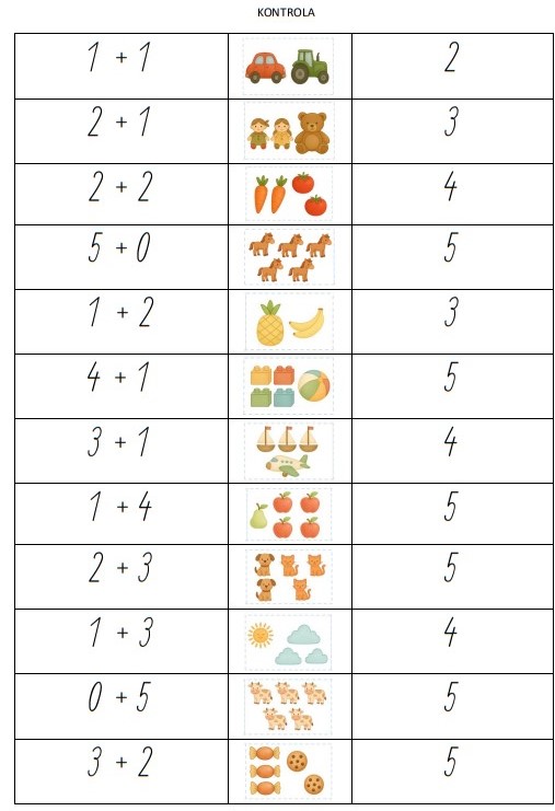 Tato pomůcka přináší dětem hravé pracovní listy na procvičování sčítání a odčítání v oboru do 5. Každý příklad děti řeší tak, že vystřihnou správný obrázek, nalepí ho k příkladu a poté dopíší výsledek.