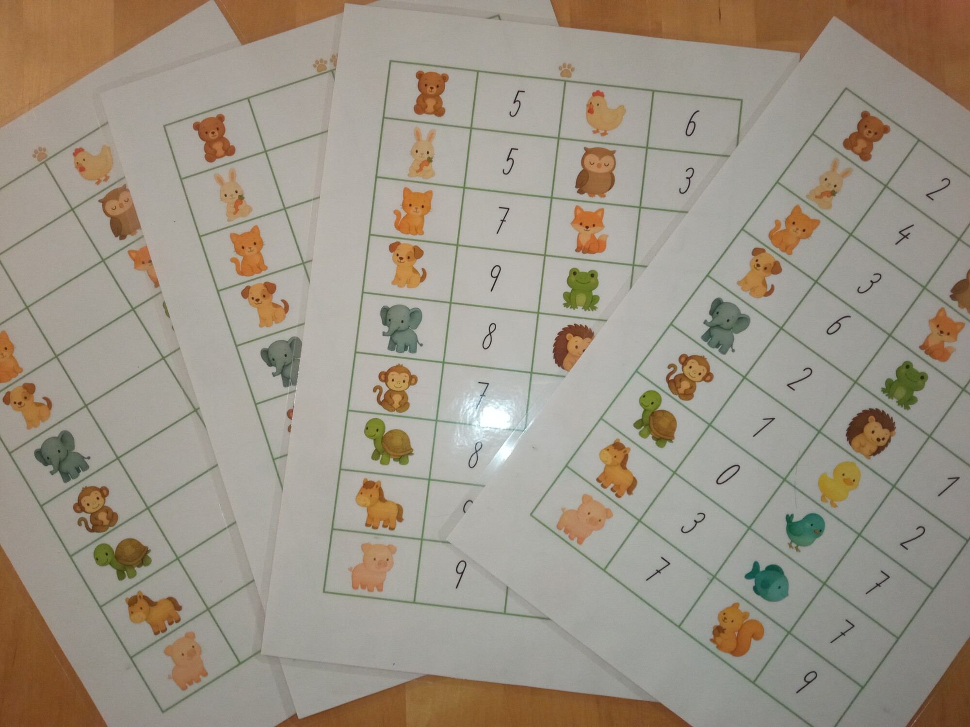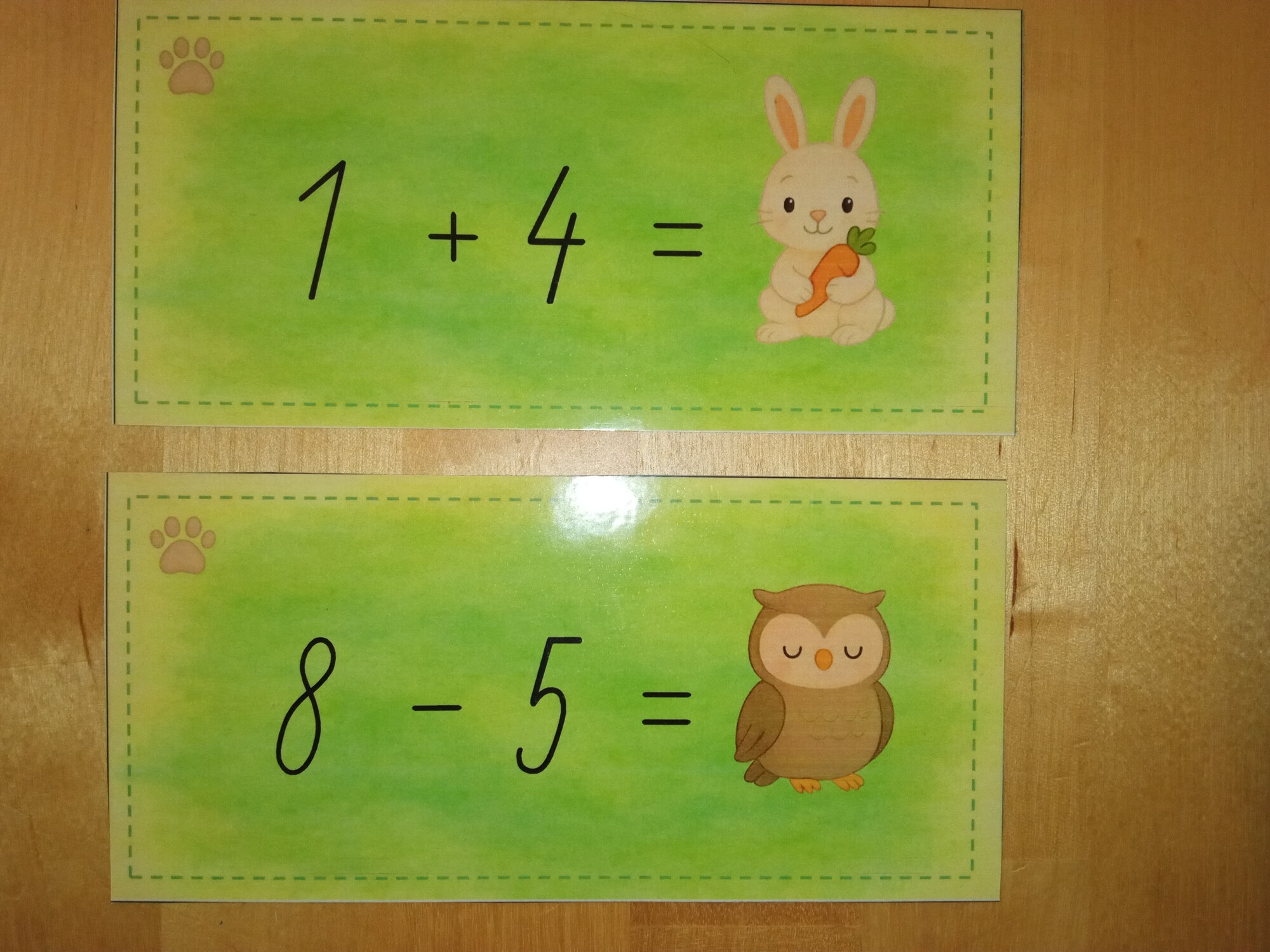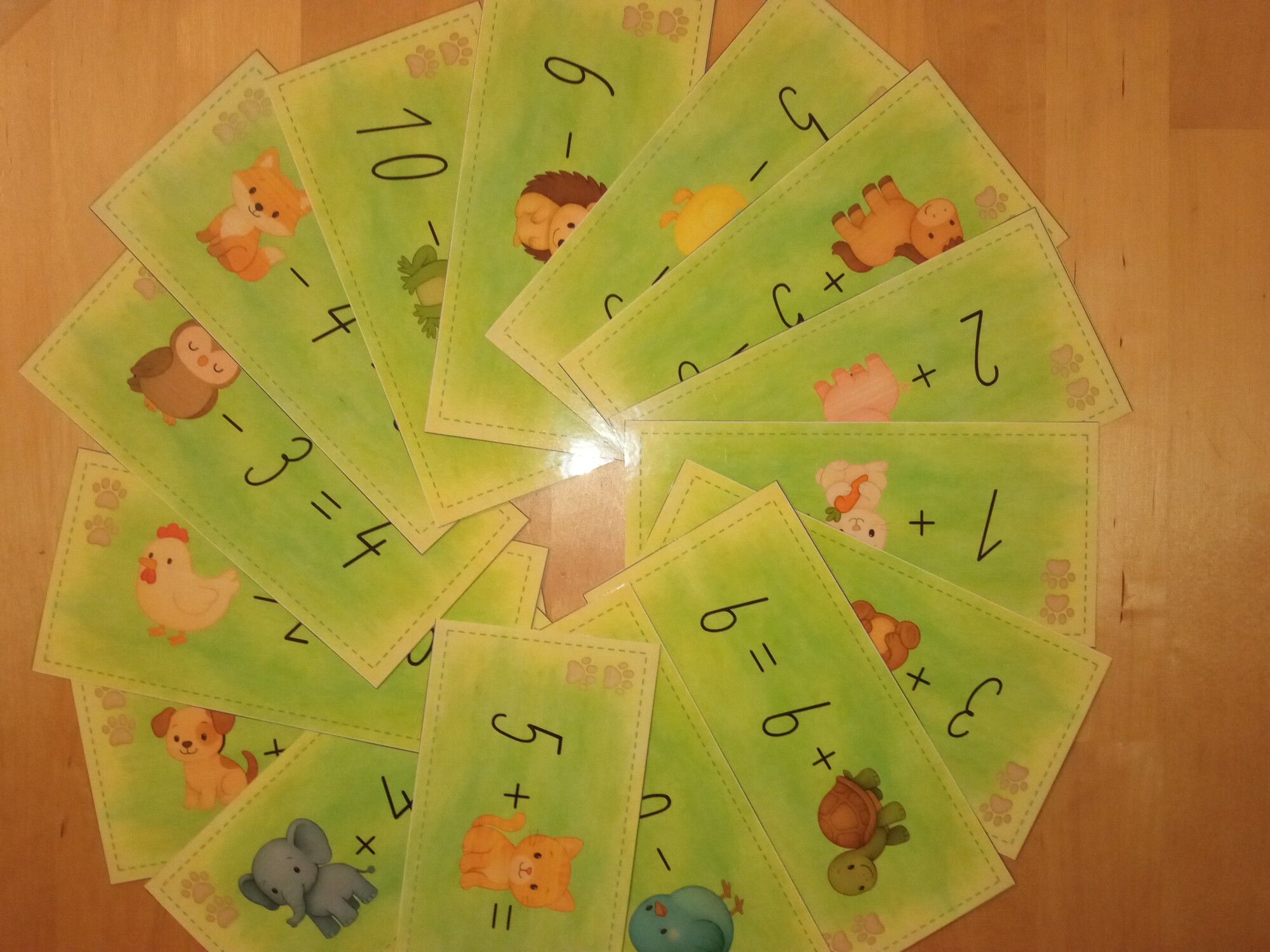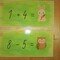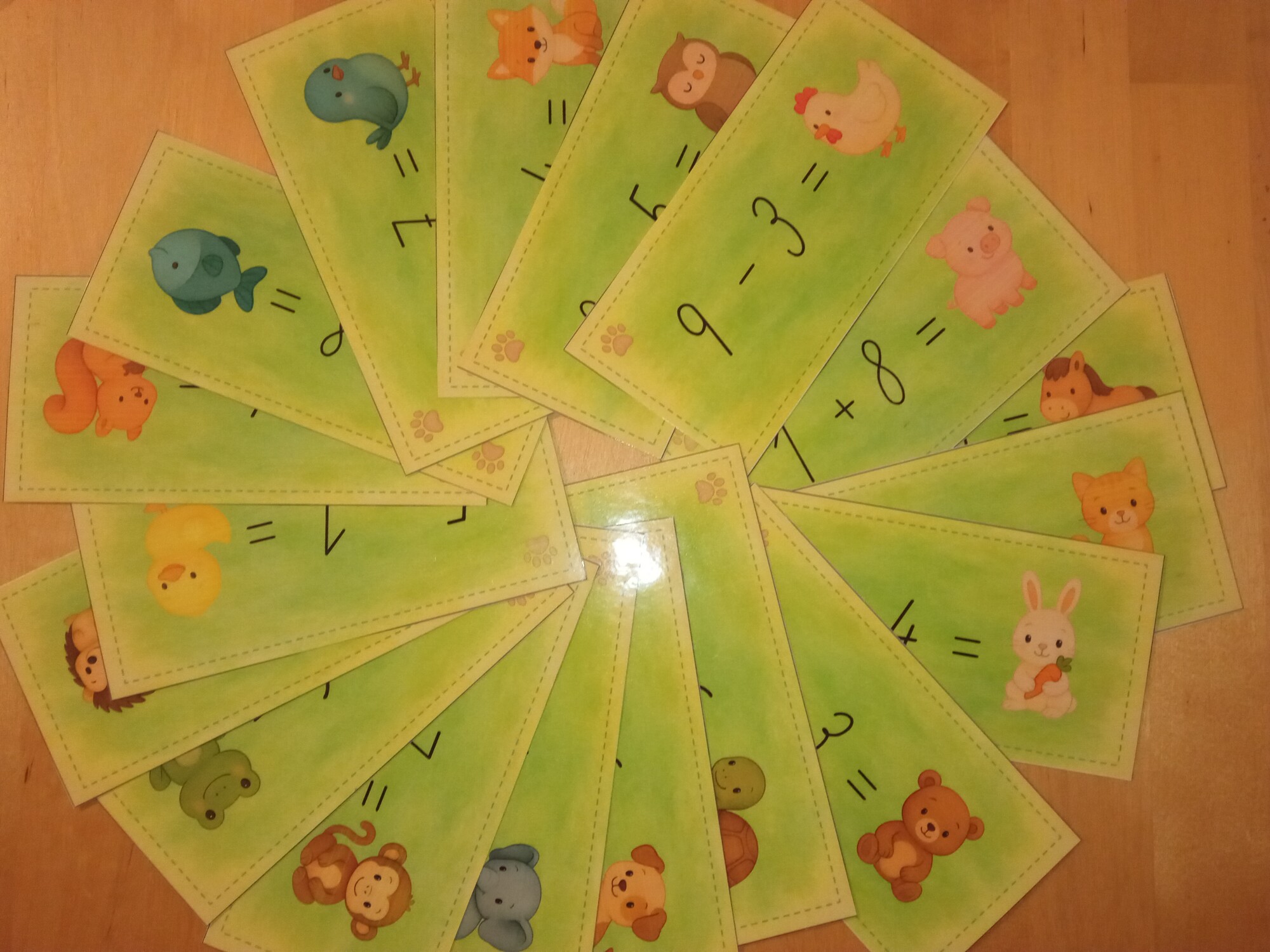 Kartičky s příklady rozmístíme ve třídě, na chodbě, na zahradě. Děti počítají a dopisují čísla do zápisového listu.