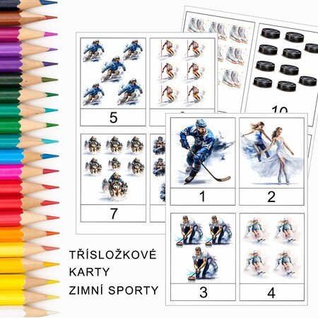 - TŘÍSLOŽKOVÉ KARTY - 10 obrázků (+ 2 náhradní obrázky) po 3 kartách (karta s obrázkem, karta s číslicí a kontrolní karta s obrázkem a číslicí)