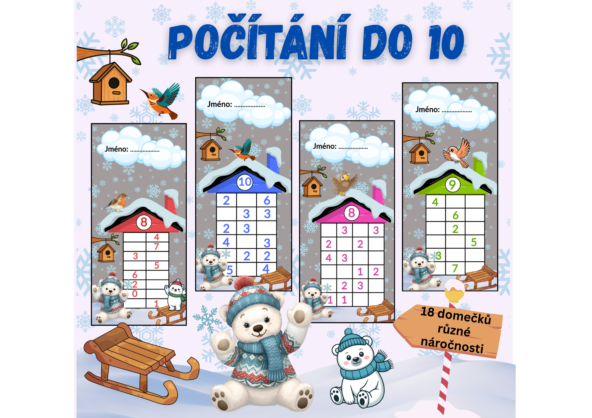 Materiál obsahuje 18 domečků různé náročnosti (na A4 jsou 3 domky), díky čemuž je vhodný pro diferenciaci práce ve třídě – od jednodušších příkladů až po náročnější kombinace.