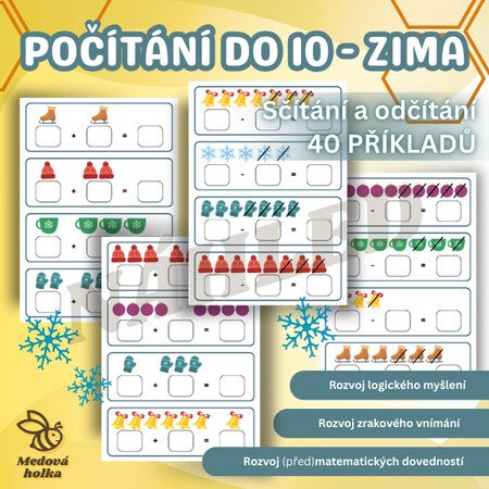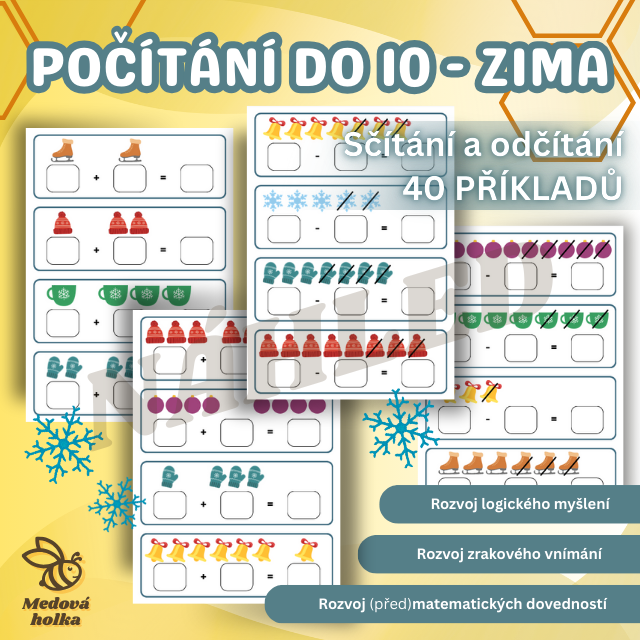 Tento zimně laděný soubor pracovních listů je určen pro děti v mateřských školách a mladší školáky, kteří si hravou formou procvičují sčítání a odčítání do 10. Materiál rozvíjí nejen rané matematické představy, ale také zrakové vnímání, logické uvažování a schopnost porovnávat množství.