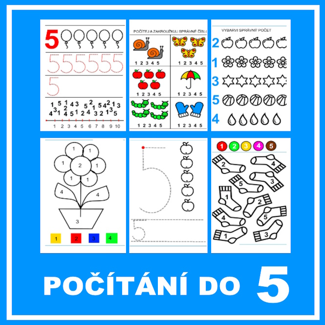 Psaní čísel od 1 do 5, číselné řady, hledání číslic, kartičky s obrázky a číslicemi na přiřazování, počítání, sčítání, skládanky, spojovačky, více/méně, omalovánky podle čísel.