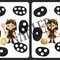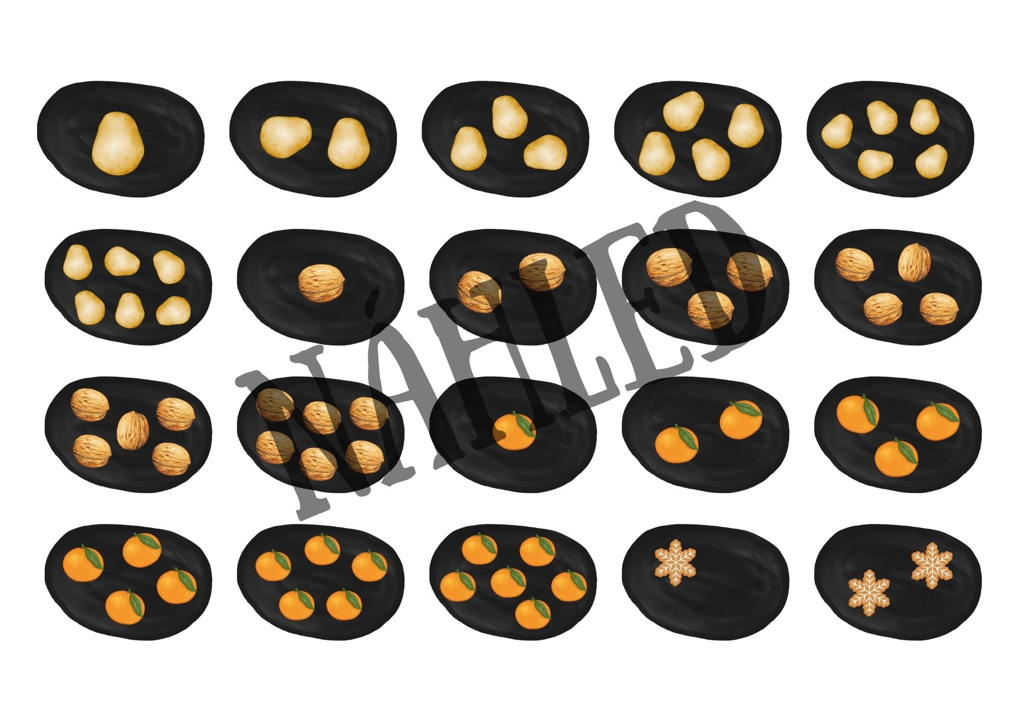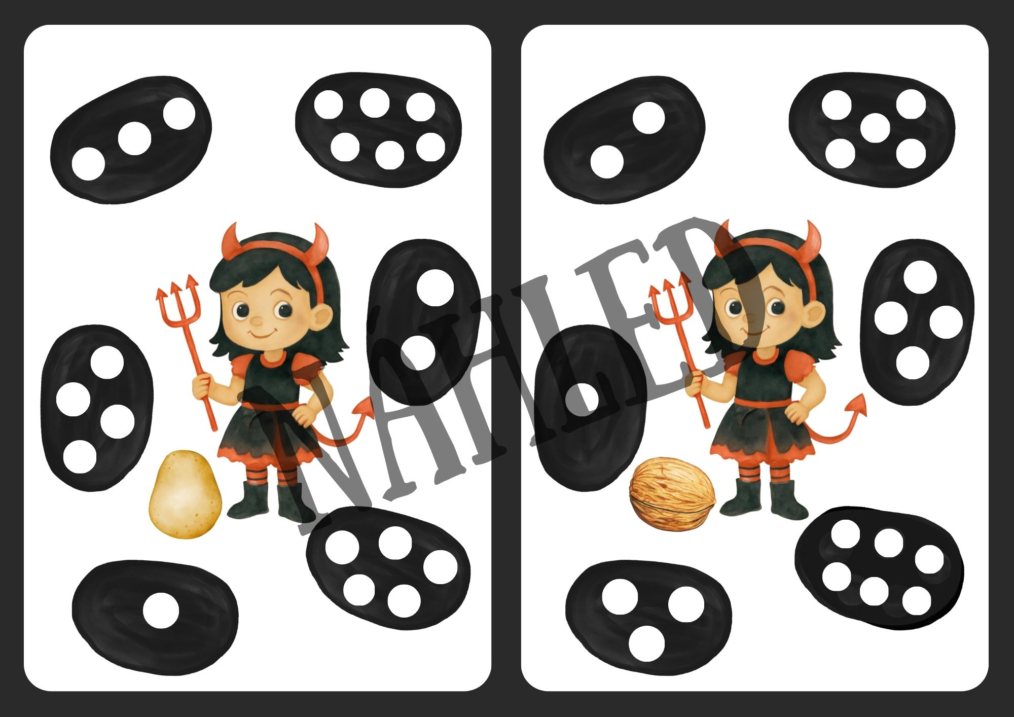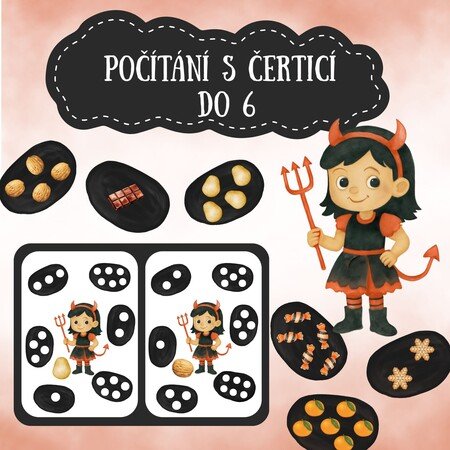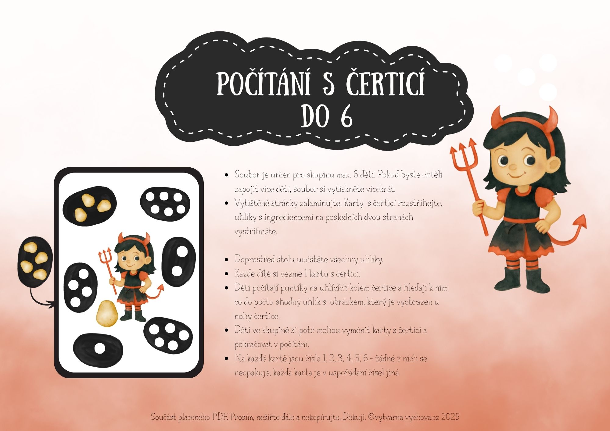 Soubor obsahuje 6 velkých karet A5 s čerticí a 36 uhlíků. Každá čertice má kolem sebe 6 uhlíků s puntíky od 1 do 6 (žádné číslo se na kartě neopakuje, každá karta má jiné uspořádání čísel). U každé čertice u nohy je obrázek (brambor, oříšek, mandarinka, perníček, bonbón, čokoláda). Děti přikládají na uhlíky s puntíky uhlíky s obrázkem shodující se počtem i obrázkem.
