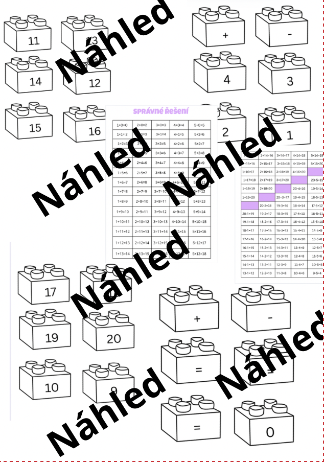 Postup při použití: Rozdejte žákům jednotlivě nebo do skupinek. Žáci vedle sebe skládají kostičky tak, aby jim vyšel příklad se správným výsledkem. Mohou se skládat jednoduché, složené příklady nebo delší hadovité příklady. Limituje vás jen počet vytisklých sad kostiček. Jednoduché příklady si žáci sami zkontrolují podle výsledkových listů.