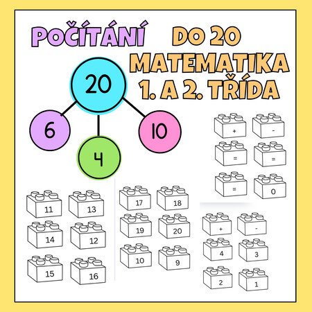Materiál obsahuje kostky s čísly od 0 do 20, kostky se znaménky +, -,=