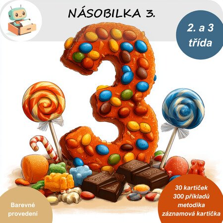 Výukový materiál zaměřený na procvičování násobilky 3 vhodný pro žáky 2. a 3. ročníku ZŠ. Obsahuje 30 kartiček po 10 příkladech na násobení i dělení, které pomáhají upevnit početní dovednosti a rozvíjejí samostatnost žáků.