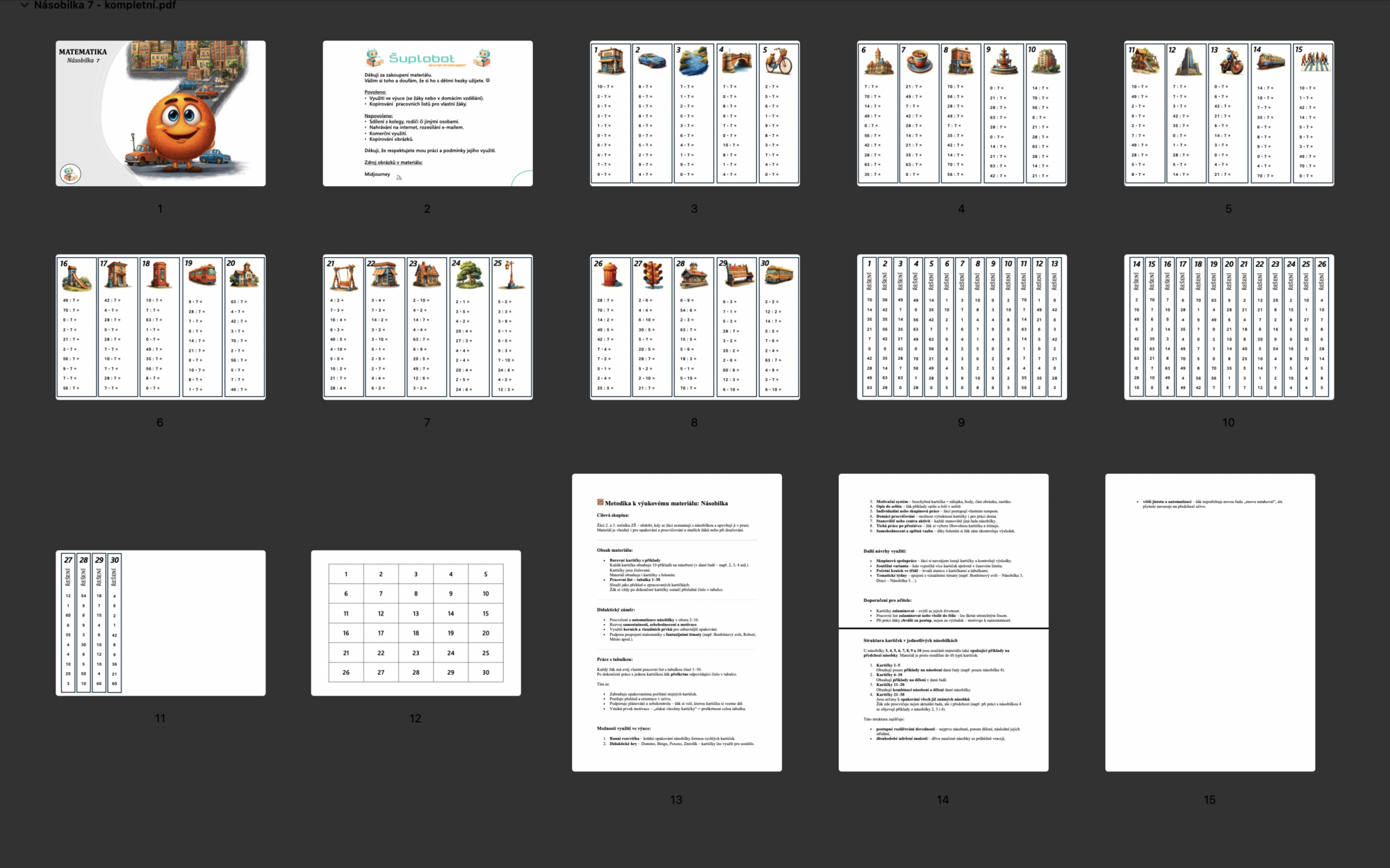 Výukový materiál zaměřený na procvičování násobilky 7 vhodný pro žáky 3. a 4. ročníku ZŠ. Obsahuje 30 kartiček po 10 příkladech na násobení i dělení, které posilují jistotu v početních operacích a rozvíjejí samostatnost žáků.
