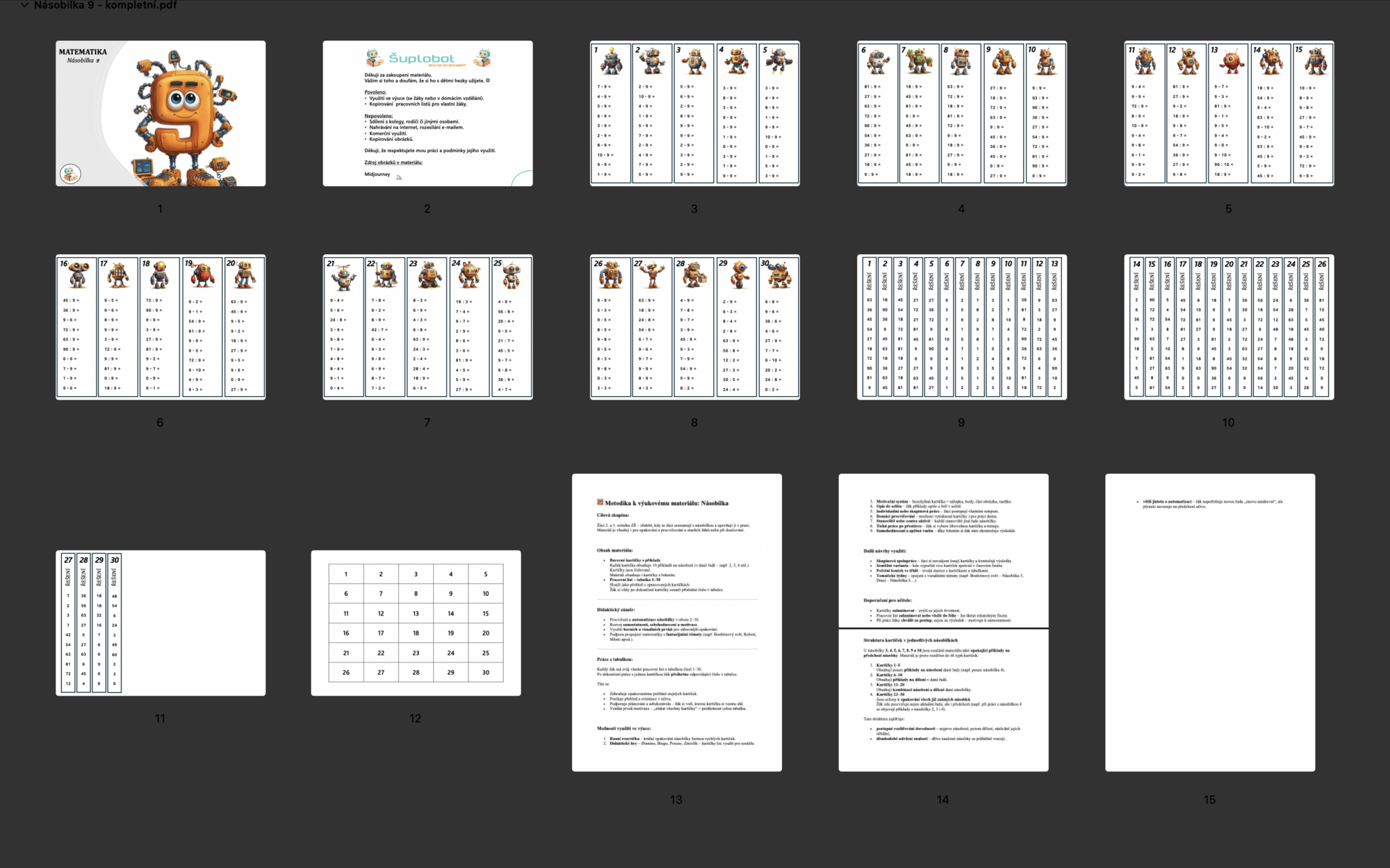 Materiál zaměřený na procvičování násobilky 9 obsahuje 30 kartiček po 10 příkladech na násobení a dělení. Žáci díky nim posilují početní jistotu, přesnost i samostatnost při práci.