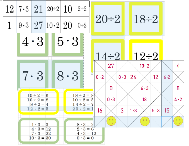 - Pexeso (násobení, dělení 2 a 3 - 2 x 44 kartiček): Rozlišené odstíny barev pro násobení a dělení. Lze hrát samostatně pro jednu početní operaci, mix násobení a dělení ve stejném oboru – 2 nebo 3, nebo jako velký mix.