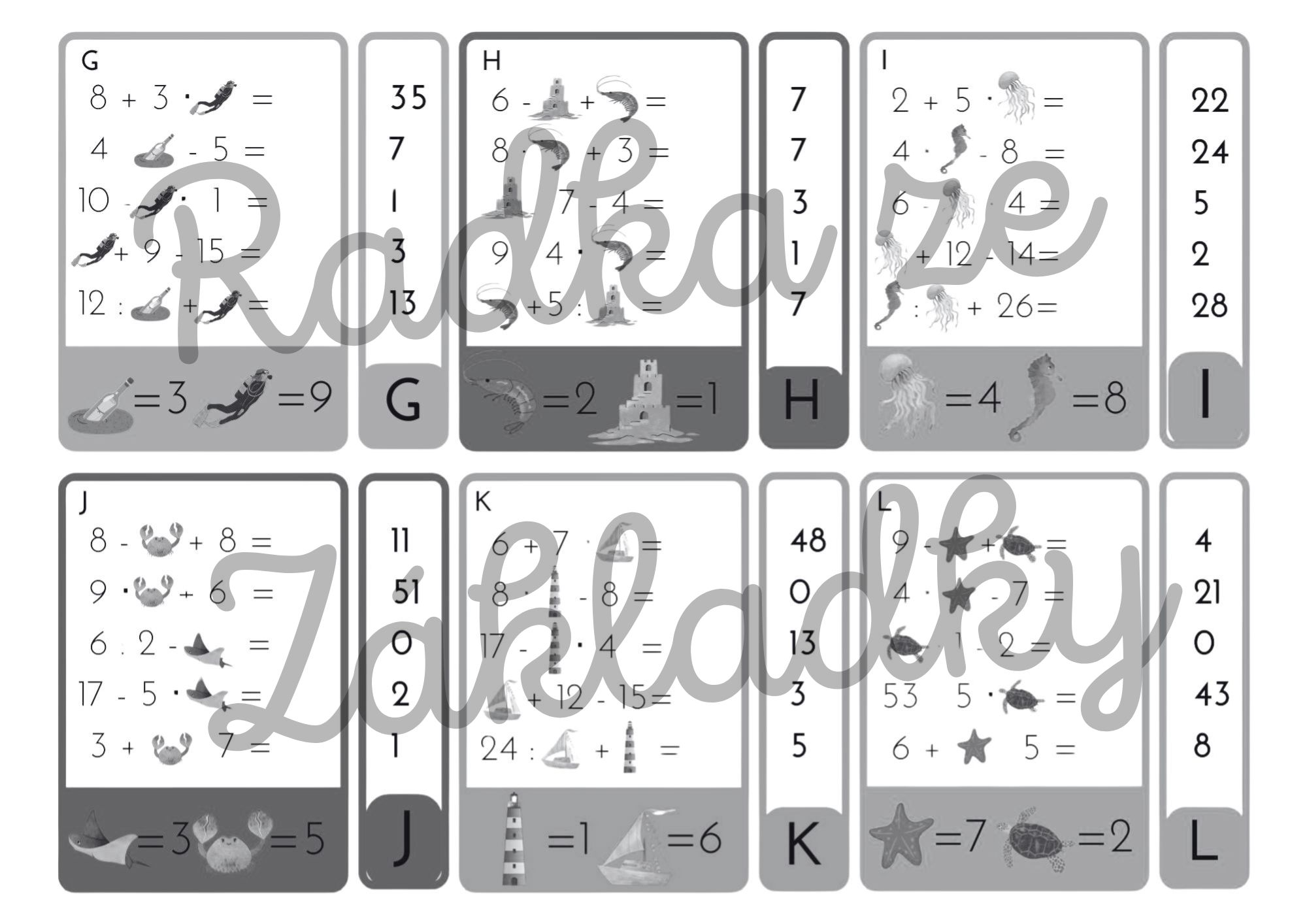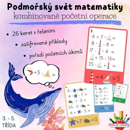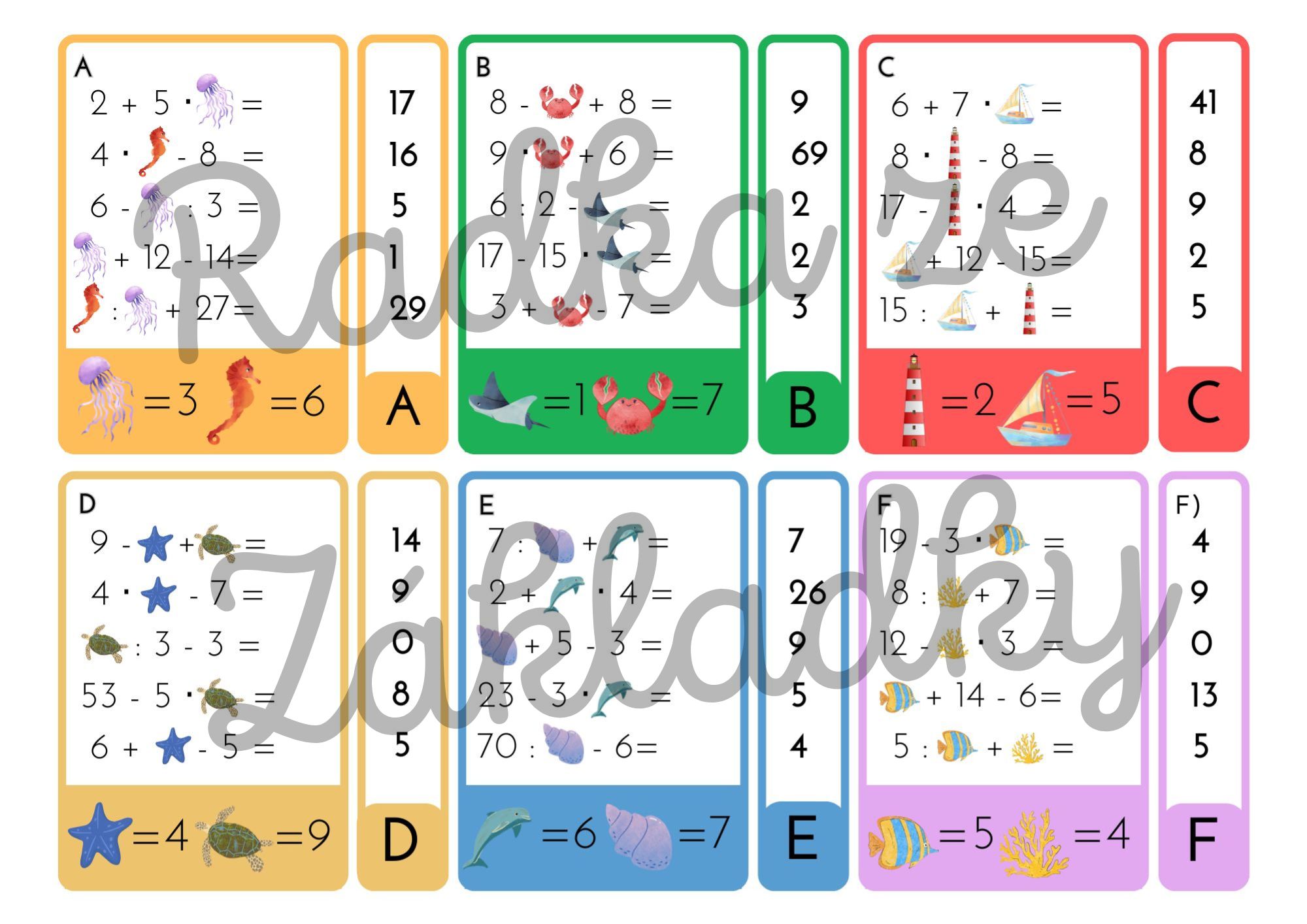 - na každé kartičce jsou příklady propojené s obrázky z podmořského světa,