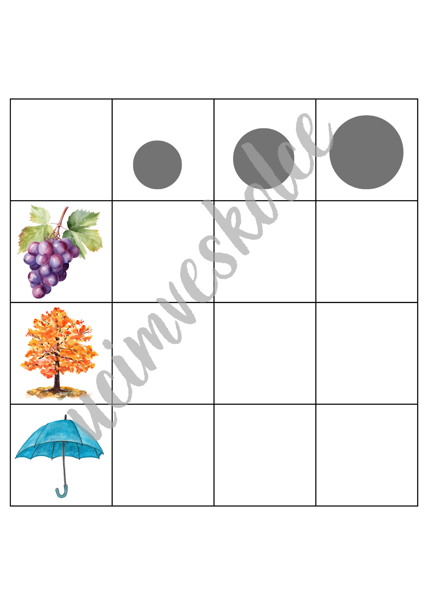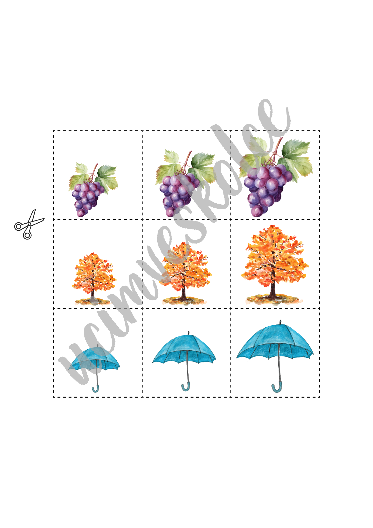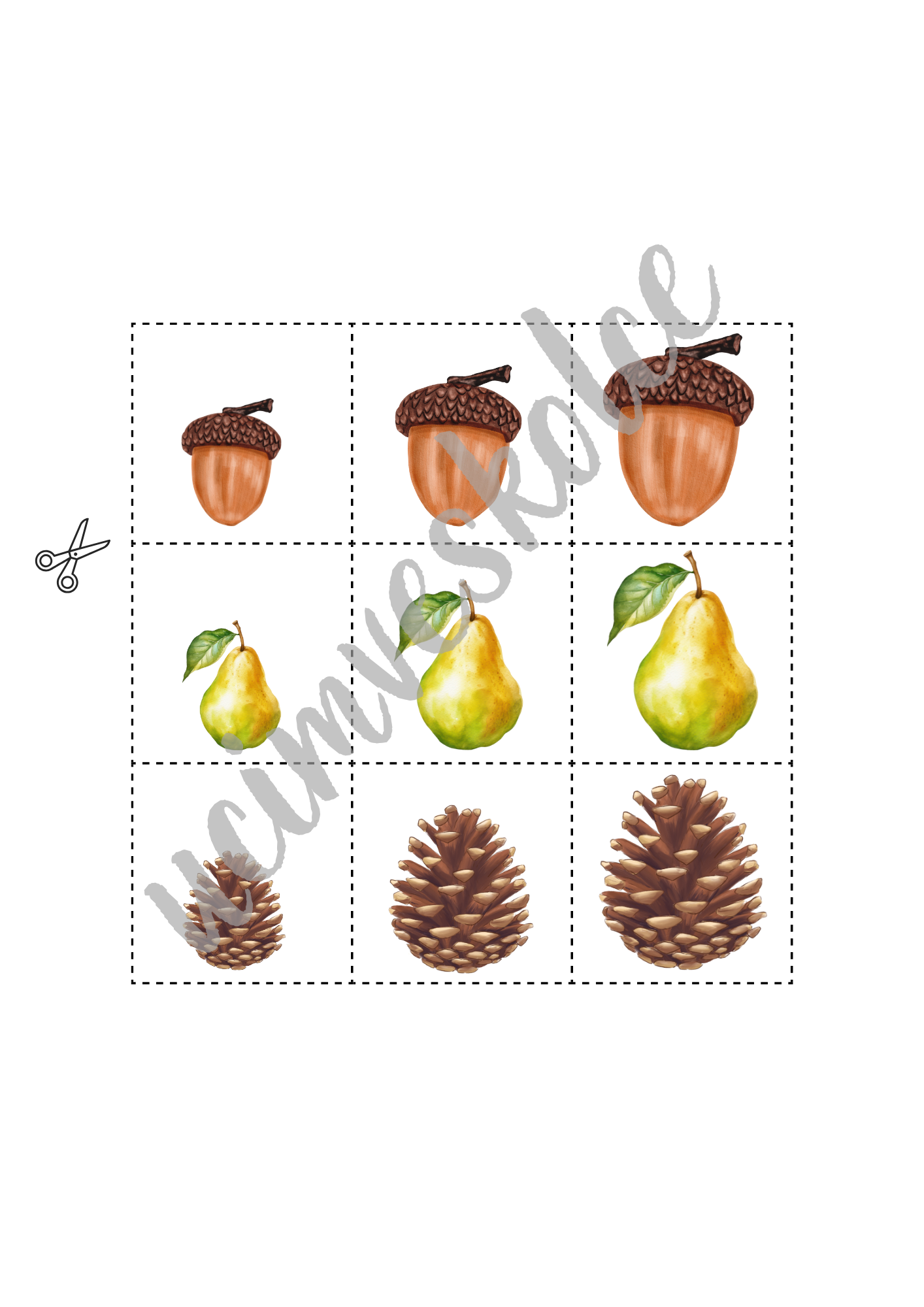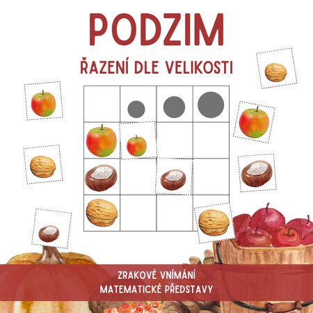 Tematický soubor "PODZIM - řazení dle velikosti"obsahuje 10 tabulek + 90 kartiček s obrázky určených k rozvoji matematické pregramotnosti.
