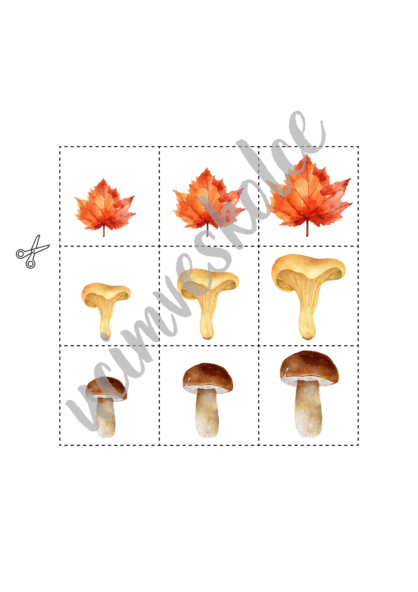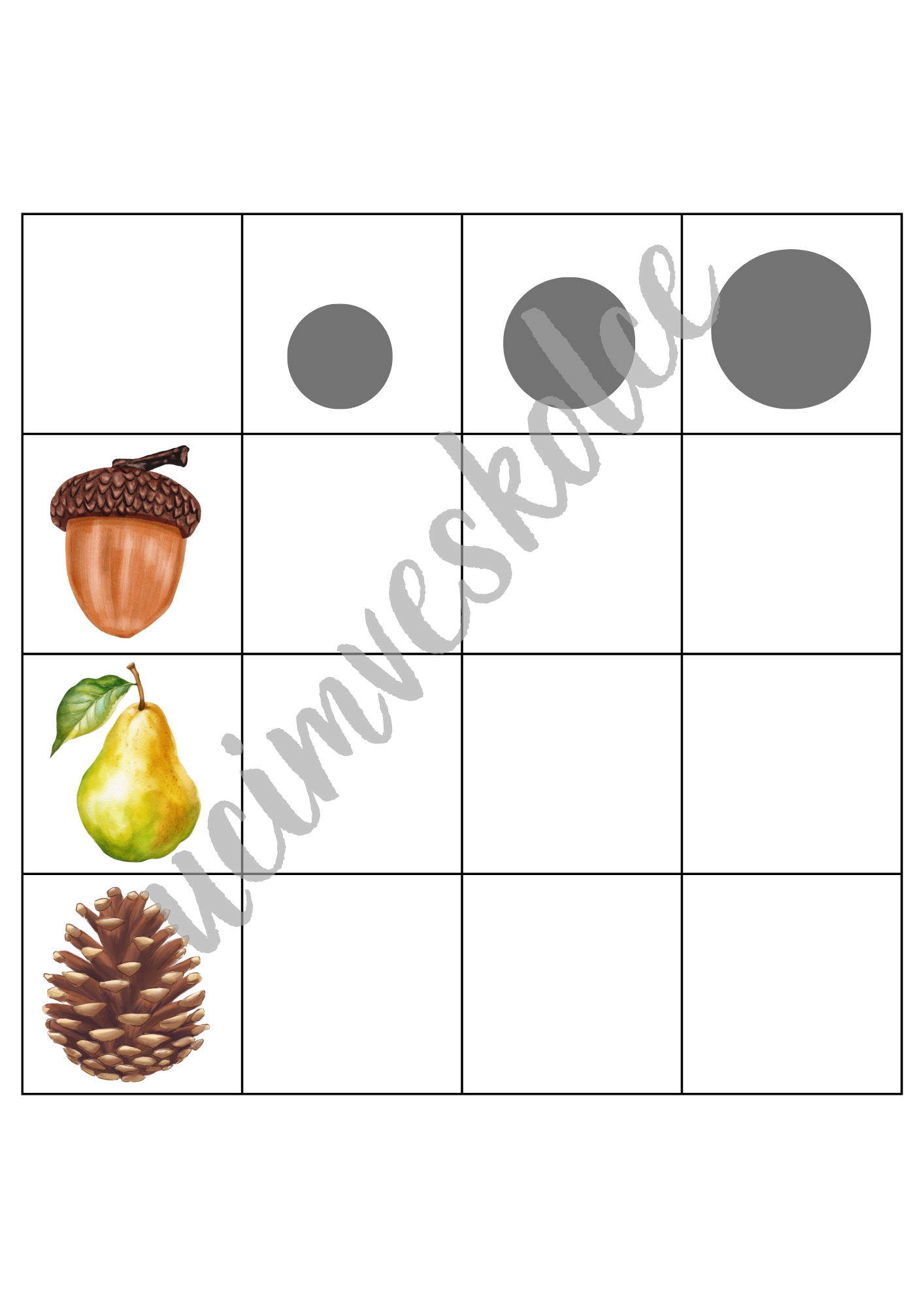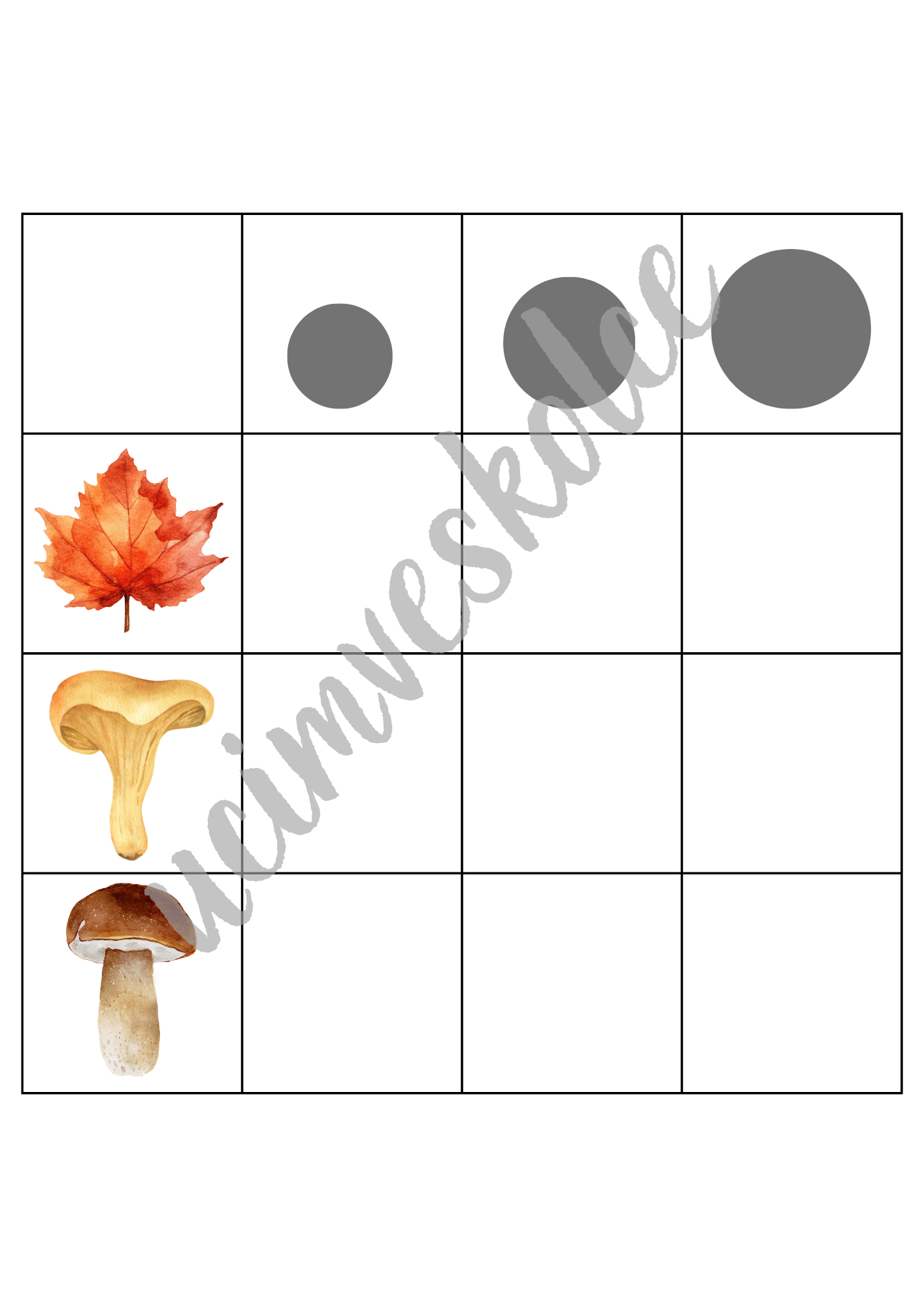 Tematický soubor "PODZIM - řazení dle velikosti"obsahuje 10 tabulek + 90 kartiček s obrázky určených k rozvoji matematické pregramotnosti.