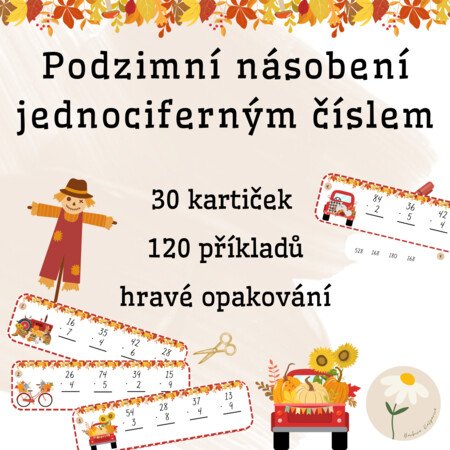 Materiál obsahuje 30 kartiček s příklady, celkem zde naleznete 120 různých příkladů na násobení. Z druhé strany je kontrolka.