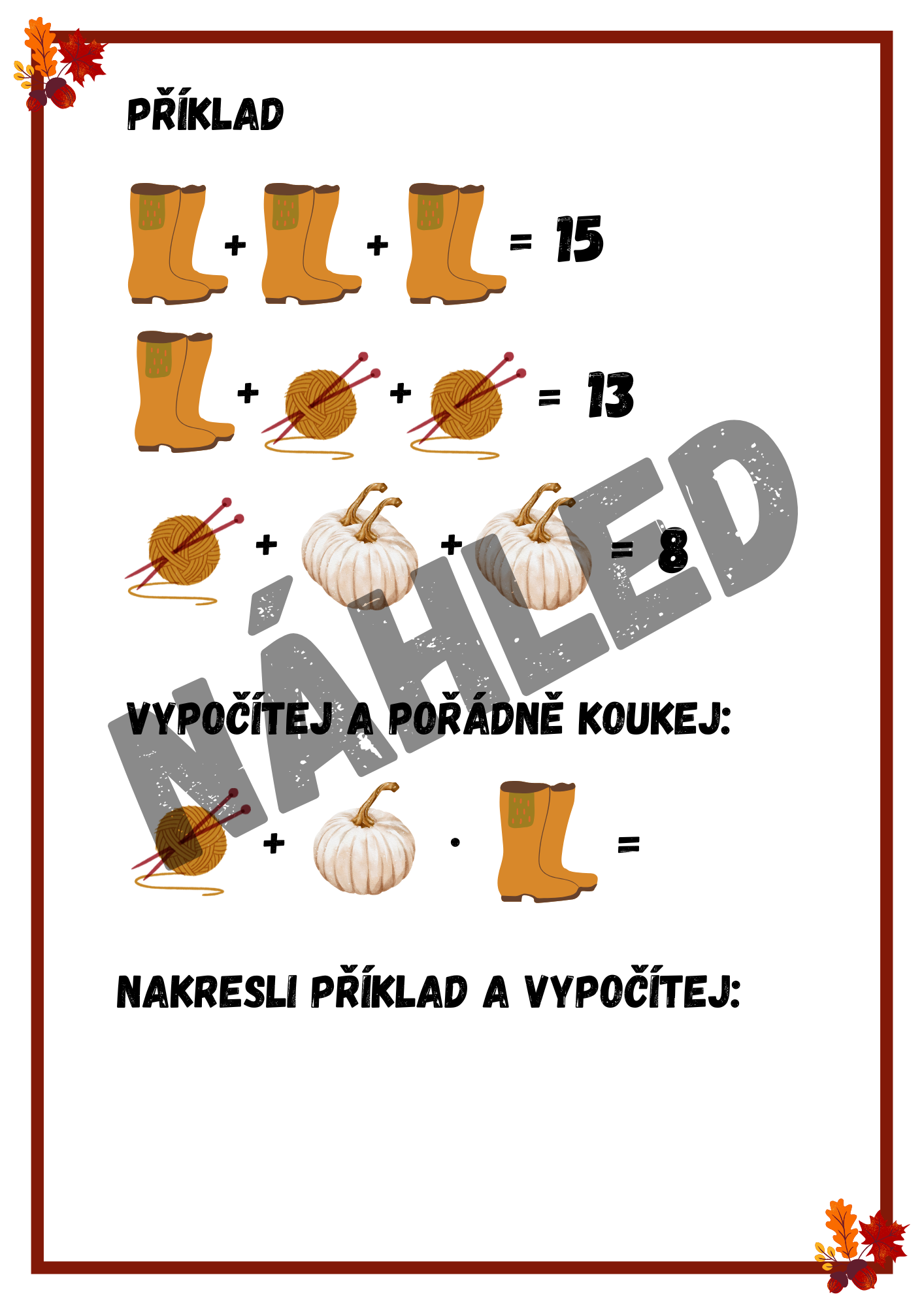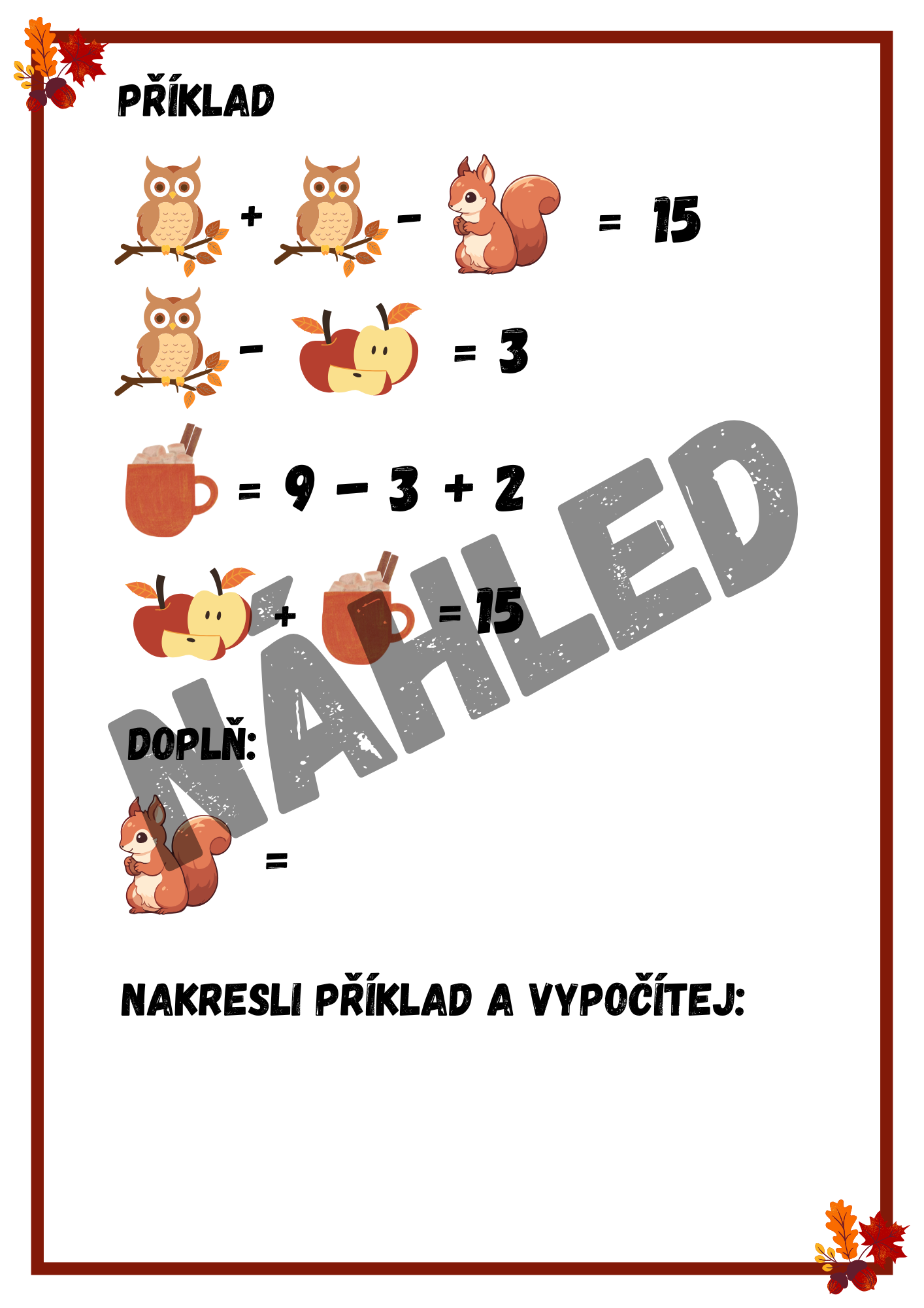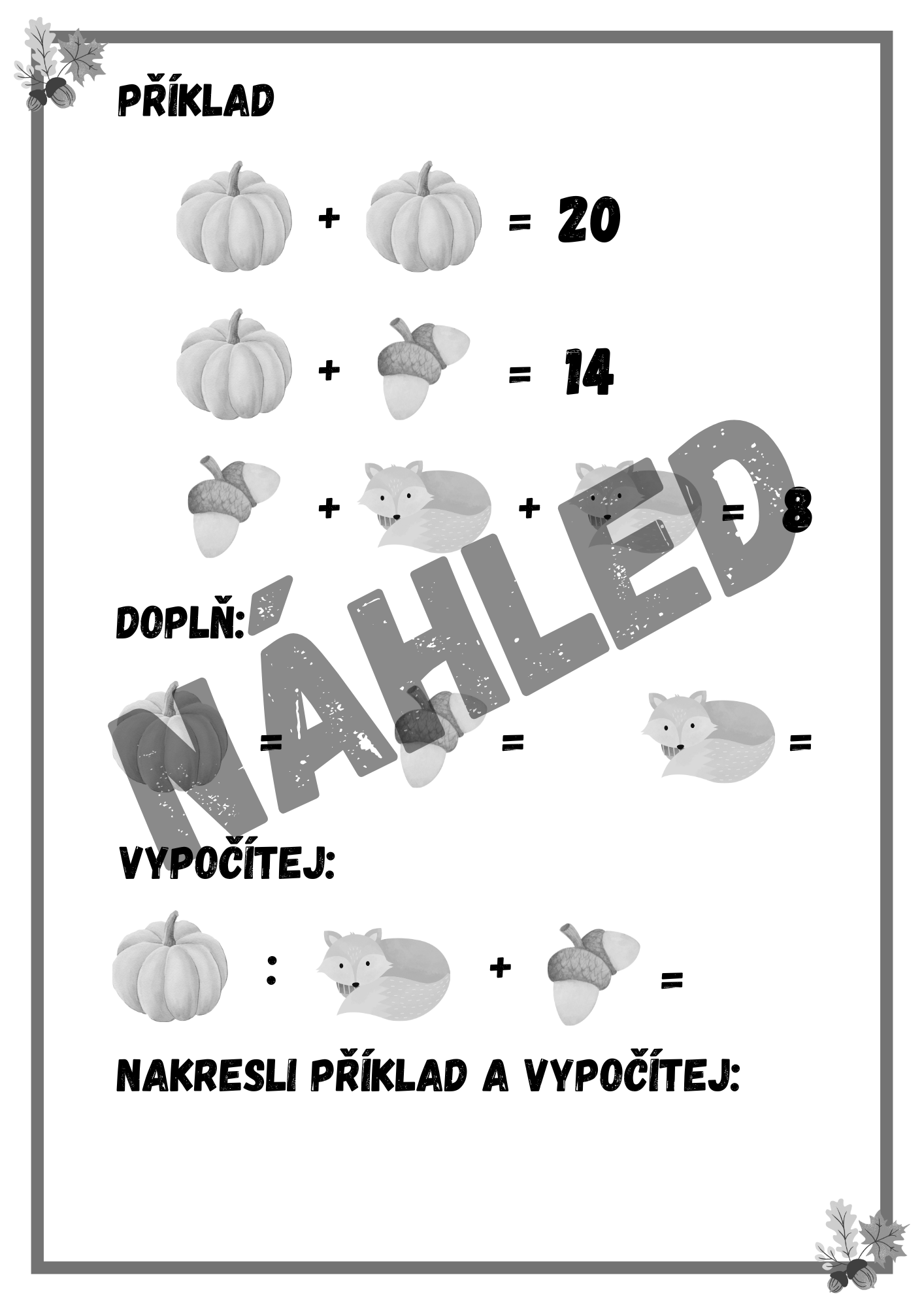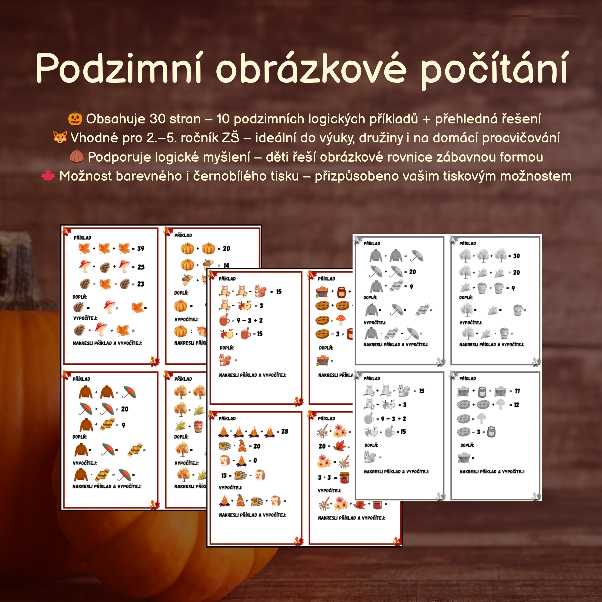 Tento originální pracovní materiál s podzimní tematikou je skvělým doplňkem výuky pro žáky 2.–5. ročníku ZŠ. Obsahuje 10 zábavných logických úloh, ve kterých děti řeší obrázkové rovnice s dýněmi, liškami a žaludy. Procvičí si nejen počítání, ale i logické uvažování a dedukci – zcela nenásilnou a hravou formou.