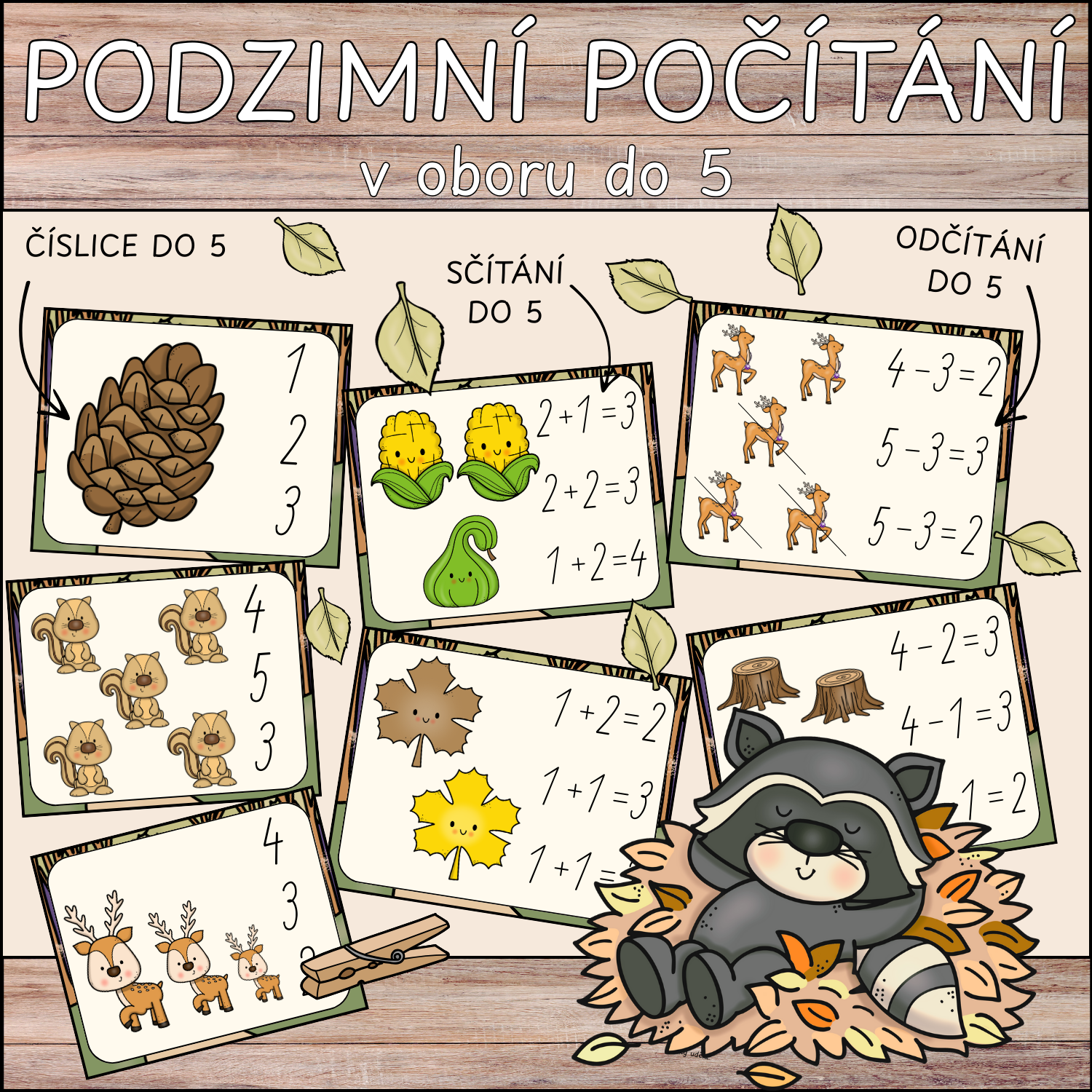 60 kartiček s podzimní tematikou, které jsou zaměřeny na procvičování počítání v oboru čísel do 5. Kartičky jsou určeny ke kolíčkování – žáci určují počet do 5 a označují správnou číslici, případně procvičují sčítání a odčítání.