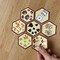 Na každé straně je 7 šestiúhelníků - každý složený obrazec obsahuje počet znázorněný číslicí, počet znázorněný počtem na kostkách, počet vyjádřený počtem prstů a 4 další způsoby vyjádření daného počtu.