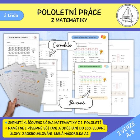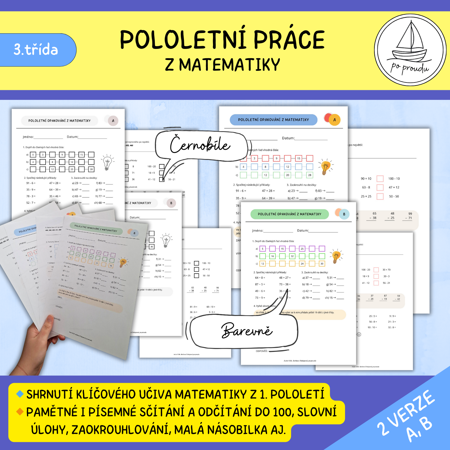 Upozornění: Pololetní práci z matematiky pro 3. třídu lze zakoupit také v balíčku s pololetní prací z ČJ a sebehodnocením za 1. pololetí. Obsah materiálu je shodný s verzí obsaženou v balíčku.