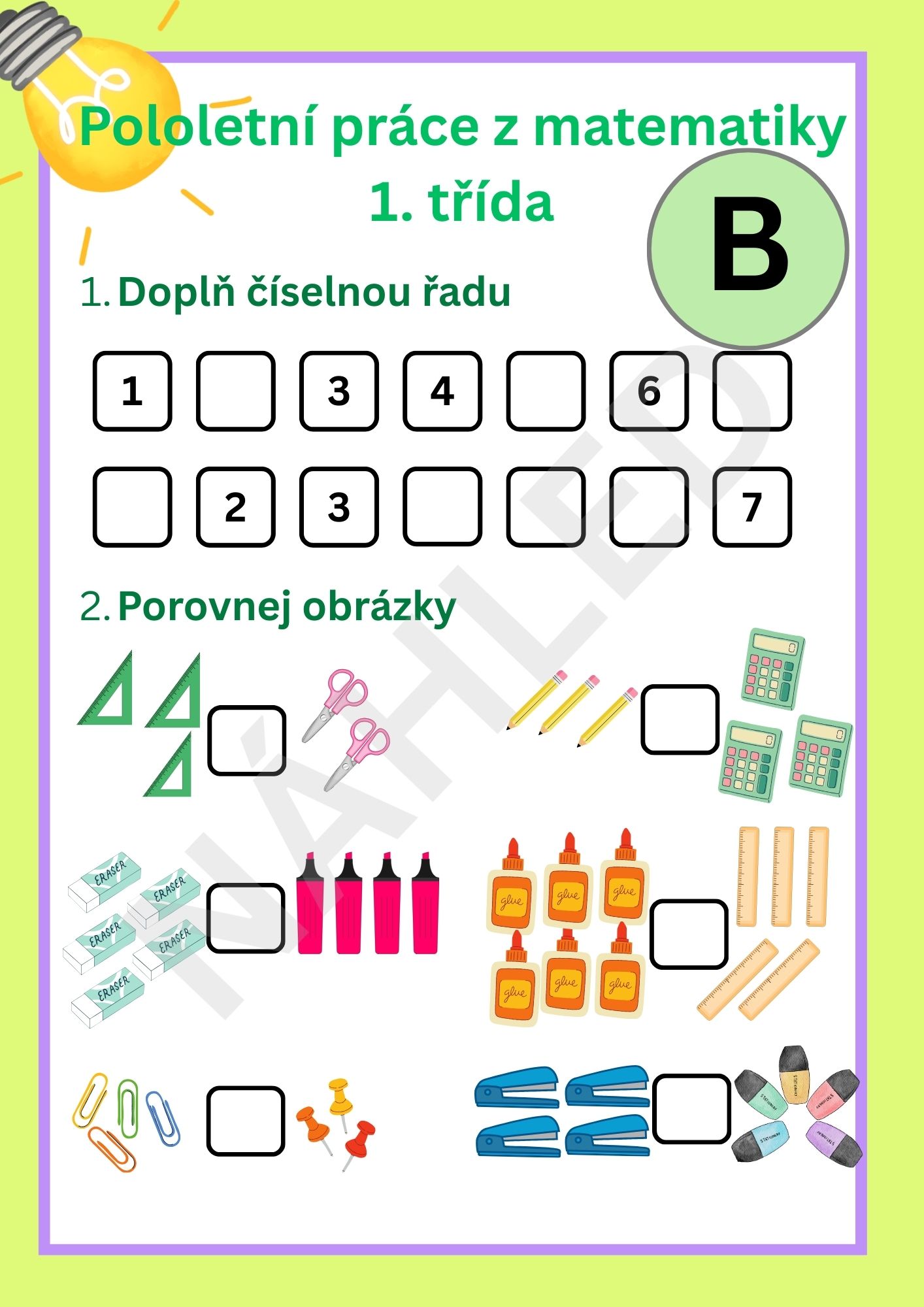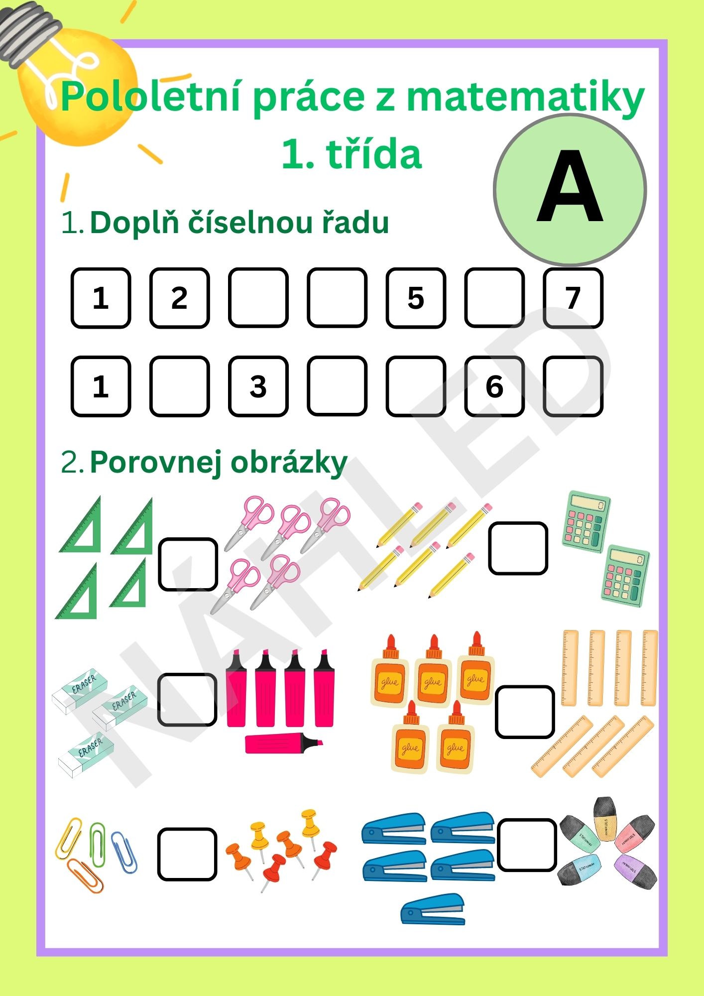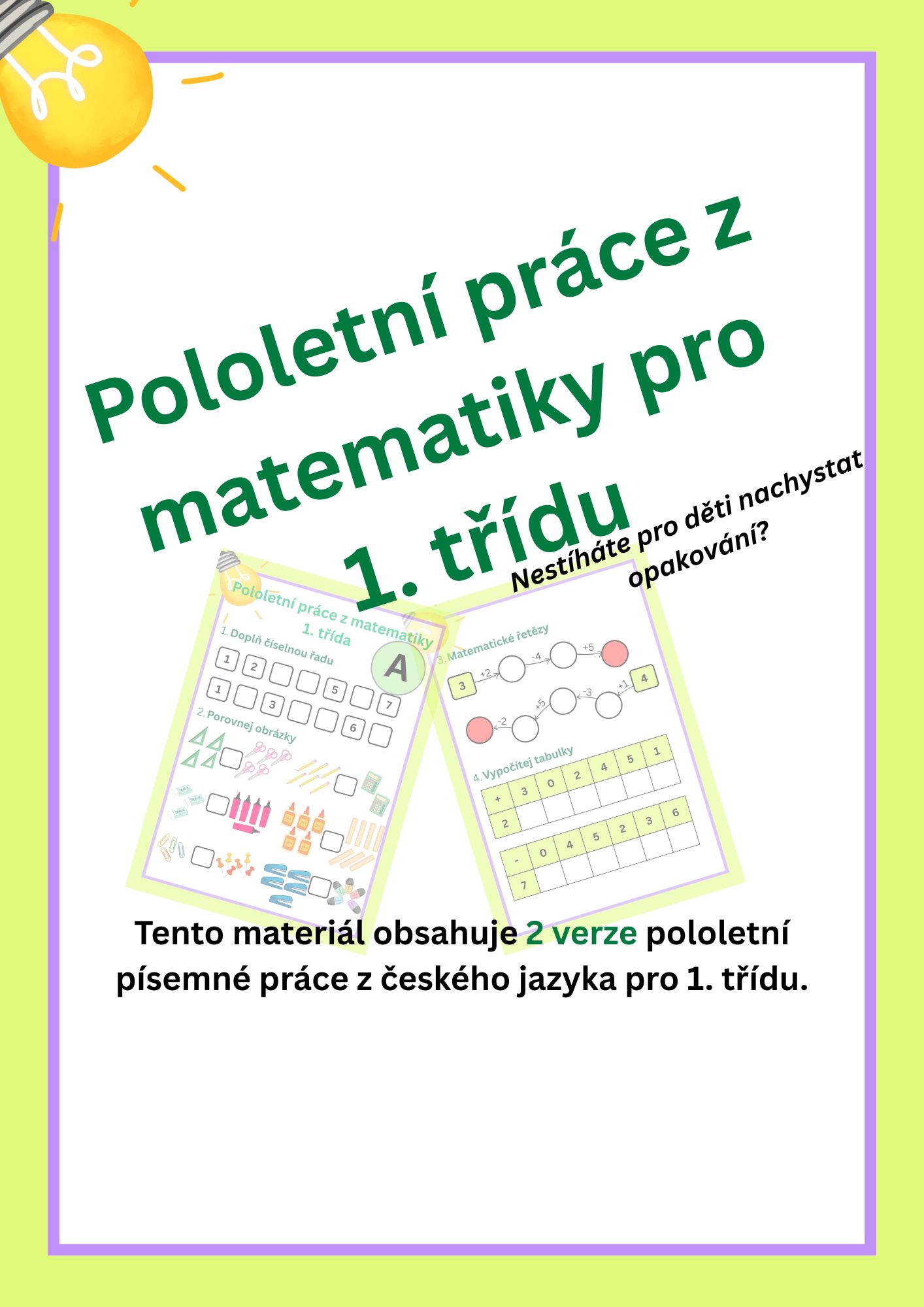 Tento materiál obsahuje pololetní písemnou práci z matematiky pro děti v 1. třídě. Materiál obsahuje 2 verze testíku.