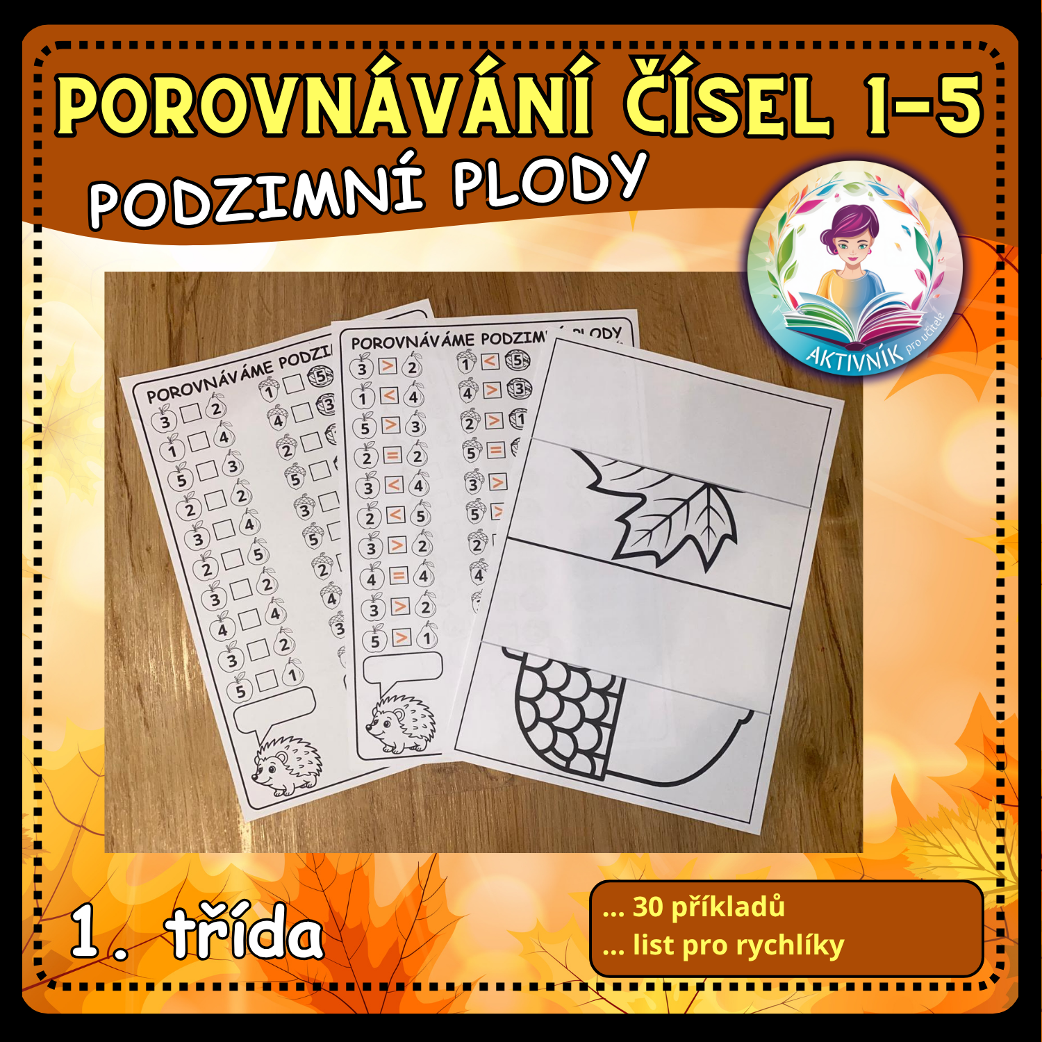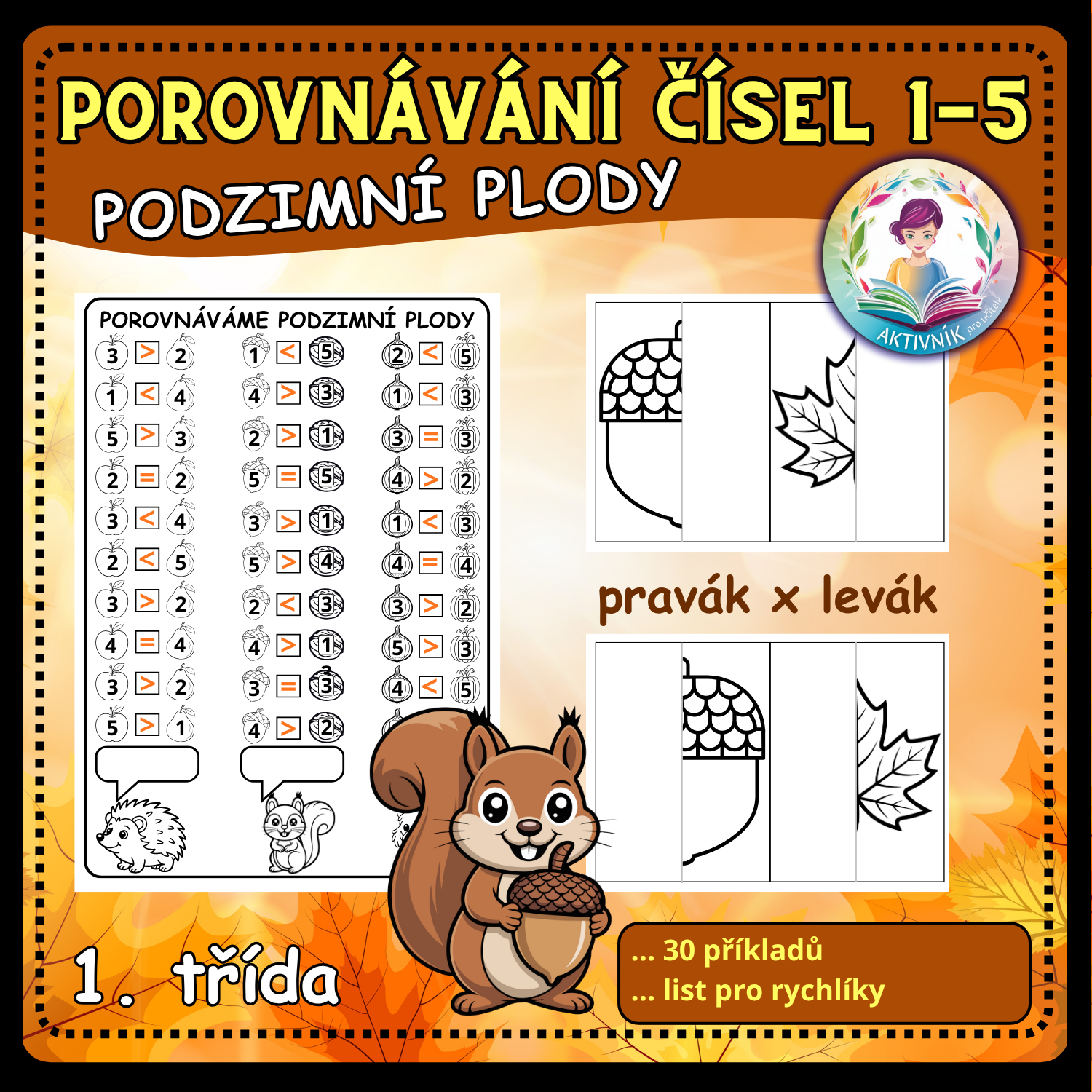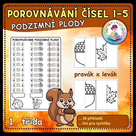 Pracovní list slouží k procvičování porovnávání čísel 1-5 s podzimní tématikou. Žáci doplňují a porovnávají číslice v obrázcích podzimních plodů. Po správném vyřešení sloupce si vybarví zvířátko.