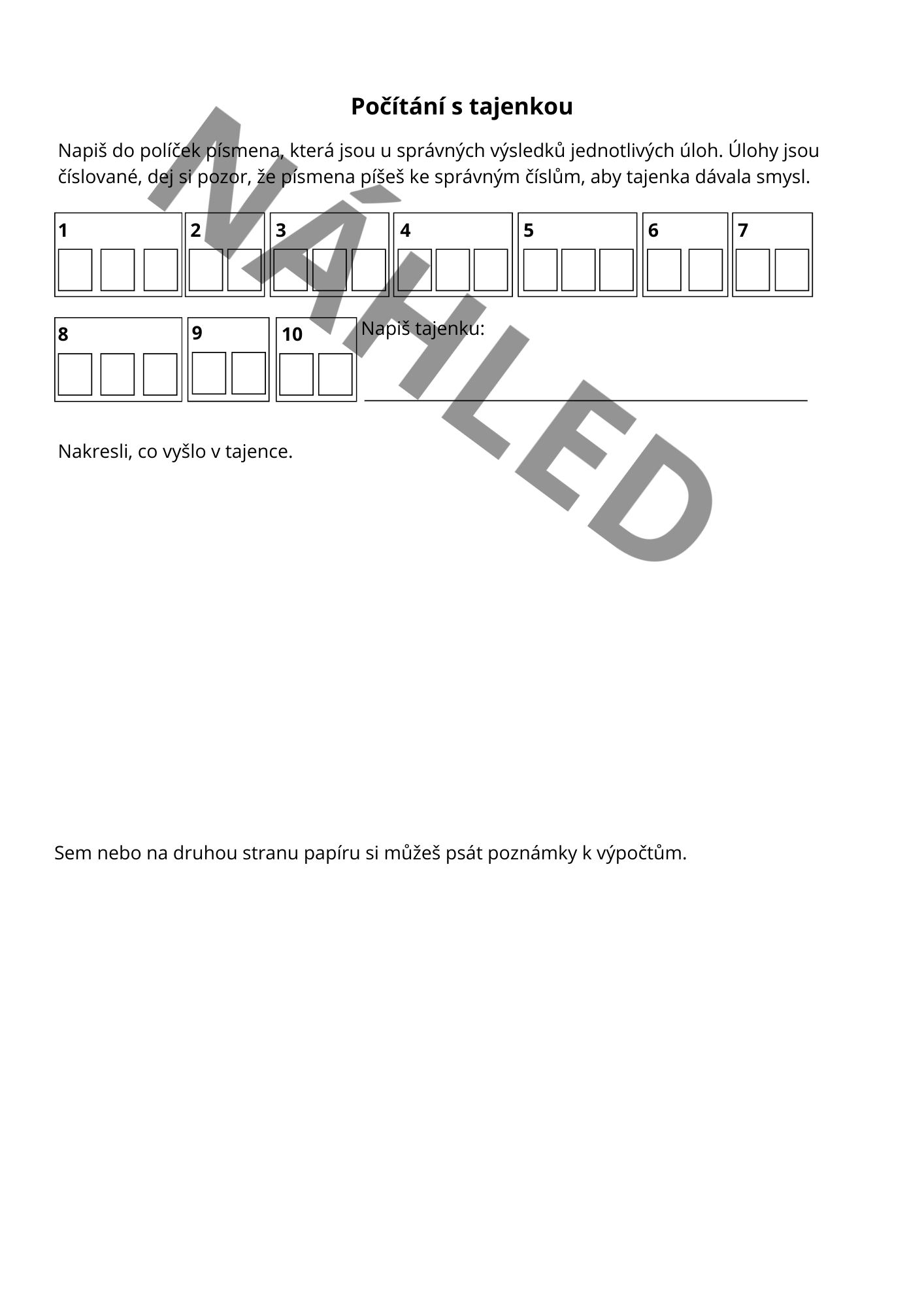 - Po vypočítání úlohy si žáci na kartě najdou správný výsledek. Do pracovního listu zaznamenají písmena patřící ke správnému výsledku.
