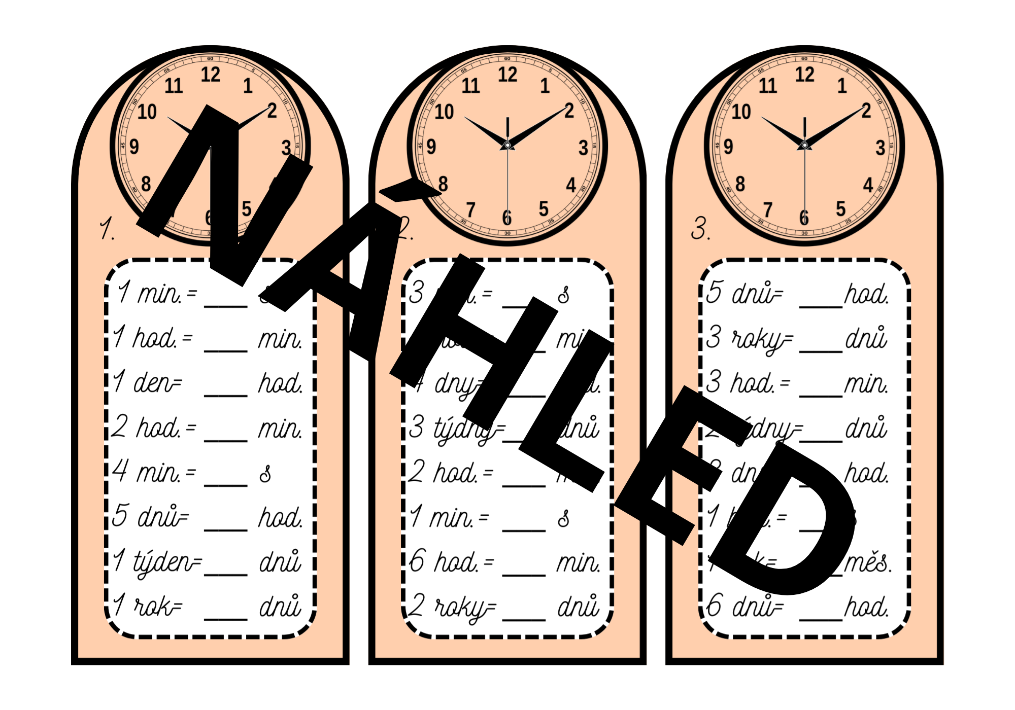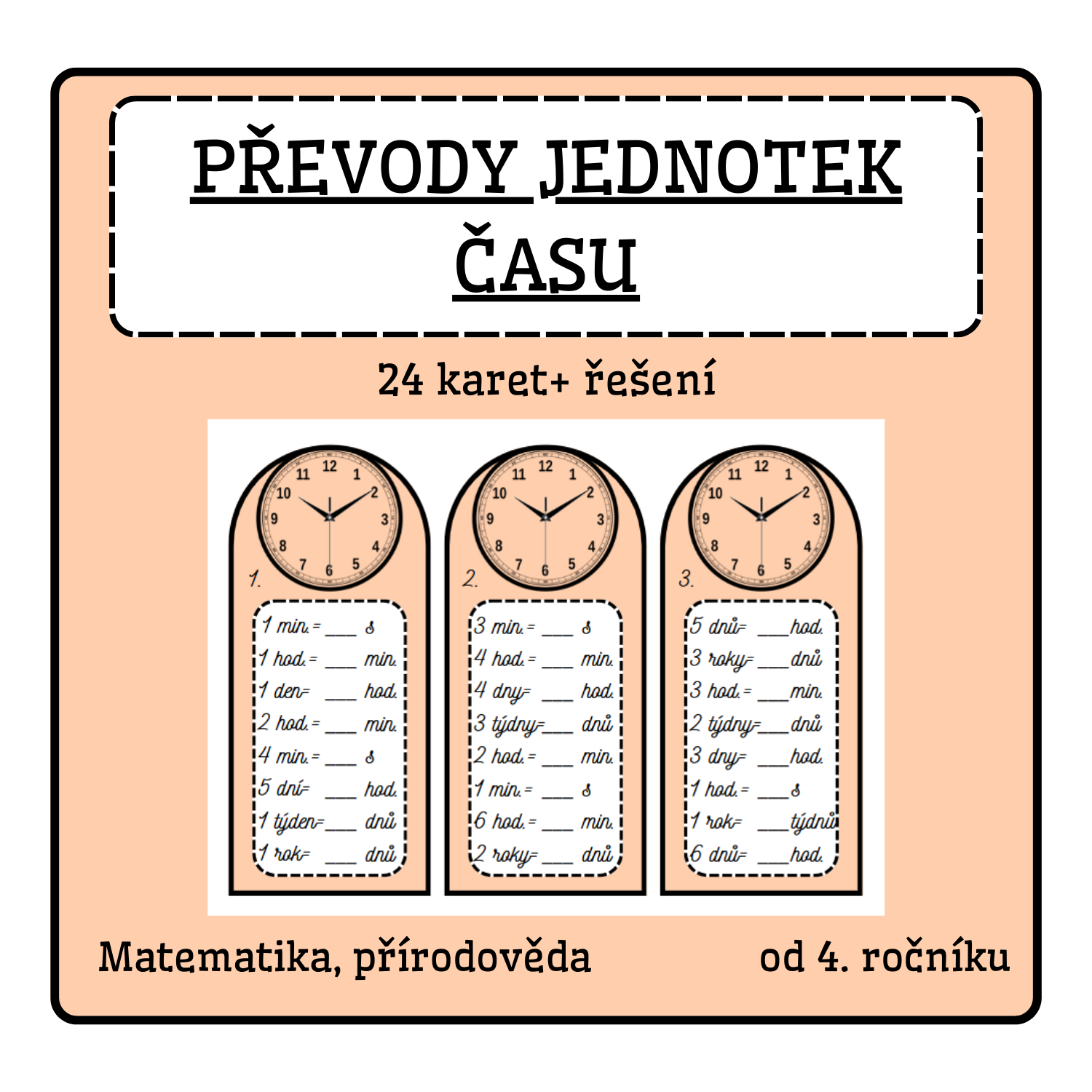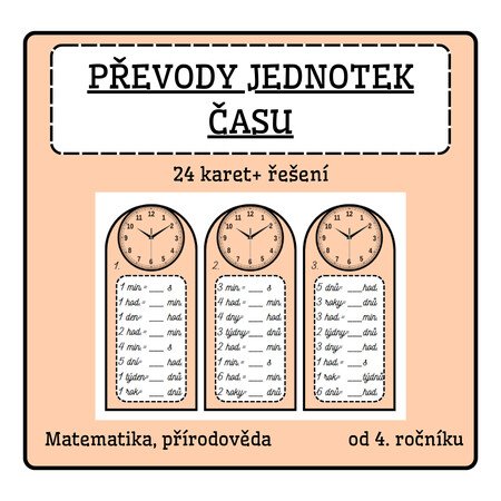 Materiál je vhodný k procvičení převodů jednotek času v hodinách matematiky a přírodovědy především ve 4.-5. ročníku. Součástí materiálu je 24 karet po 8 převodech (na sekundy, minuty, hodiny, dny, týdny, měsíce, roky). K dispozici je i ŘEŠENÍ ke kontrole či samokontrole.